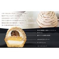 バタータルトカップにチーズアパレイユを敷き、味のアクセントにチーズの風味を漂わせ、ふわふわのロールケーキの上に生クリームをからませ、その上に選りすぐりの和栗の渋皮煮を乗せ、栗本来の風味際立つ和栗のペーストクリームを巻いたモンブランです。