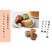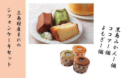 黒島みかんの果肉と皮が贅沢に入っているシフォンケーキと、黒島の大自然の中で育つよもぎがふんだんに入っているふわふわもっちりとしたシフォンケーキ、子供も大好きなココア味のシフォンケーキの3点セットをご賞味ください。