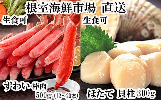 ふるさと納税 カニ ずわいガニ 北海道 根室市 B-14124 お刺身可 生ずわいがに棒肉ポーション500g(12〜20本)、刺身用ほたて貝柱300g