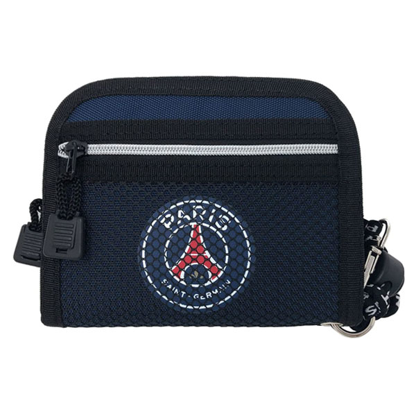 パリサンジェルマンのエンブレム入りウォレット。ポケット多数で機能性抜群。首から下げられるストラップ付き