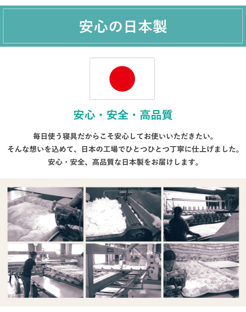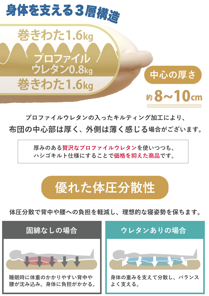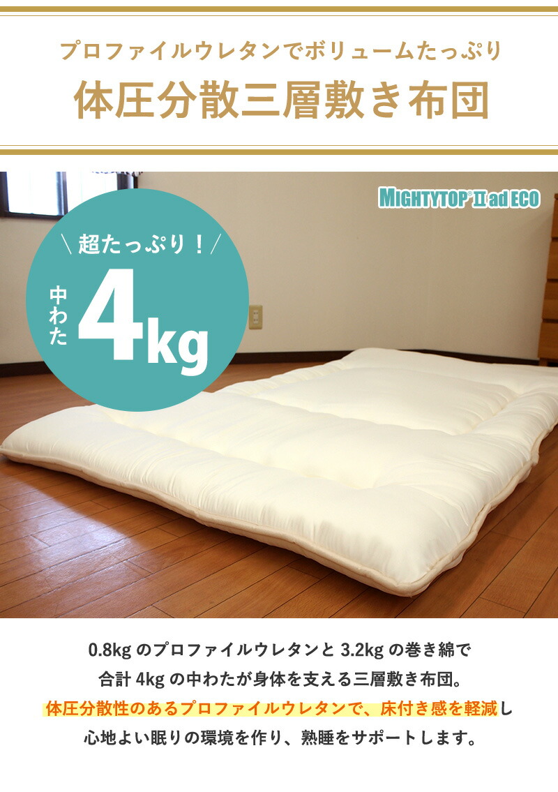 | 中わた重量 | 中芯0.8kg(プロファイルウレタン)、巻わた3.2kg(マイティトップ(C)2adECO) 敷き布団合計4.0kg |
