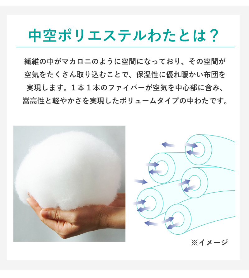 | 組成 | 側生地:ポリエステル100% 中わた:中空ポリエステル100%(マイティトップ(C)2adECO テイジンブランドわた) |