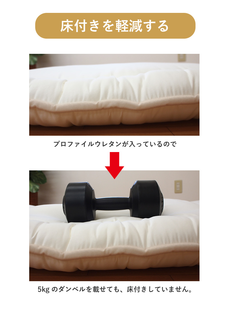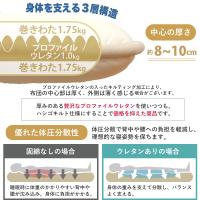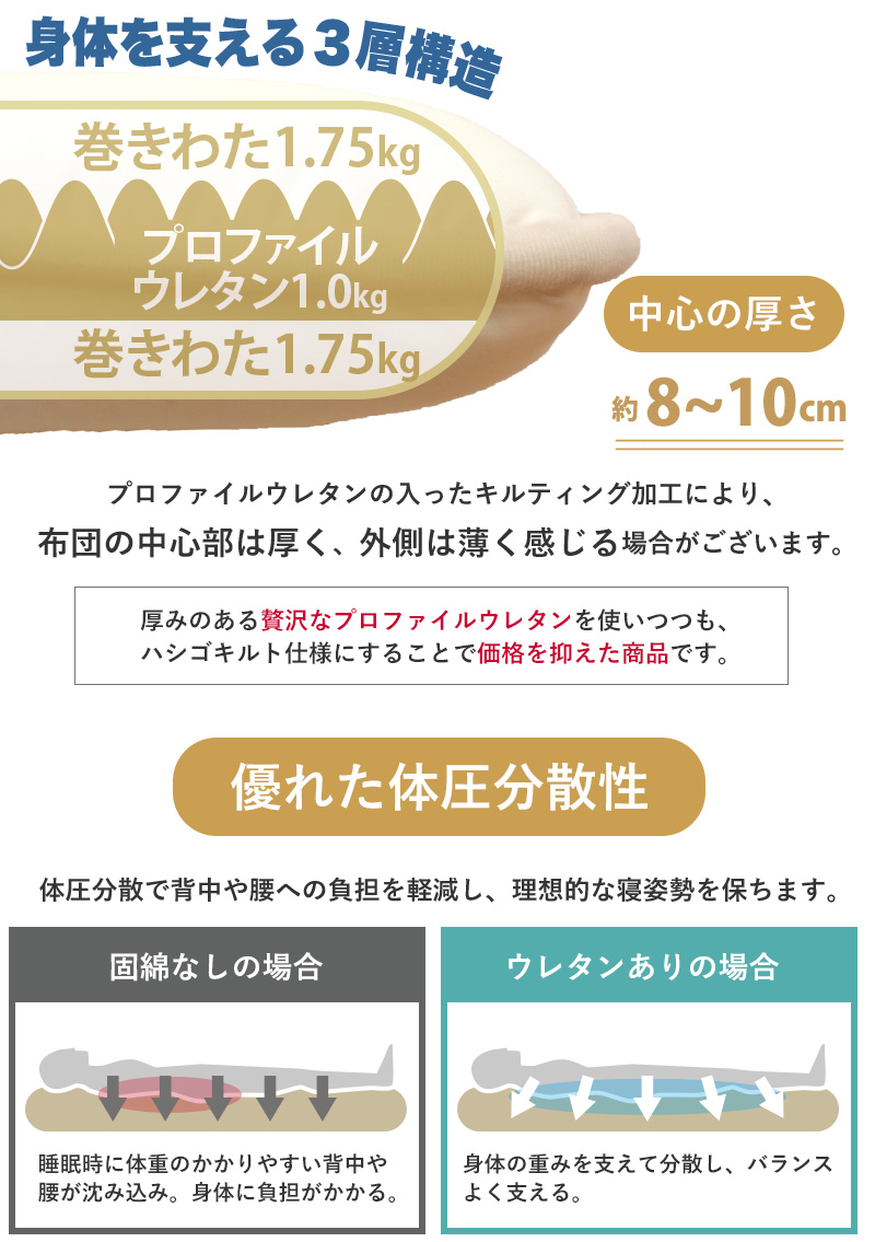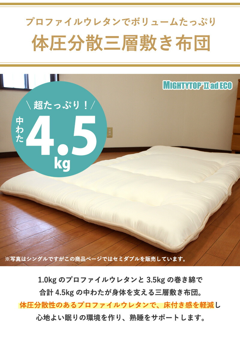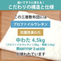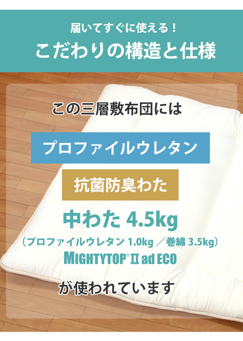 | 中わた重量 | 敷き布団合計4.5kg 内訳/1.0kg(プロファイルウレタン)、巻わた3.5kg(マイティトップ(C)2adECO) |