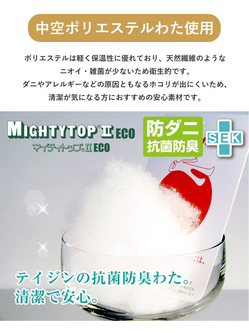 | 組成 | 側生地:ポリエステル100% 中わた:中空ポリエステル100%(マイティトップ(C)2adECO テイジンブランドわた) |