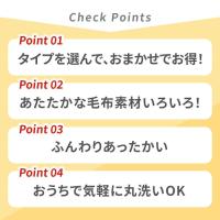 | ・タイプを選んで、おまかせでお得! 色柄をおまかせにすることで、生地や仕分けのコストを抑えました!無地タイプ or 柄入りタイプを選んで、お得にお買い求めいただけます。 ・あたたかな毛布素材ふわさらフランネルタッチや、なめらかなファー素材など、冬に心地よい素材をたっぷりまとめて仕入れました。寒さ対策にぴったりの一枚です。 ・ふんわりあったかい極細の繊維で織り上げられたマイクロファイバー生地を使用。やわらかく、軽く、空気をたっぷり含むことで保温性も抜群で、毎日使いたくなる心地よさです。 ・洗濯機で手軽に洗える乾きやすいポリエステル素材だから冬のお洗濯も安心。ご家庭で丸洗いできて、毎日清潔にお使いいただけます。 | |