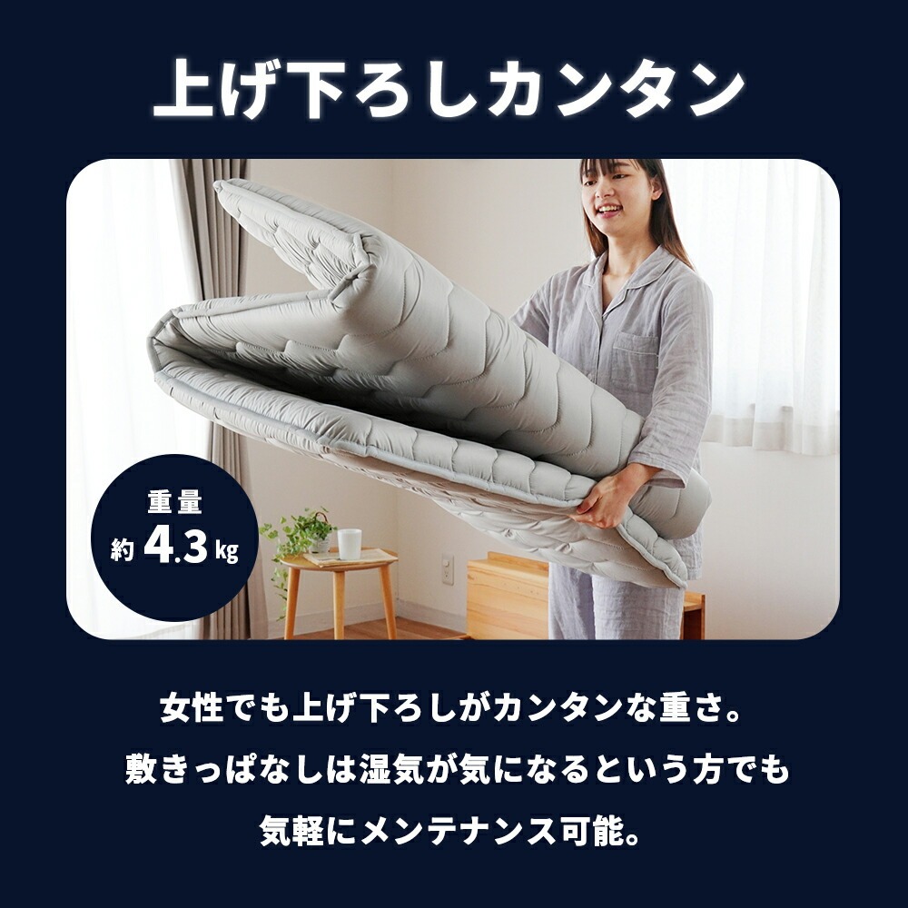 | ・薄いのにしっかり3層構造 上層部、下層部は抗菌防臭防ダニ効果のあるマイティトップR2 ECOを、中層には固わたで高反発なメガトップRECOを使用。 ・軽量なのにしっかり高反発MEGATOPRECO軽さと硬さを両立した機能性素材「MEGATOPRECO」高反発なので沈み込むことなく寝姿勢を支えます。寝返りもしやすく、偏りがちな体圧を分散します。 ・扱いやすい薄さ 厚み約7cm高反発で軽量な中芯を、弾力のある巻きわたで包んだ、厚み約7cmの敷き布団。フローリングに敷いても底付きしにくい! ・抗菌防臭・防ダニわた使用マイティトップR2 ECO高い忌避効果を発揮し、ダニを寄せにくくします。細菌の増殖を抑制し、防臭効果を発揮します。皮膚刺激性試験など、様々な試験で安全性を確認。 ・SEKマークを取得SEKマークとは、繊維製品新機能評価協議会が、抗菌防臭などの機能性を持つ繊維製品の品質を保証する認証マークです ・ISO 9001 取得メーカー 安心の日本製「ISO 9001」は国際標準化機構の定める顧客満足のための国際標準規格です。そんなISOを取得した信頼性の高いメーカー製です。 ・三つ折り可能!未圧縮・収納ケース入り一度圧縮すると、復元の具合に個体差が出るため、ベストな状態を保つために未圧縮でお届けします。 | |