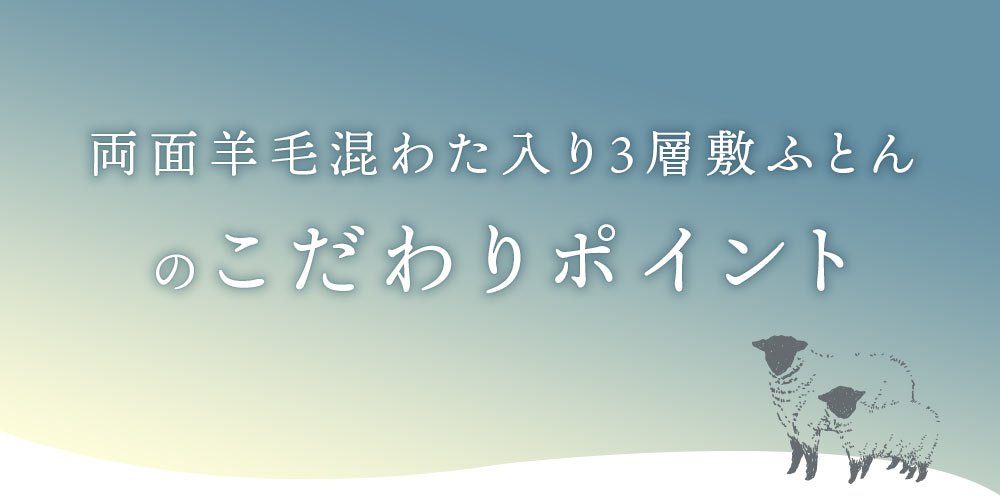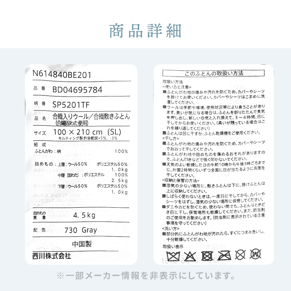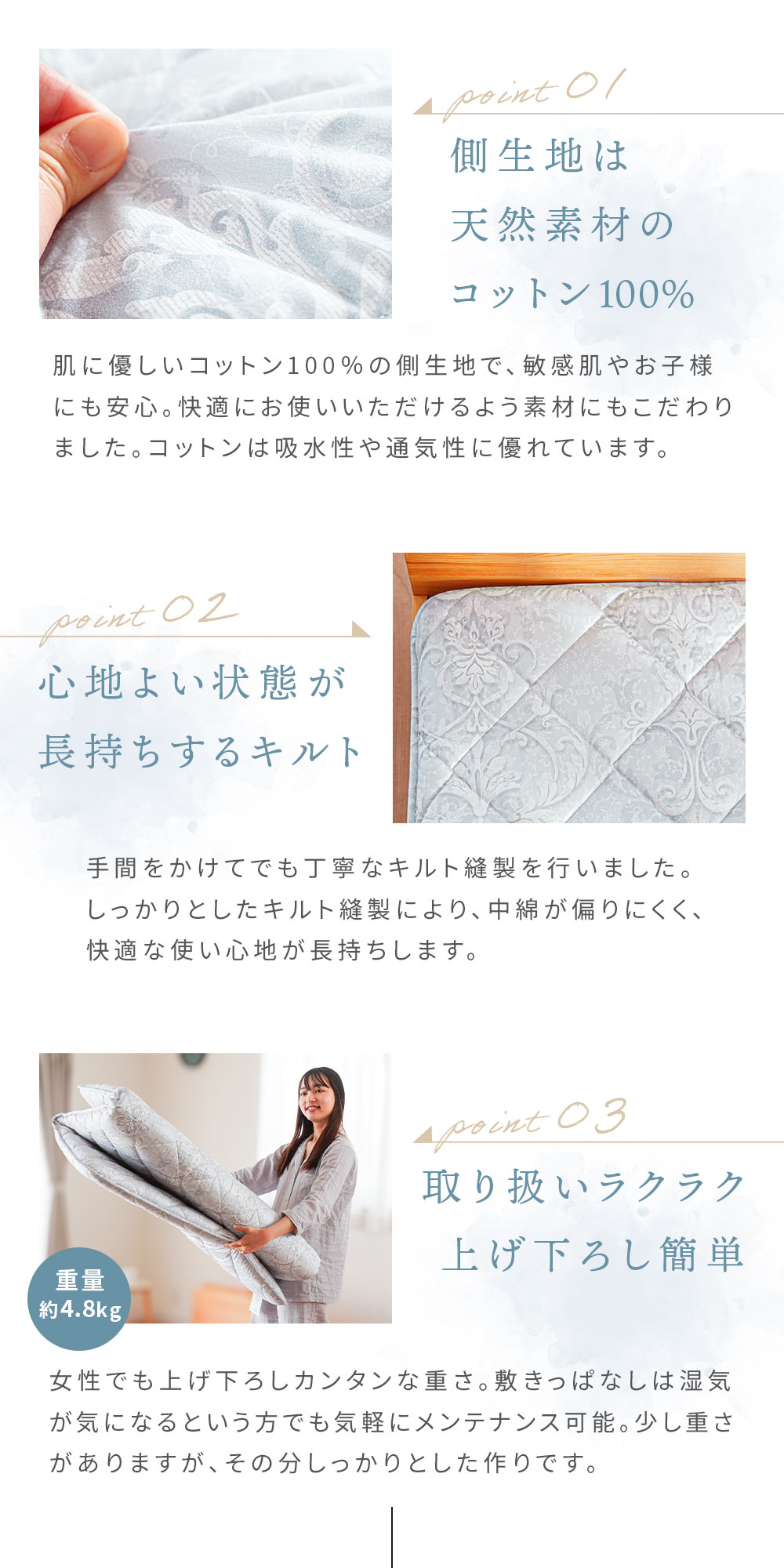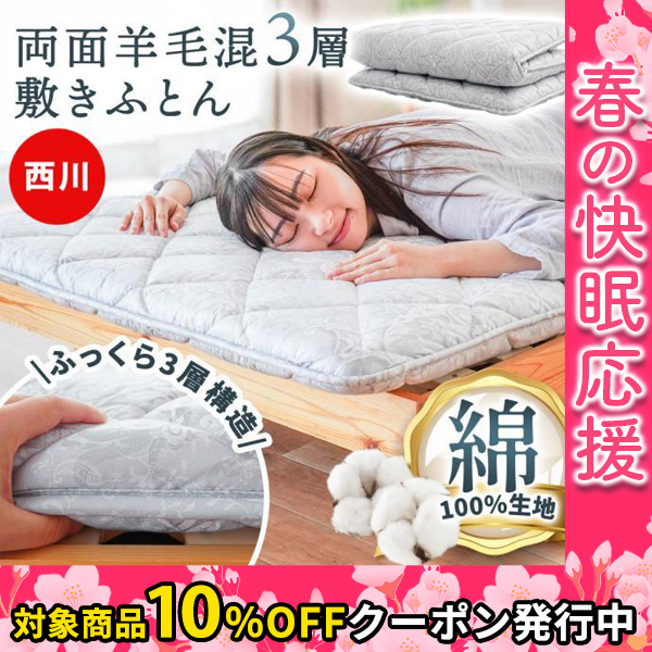 | ・固綿&両面羊毛混わた入り3層敷き布団について ほどよい硬さで体をしっかり支え、ほんのり暖かみと弾力性のある羊毛混わた入り。機能性に優れた羊毛を使用し、表裏とも羊毛混わたが入った3層構造で快適な寝心地を実現。普段使いはもちろん来客用にもおすすめです。 ・ウール入りだから弾力性や快適性アップ中わたに吸湿発散性に優れたウールを使用しているので、汗をかいてもムレにくく快適です。また弾力性が高く、やわらかな風合いで、しっかりと暖かさをキープします。 ・快眠の秘訣、しっかり固綿入り三層構造 しっかりめのフラットな固わたが入っているので、底付き感はあまり感じません。ポリエステル固綿を羊毛50%混の中綿で包んだ三層構造で体を支えます。 肌に優しいコットン100%の側生地で、敏感肌やお子様にも安心。快適にお使いいただけるよう素材にもこだわりました。コットンは吸水性や通気性に優れています。 ・心地良い状態が長続きするキルト手間をかけてでも丁寧なキルト縫製を行いました。しっかりとしたキルト縫製により、中綿が偏りにくく、快適な使い心地が長持ちします。 ・取り扱いラクラク上げ下ろし簡単女性でも上げ下ろしカンタンな重さ。敷きっぱなしは湿気が気になるという方でも気軽にメンテナンス可能。少し重さがありますが、その分しっかりとした作りです。 ・安心の高品質、西川製品西川株式会社は、1566年創業の日本有数の寝具メーカー。眠りや寝具に対するこだわりは強く、そのこだわりの強さが品質の高さに繋がっています。 安心して大切な方にお使いいただけるハイレベルな寝具をお求めの方に、自信をもっておすすめします。 | |
