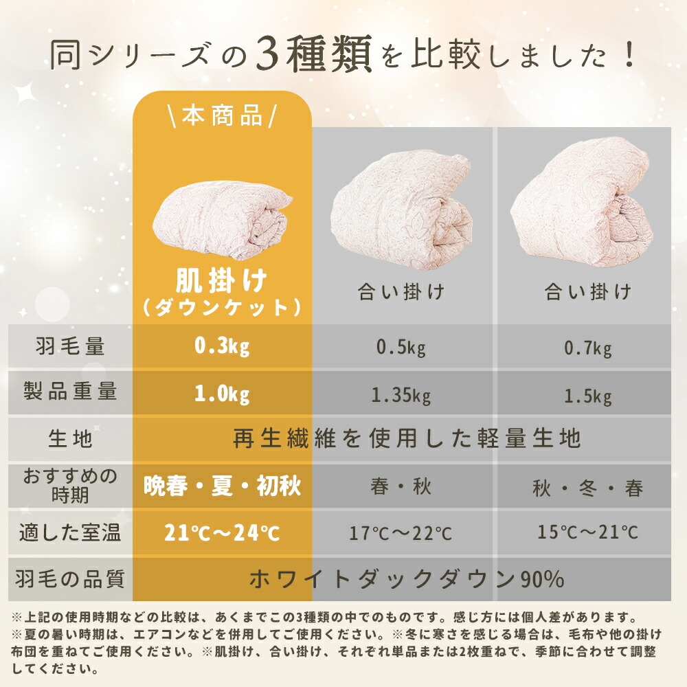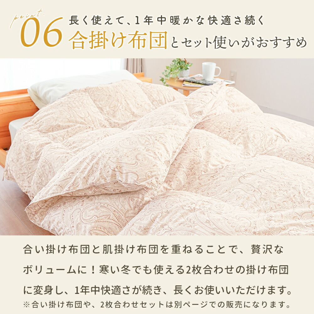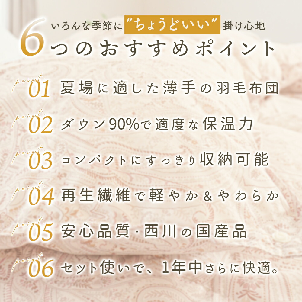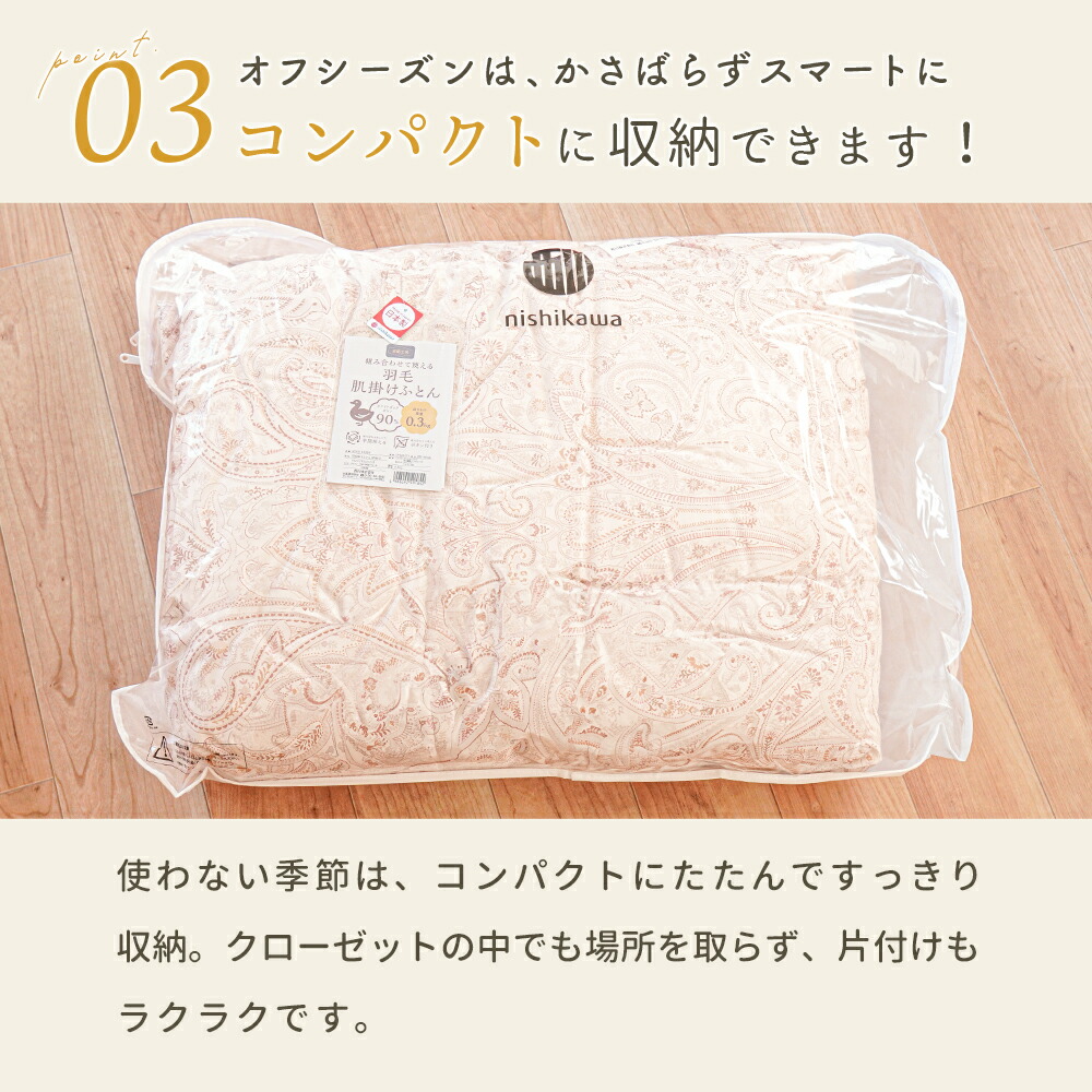 | ・「夏」はこれ一枚で使える!年中使えるちょうどいい薄手の羽毛布団 春から秋まで活躍する程よいボリューム感。天然素材の心地よいぬくもりで、快適な睡眠をサポートします。使い勝手が良く、万能な一枚です。 ・ダウン90%で詰め物量0.3kg!薄手でも適度な保温力軽やかな掛け心地と確かな暖かさを実現。薄手ながらも、優れた保温性を発揮。薄手でもしっかりとした保温力を求める方や、エアコンの寝冷え対策などにおすすめです。 ・オフシーズンは、かさばらずスマートに!コンパクトに収納できます!使わない季節は、コンパクトに畳んですっきり収納。クローゼットの中でも場所を取らず、片付けもラクラクです。 ・環境に配慮した再生繊維生地。軽やか&柔らかさをプラス軽くて柔らかな再生繊維(リヨセル)に、丈夫なポリエステルを配合し、さらなる耐久性をプラスしました。優れた吸湿性と通気性を兼ね備えました。 ・安心安全の高品質な国内品、老舗メーカー・西川製品品汁にこだわりたい方も安心。日本有数の寝具メーカー「西川」の製品です。長い歴史の中で、積み重ねられたその技術は、高い品質と信頼があります。 ・長く使えて、1年中暖かな快適さ続く。合い掛け布団とセット使いがおすすめ 合い掛け布団と肌掛け布団を重ねることで、贅沢なボリュームに!寒い冬でも使える2枚合わせの掛け布団に変身し、1年中快適さが続き、長くお使いいただけます。 | |