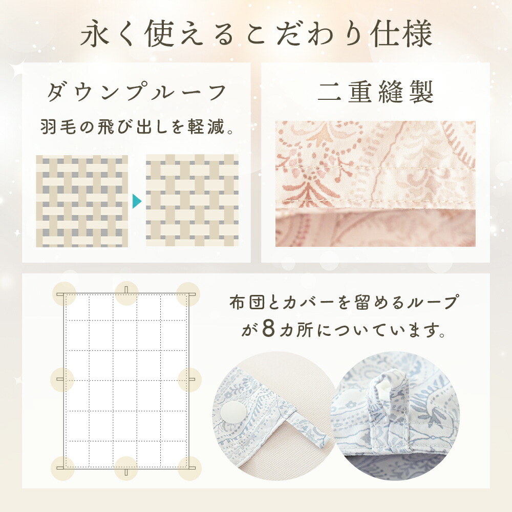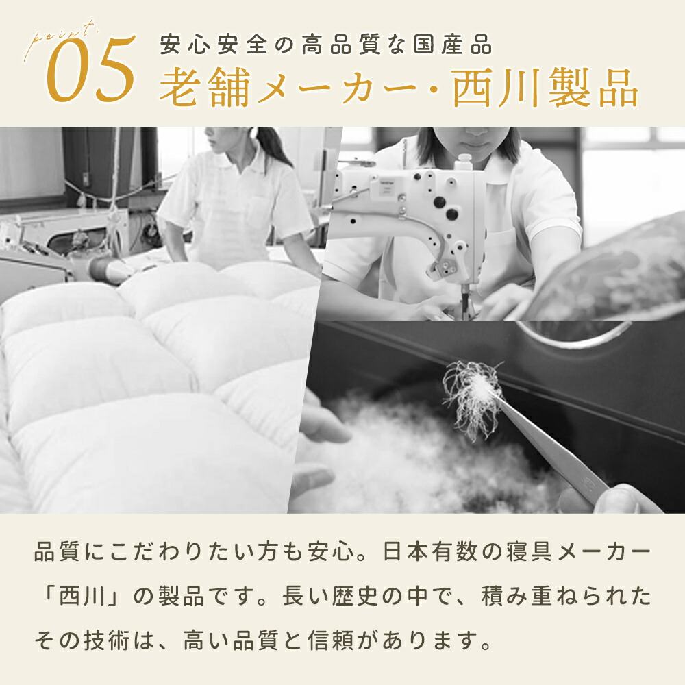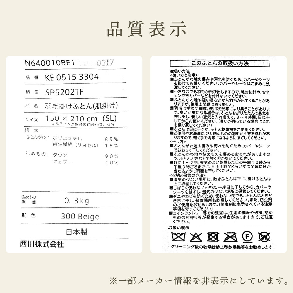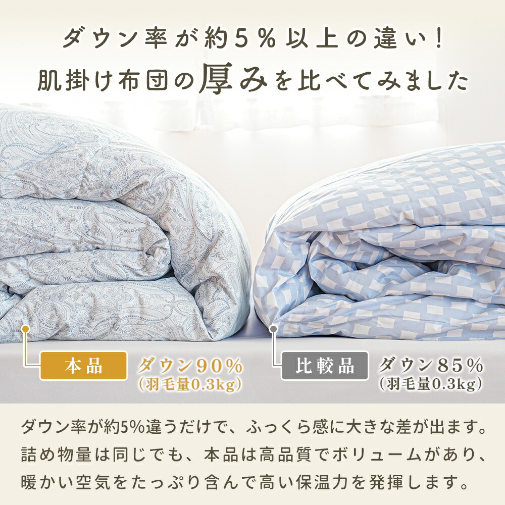 | ・「夏」はこれ一枚で使える!年中使えるちょうどいい薄手の羽毛布団 春から秋まで活躍する程よいボリューム感。天然素材の心地よいぬくもりで、快適な睡眠をサポートします。使い勝手が良く、万能な一枚です。 ・ダウン90%で詰め物量0.3kg!薄手でも適度な保温力軽やかな掛け心地と確かな暖かさを実現。薄手ながらも、優れた保温性を発揮。薄手でもしっかりとした保温力を求める方や、エアコンの寝冷え対策などにおすすめです。 ・オフシーズンは、かさばらずスマートに!コンパクトに収納できます!使わない季節は、コンパクトに畳んですっきり収納。クローゼットの中でも場所を取らず、片付けもラクラクです。 ・環境に配慮した再生繊維生地。軽やか&柔らかさをプラス軽くて柔らかな再生繊維(リヨセル)に、丈夫なポリエステルを配合し、さらなる耐久性をプラスしました。優れた吸湿性と通気性を兼ね備えました。 ・安心安全の高品質な国内品、老舗メーカー・西川製品品汁にこだわりたい方も安心。日本有数の寝具メーカー「西川」の製品です。長い歴史の中で、積み重ねられたその技術は、高い品質と信頼があります。 ・長く使えて、1年中暖かな快適さ続く。合い掛け布団とセット使いがおすすめ 合い掛け布団と肌掛け布団を重ねることで、贅沢なボリュームに!寒い冬でも使える2枚合わせの掛け布団に変身し、1年中快適さが続き、長くお使いいただけます。 | |