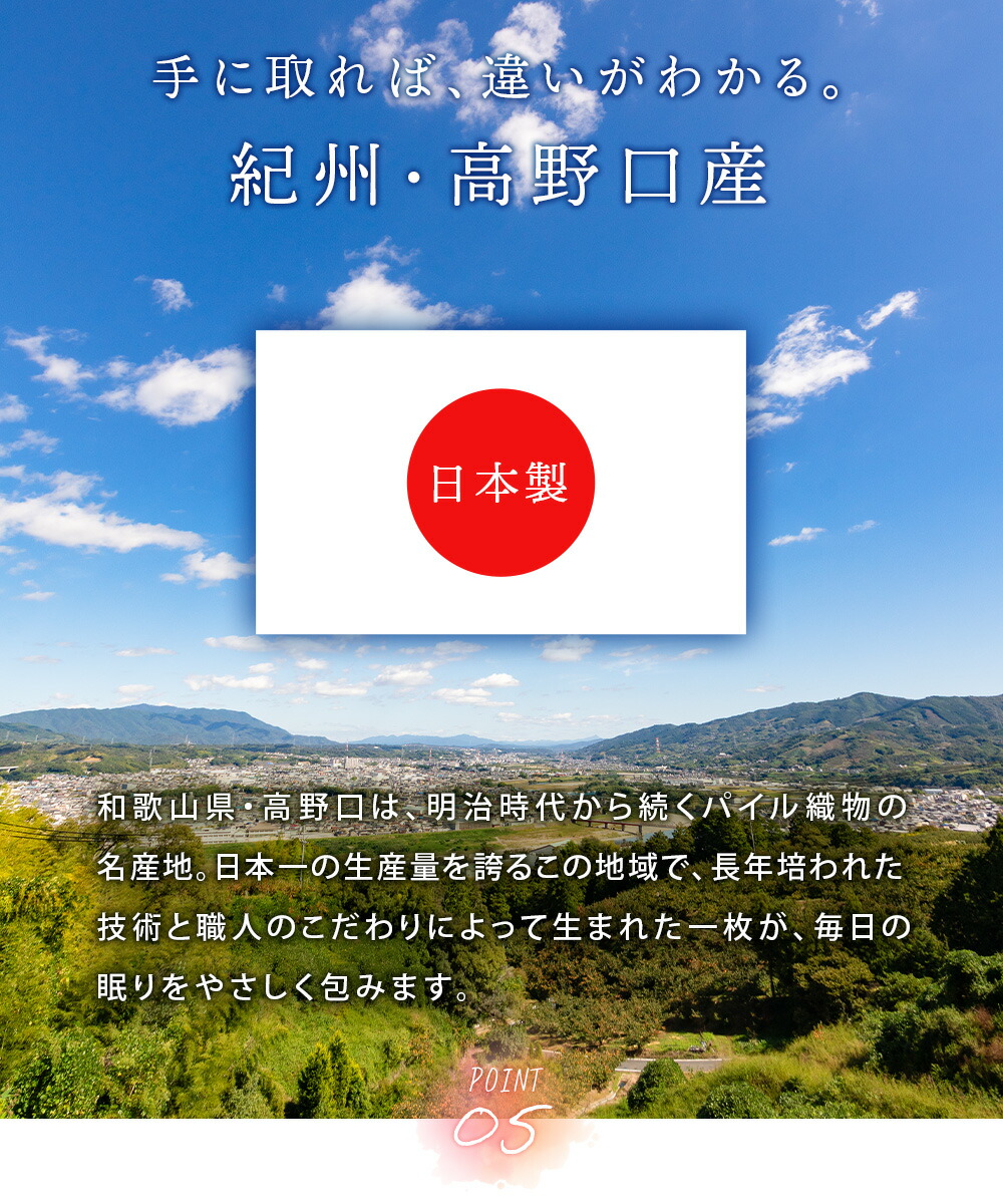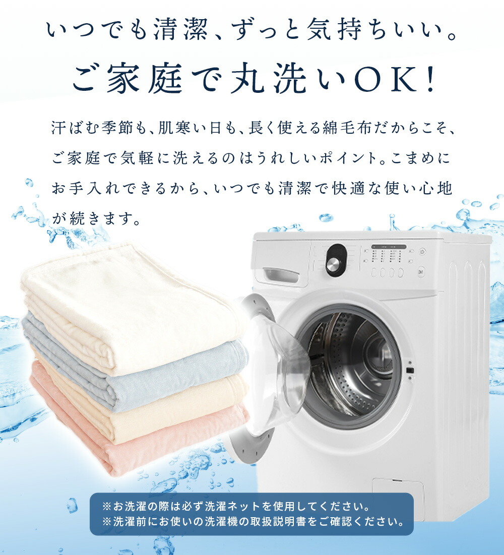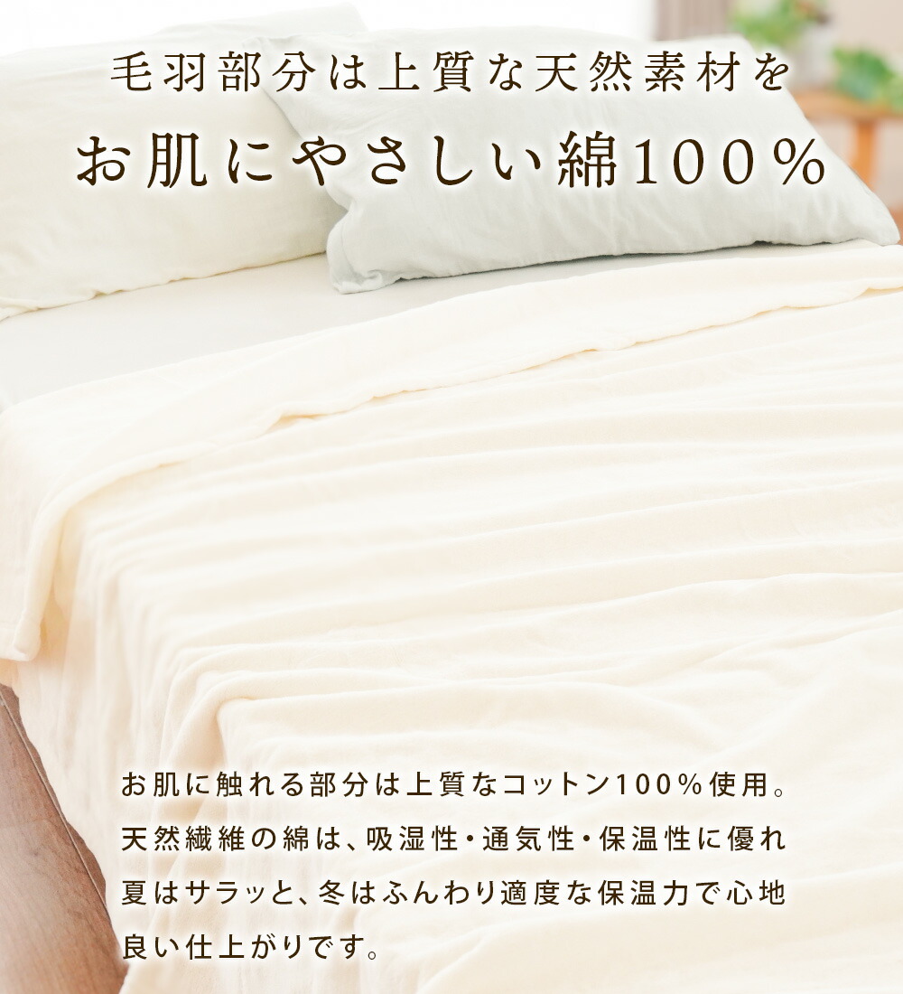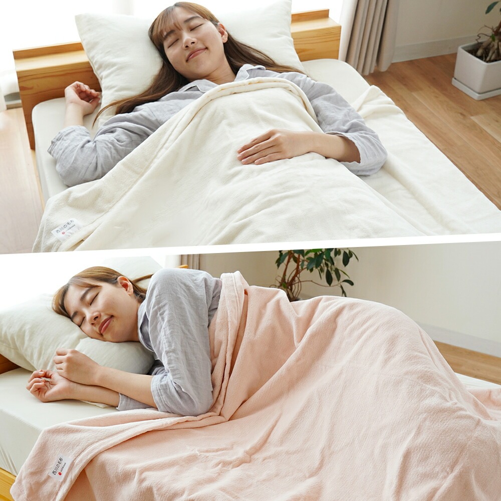 | ・パイル抜けしにくく、風合い長持ち。シール織の魅力 特殊なパイル織「シール織」で仕立てたこのケットは、やわらかな肌ざわりなのに、毛抜けしにくく丈夫。毎日気軽に使える、うれしい使い心地です。 ・毛羽部分は上質な天然素材を、お肌にやさしい綿100%お肌に触れる部分は上質なコットン100%使用。天然繊維の綿は、吸湿性・通気性・保温性に優れ、夏はサラッと冬はふんわり適度な保温力で心地良い仕上がりです。 ・綿の快適さのヒミツは吸湿性がなんとポリエステルの約21倍以上!綿はポリエステルの約21倍の吸水性を持ち、湿気をやさしく吸い取ってくれる素材です。汗をかいてもべたつきにくく、肌に触れるたびにサラッとした心地よさが続きます。 ・そのままでも、インナーケットにも。一年中活躍する一枚。薄手で軽やかな毛布です。春や秋のちょっと肌寒い日も、夏のエアコン対策にもぴったり。羽毛布団の中に重ねれば、冬もあったか。やさしい色で、お部屋にもすっとなじみます。 ・手に取れば、違いがわかる。紀州・高野口産和歌山県・高野口は、明治時代から続くパイル織物の名産地。日本一の生産量を誇るこの地域で、長年培われた技術と職人のこだわりによって生まれた一枚が、毎日の眠りをやさしく包みます。 ・いつでも清潔、ずっと気持ちいい。ご家庭で丸洗いOK!汗ばむ季節も、肌寒い日も、長く使える綿毛布だからこそ、ご家庭で気軽に洗えるのはうれしいポイント。こまめにお手入れできるから、いつでも清潔で快適な使い心地が続きます。 | |