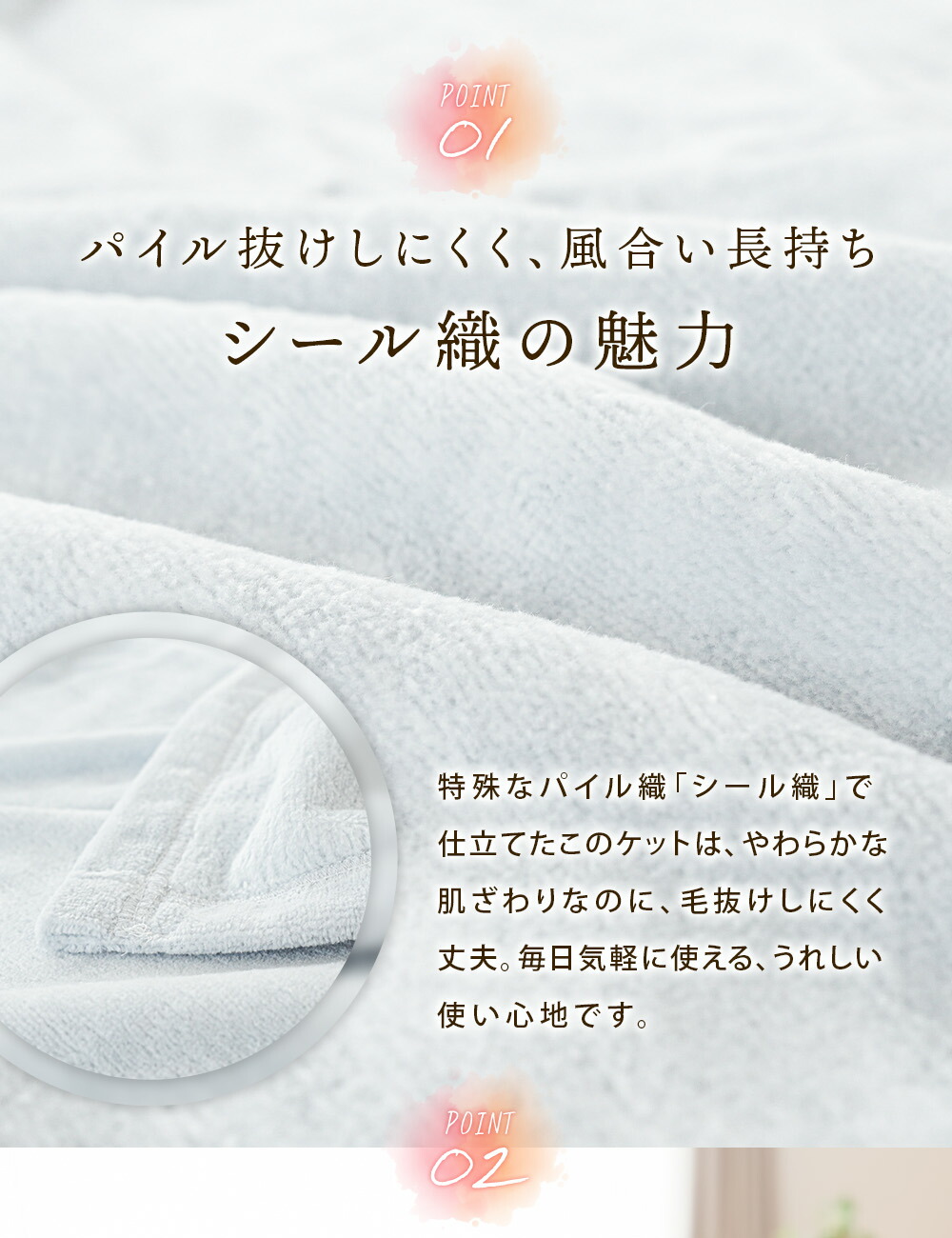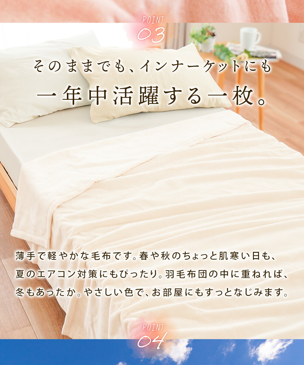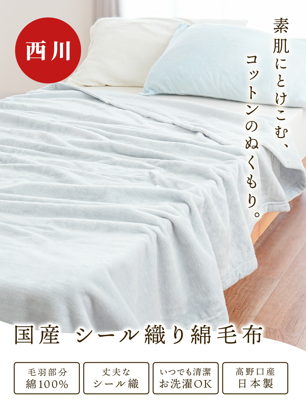 | ・パイル抜けしにくく、風合い長持ち。シール織の魅力 特殊なパイル織「シール織」で仕立てたこのケットは、やわらかな肌ざわりなのに、毛抜けしにくく丈夫。毎日気軽に使える、うれしい使い心地です。 ・毛羽部分は上質な天然素材を、お肌にやさしい綿100%お肌に触れる部分は上質なコットン100%使用。天然繊維の綿は、吸湿性・通気性・保温性に優れ、夏はサラッと冬はふんわり適度な保温力で心地良い仕上がりです。 ・綿の快適さのヒミツは吸湿性がなんとポリエステルの約21倍以上!綿はポリエステルの約21倍の吸水性を持ち、湿気をやさしく吸い取ってくれる素材です。汗をかいてもべたつきにくく、肌に触れるたびにサラッとした心地よさが続きます。 ・そのままでも、インナーケットにも。一年中活躍する一枚。薄手で軽やかな毛布です。春や秋のちょっと肌寒い日も、夏のエアコン対策にもぴったり。羽毛布団の中に重ねれば、冬もあったか。やさしい色で、お部屋にもすっとなじみます。 ・手に取れば、違いがわかる。紀州・高野口産和歌山県・高野口は、明治時代から続くパイル織物の名産地。日本一の生産量を誇るこの地域で、長年培われた技術と職人のこだわりによって生まれた一枚が、毎日の眠りをやさしく包みます。 ・いつでも清潔、ずっと気持ちいい。ご家庭で丸洗いOK!汗ばむ季節も、肌寒い日も、長く使える綿毛布だからこそ、ご家庭で気軽に洗えるのはうれしいポイント。こまめにお手入れできるから、いつでも清潔で快適な使い心地が続きます。 | |