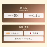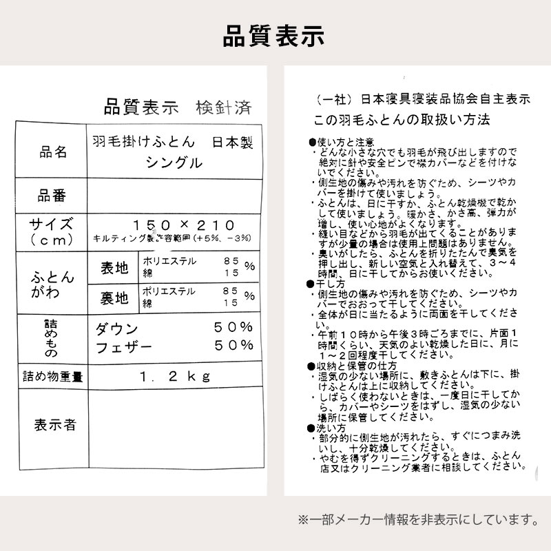 | 組成 | 生地:ポリエステル85%、綿15% 詰め物:ダウン50%、フェザー50% 詰め物重量:1.2kg |