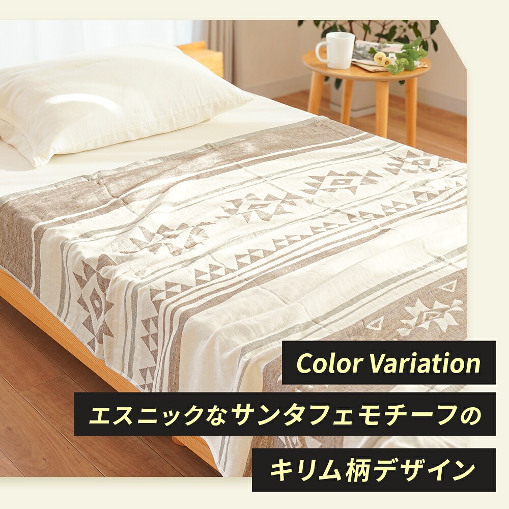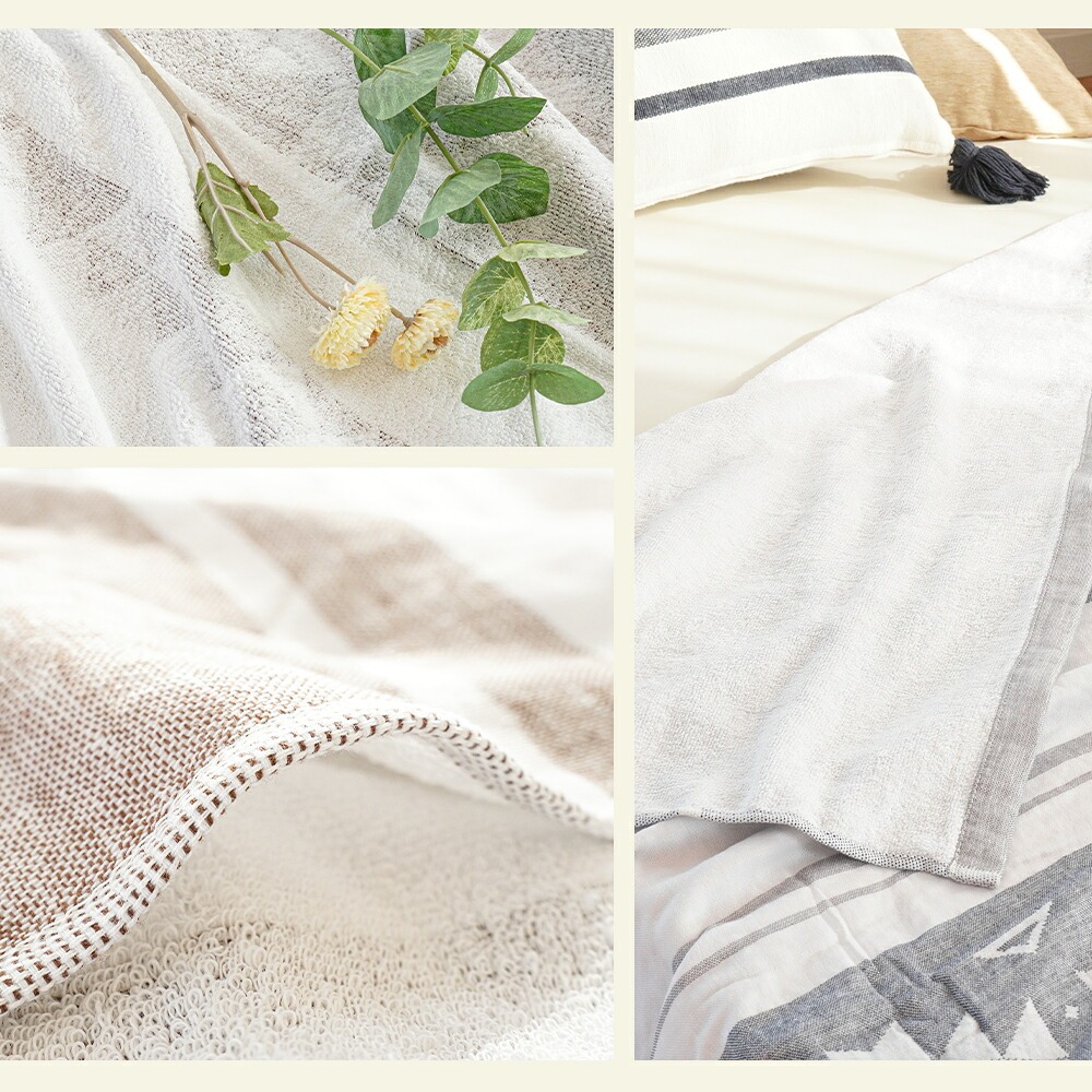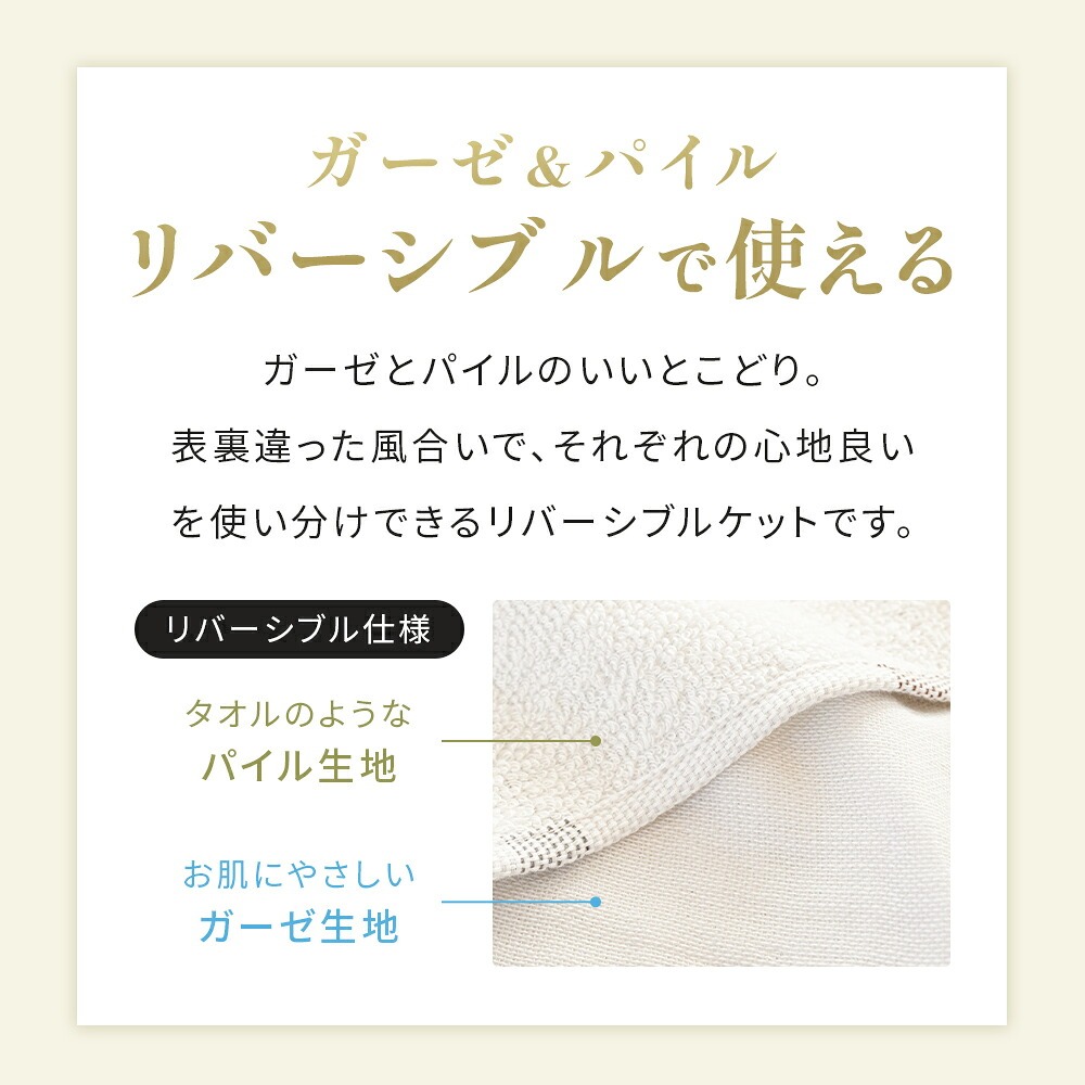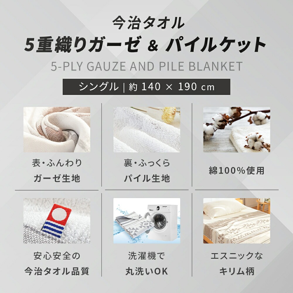 | ・表はふんわりガーゼ生地 やわらかくふんわりと気持ちの良い肌触り。吸水性に優れているため、寝ている間にかいた汗を優しく吸収。寝汗による寝冷えを防いでくれます。 ・贅沢な5重織り5層にした繊細なガーゼは空気の層をたくさん含むため、熱を溜めて適度な保温に。エアコン対策や季節の変わり目におすすめです。 ・裏はふっくらパイル生地裏面は適度な弾力性と通気性を兼ね備えたふっくら柔らかなパイル生地。吸水性も抜群なので夏の暑い夜もサラッと快適にお過ごしいただけます。 ・ガーゼ&パイル リバーシブルで使えるガーゼとパイルのいいとこどり。表裏違った風合いで、それぞれの心地良いを使い分けできるリバーシブルケットです。 ・お肌にやさしい綿100%素材天然素材の綿100%仕上げ。寝汗や湿気を良く吸い取り、快適な寝心地を作ります。 ・オールシーズン使える高い保温性をもつ天然コットンだから、季節や好みに合わせてお肌に触れる面を変えて1年中快適にお使いいただけます。 ・今治タオルブランド認定商品このマークは、日本最大のタオル産地「今治」で、独自の品質基準に合格したタオルのみに付与されます。 ・タオルソムリエが選定当店のタオルは専門資格「タオルソムリエ」を持つスタッフが選定しています。専門的な知識を元に選ばれた上質なタオルです。 ・洗濯機で丸洗いOK!汚れても洗濯機で丸洗いOK。お洗濯後もふっくらやわらかさがキープされるので、赤ちゃんやデリケートなお肌にも安心してご使用いただけます。 ・キリム柄デザインエスニックなサンタフェモチーフのキリム柄デザインです。 | |