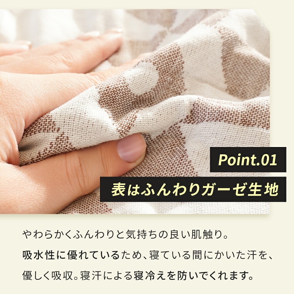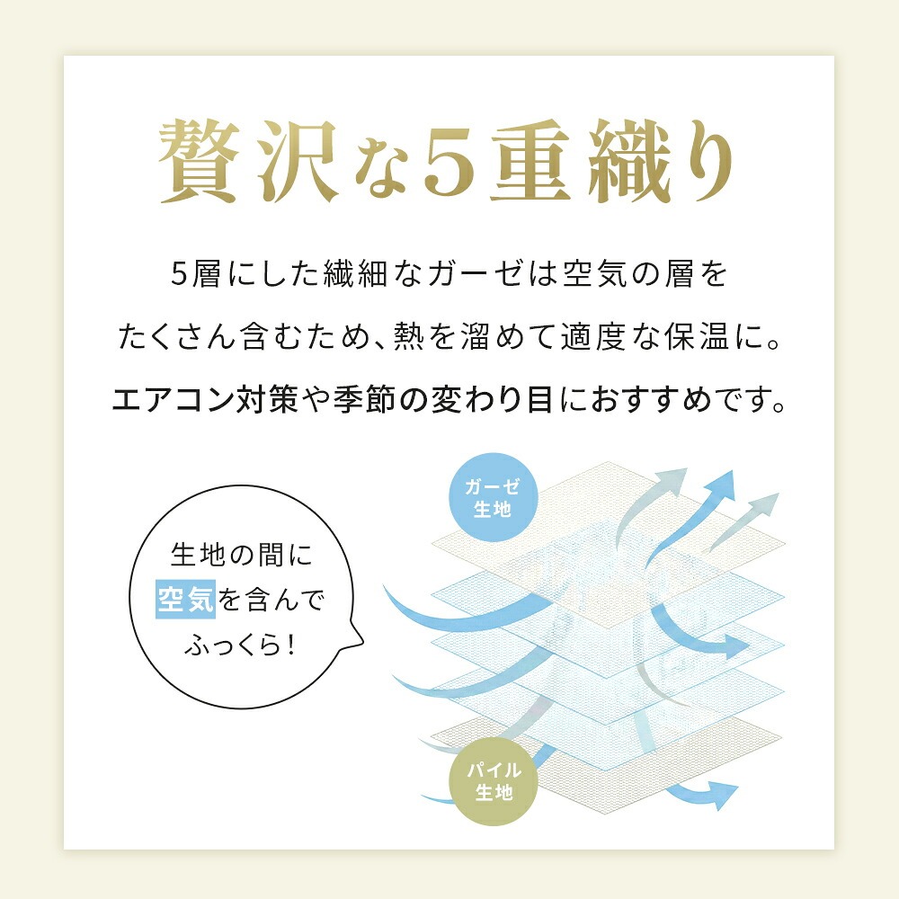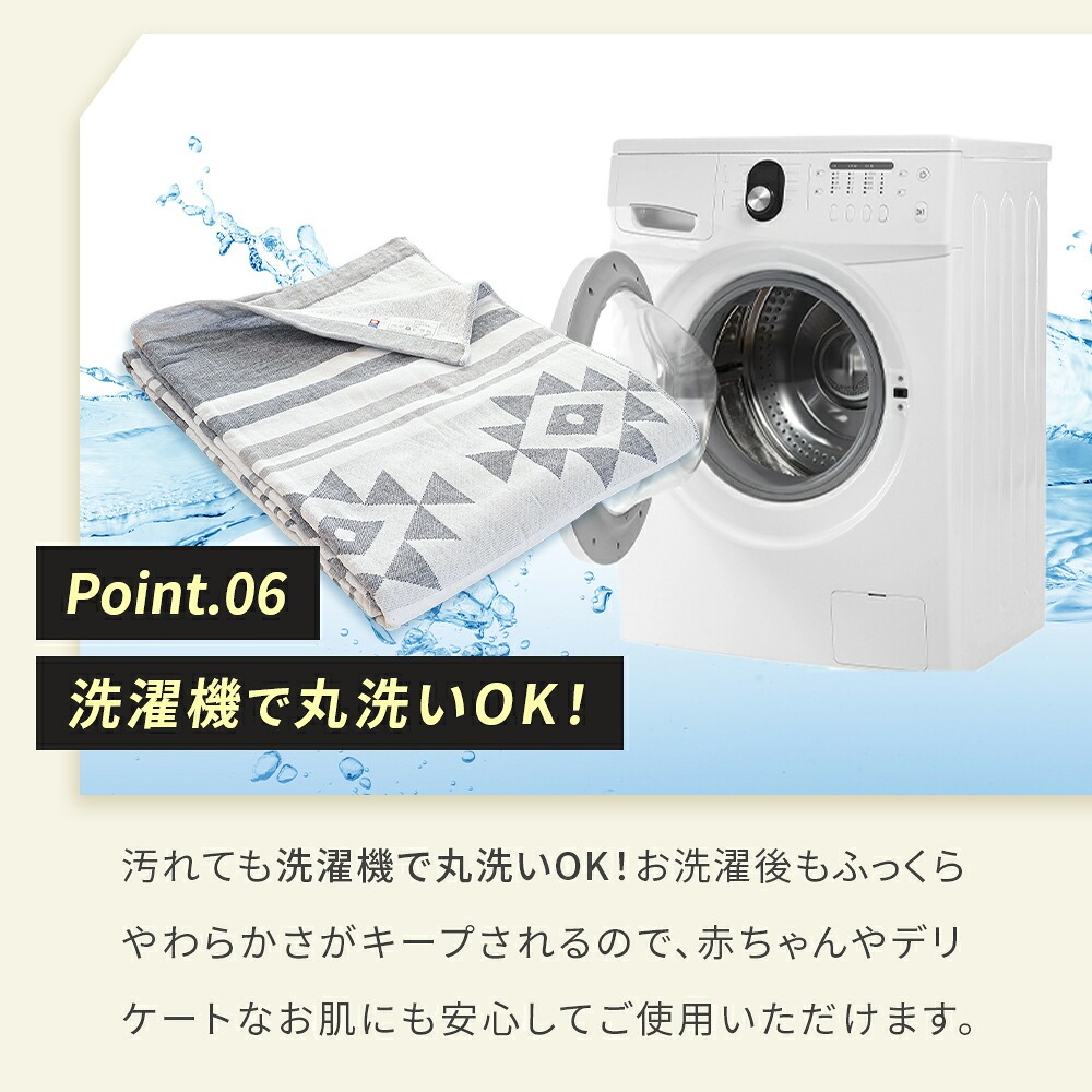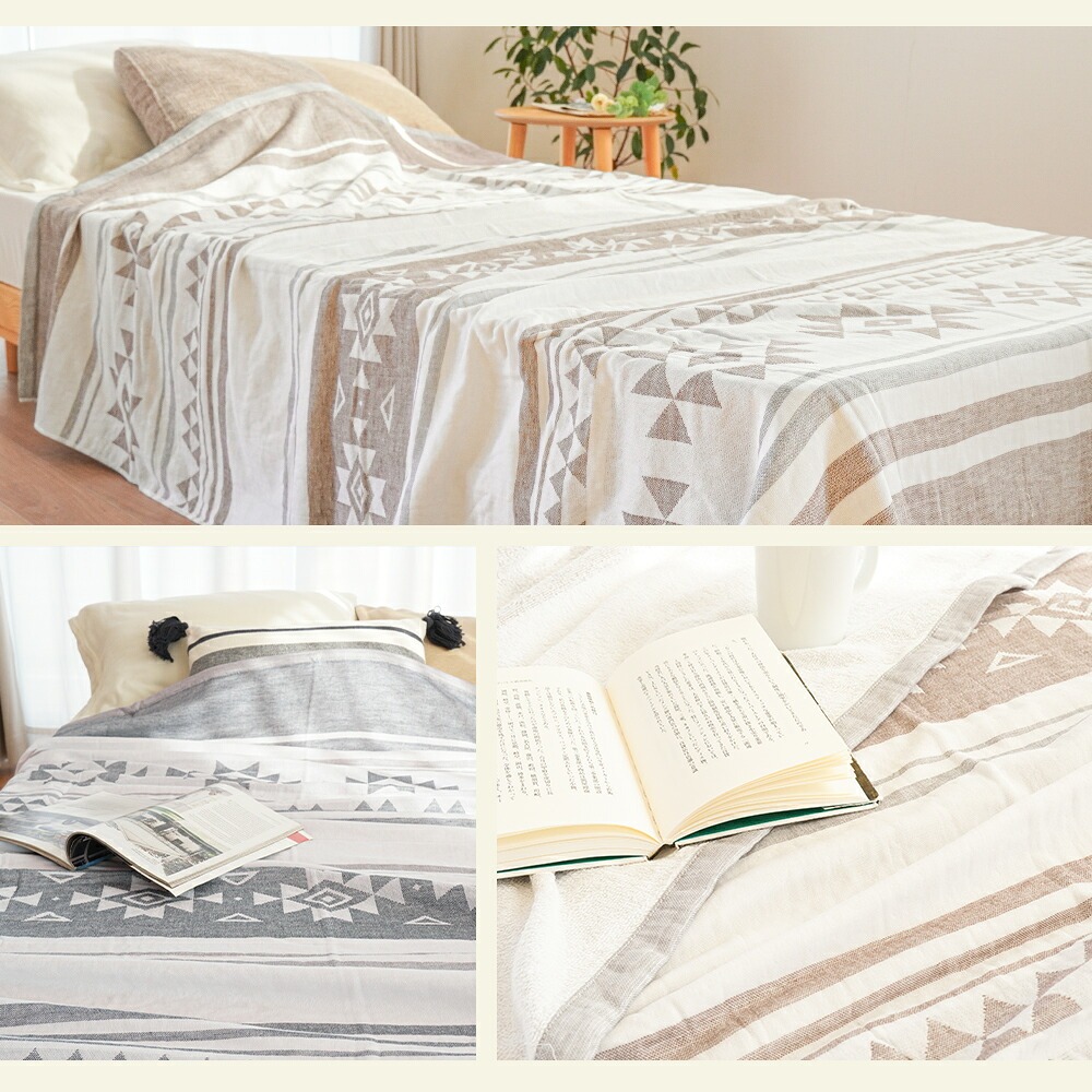 | ・表はふんわりガーゼ生地 やわらかくふんわりと気持ちの良い肌触り。吸水性に優れているため、寝ている間にかいた汗を優しく吸収。寝汗による寝冷えを防いでくれます。 ・贅沢な5重織り5層にした繊細なガーゼは空気の層をたくさん含むため、熱を溜めて適度な保温に。エアコン対策や季節の変わり目におすすめです。 ・裏はふっくらパイル生地裏面は適度な弾力性と通気性を兼ね備えたふっくら柔らかなパイル生地。吸水性も抜群なので夏の暑い夜もサラッと快適にお過ごしいただけます。 ・ガーゼ&パイル リバーシブルで使えるガーゼとパイルのいいとこどり。表裏違った風合いで、それぞれの心地良いを使い分けできるリバーシブルケットです。 ・お肌にやさしい綿100%素材天然素材の綿100%仕上げ。寝汗や湿気を良く吸い取り、快適な寝心地を作ります。 ・オールシーズン使える高い保温性をもつ天然コットンだから、季節や好みに合わせてお肌に触れる面を変えて1年中快適にお使いいただけます。 ・今治タオルブランド認定商品このマークは、日本最大のタオル産地「今治」で、独自の品質基準に合格したタオルのみに付与されます。 ・タオルソムリエが選定当店のタオルは専門資格「タオルソムリエ」を持つスタッフが選定しています。専門的な知識を元に選ばれた上質なタオルです。 ・洗濯機で丸洗いOK!汚れても洗濯機で丸洗いOK。お洗濯後もふっくらやわらかさがキープされるので、赤ちゃんやデリケートなお肌にも安心してご使用いただけます。 ・キリム柄デザインエスニックなサンタフェモチーフのキリム柄デザインです。 | |