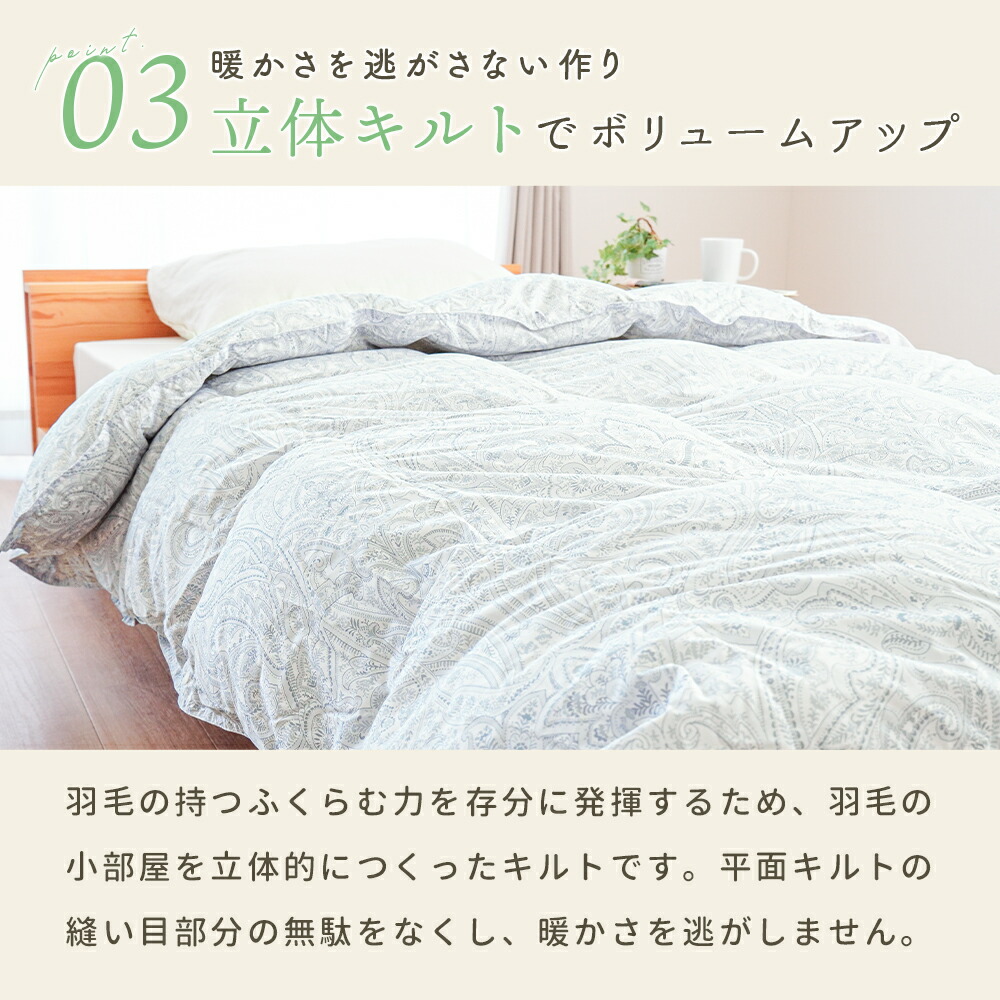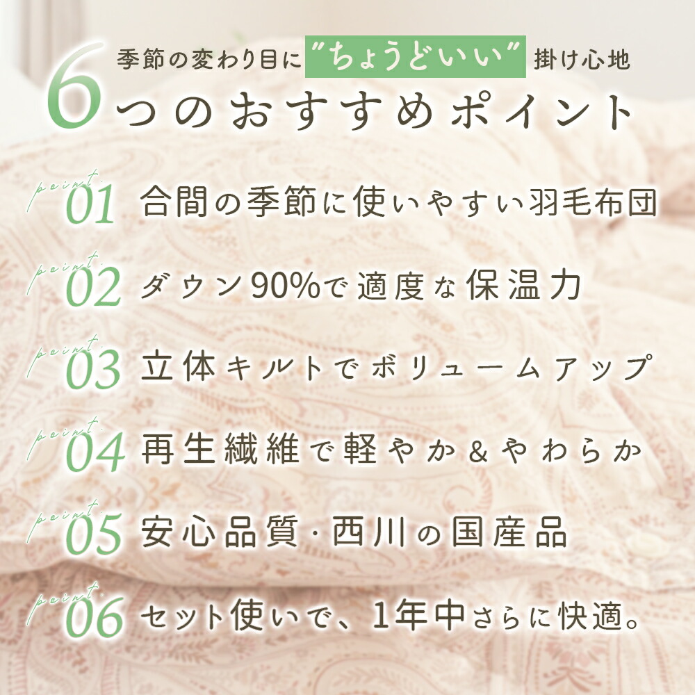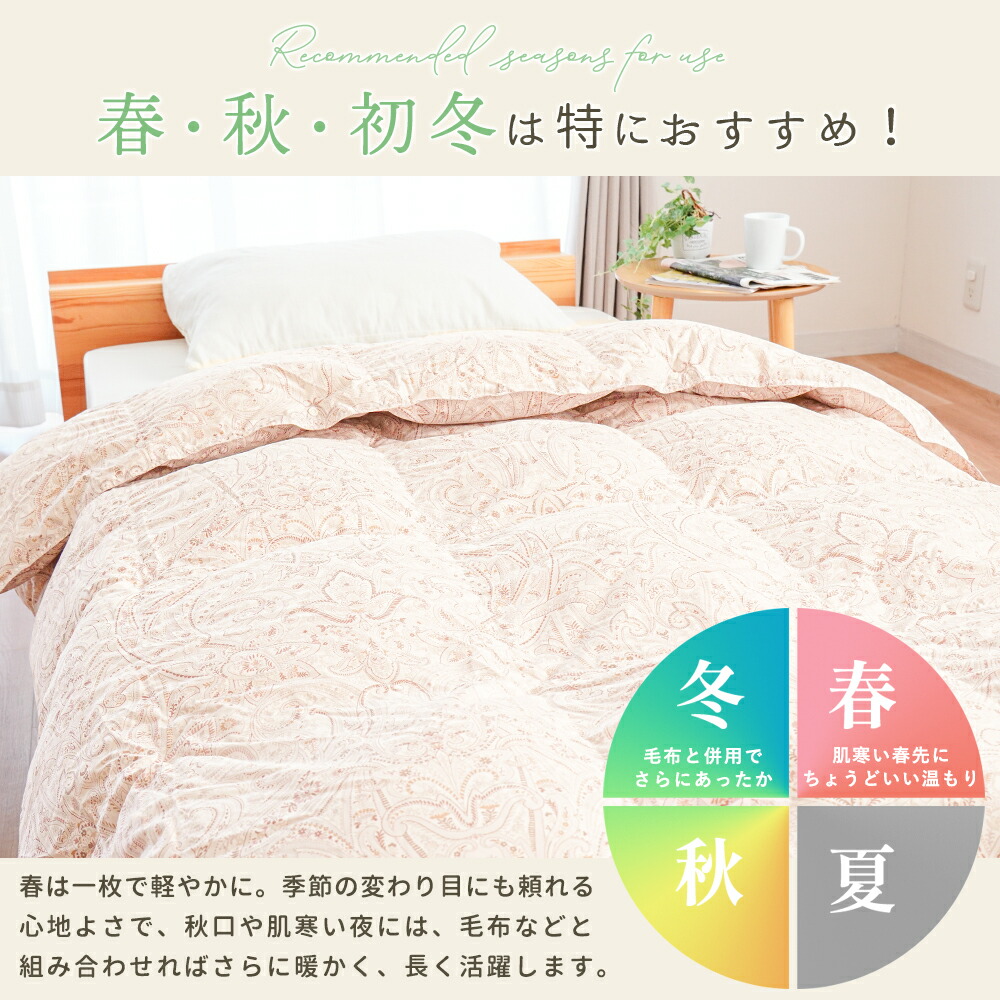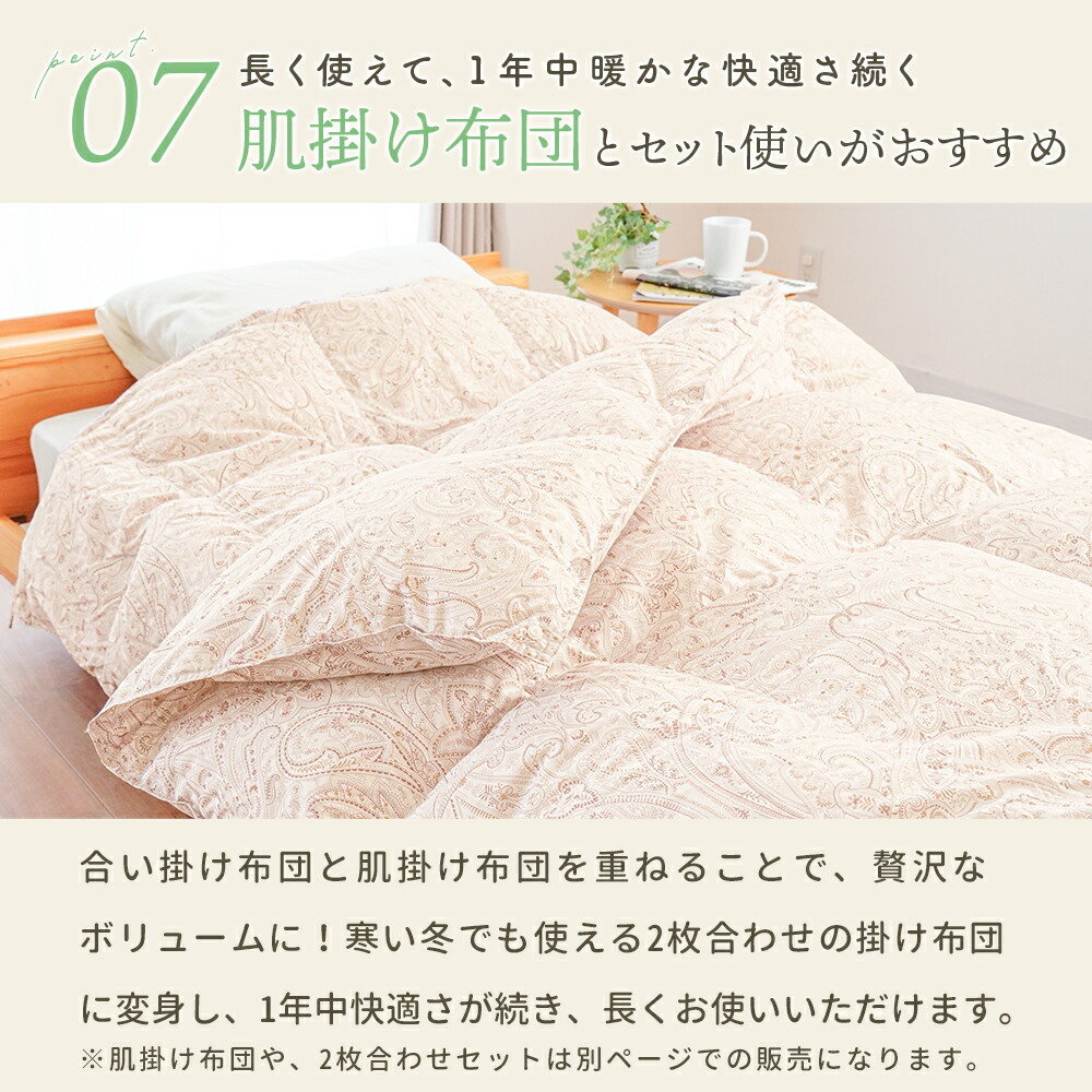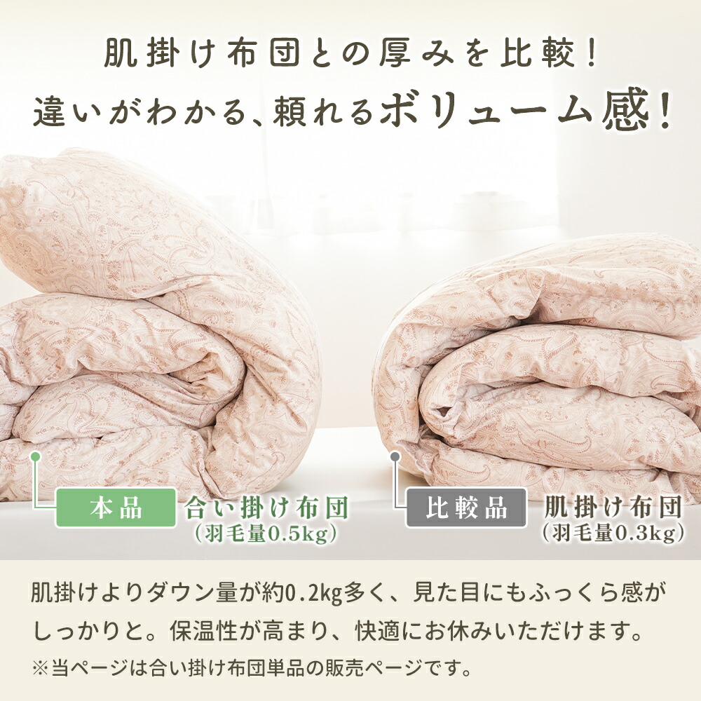 | ・こんな軽やかさが欲しかった…。ふんわり軽めな羽毛布団 春や秋、季節の変わり目に使いやすい、ちょうどいい一枚。肌掛けでは物足りないけど、冬掛けでは暑すぎる…。そんな時期にぴったりの軽やかな暖かさです! ・ダウン90%で詰め物量0.5kg。程よい厚みと優れた保温力ダウン90%配合で軽やかでしっかり暖かい。暖かくなりすぎず、現代の住環境にちょうどいい保温性で、暑がりの方や高気密住宅・温暖な地域にお住まいの方にもおすすめです。 ・暖かさを逃がさない作り。立体キルトでボリュームアップ羽毛の持つふくらむ力を存分に発揮するため、羽毛の小部屋を立体的につくったキルトです。平面キルトの縫い目部分の無駄をなくし、暖かさを逃がしません。 ・環境に配慮した再生繊維生地。軽やか&柔らかさをプラス軽くて柔らかな再生繊維(リヨセル)に、丈夫なポリエステルを配合し、さらなる耐久性をプラスしました。優れた吸湿性と通気性を兼ね備えました。 ・安心安全の高品質な国内品、老舗メーカー・西川製品品汁にこだわりたい方も安心。日本有数の寝具メーカー「西川」の製品です。長い歴史の中で、積み重ねられたその技術は、高い品質と信頼があります。 ・高気密住宅(マンションや戸建て住宅)にマンション向け羽毛布団高気密住宅などにお住まいでも快適に!程よい保温力で「羽毛布団だと暑すぎる…。」と感じていた方にもおすすめです。 合い掛け布団と肌掛け布団を重ねることで、贅沢ボリュームに!寒い冬でも使える2枚合わせの掛け布団に変身し、1年中快適さが続き、長くお使いいただけます。 | |