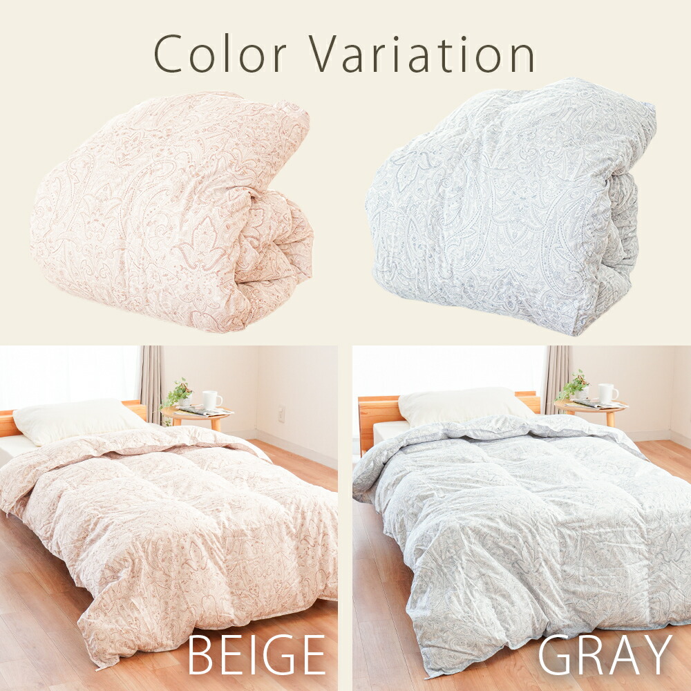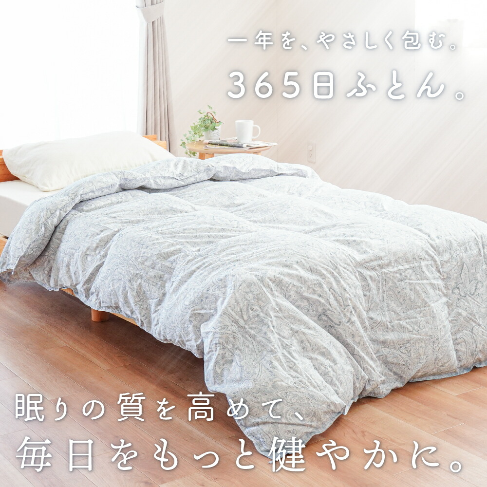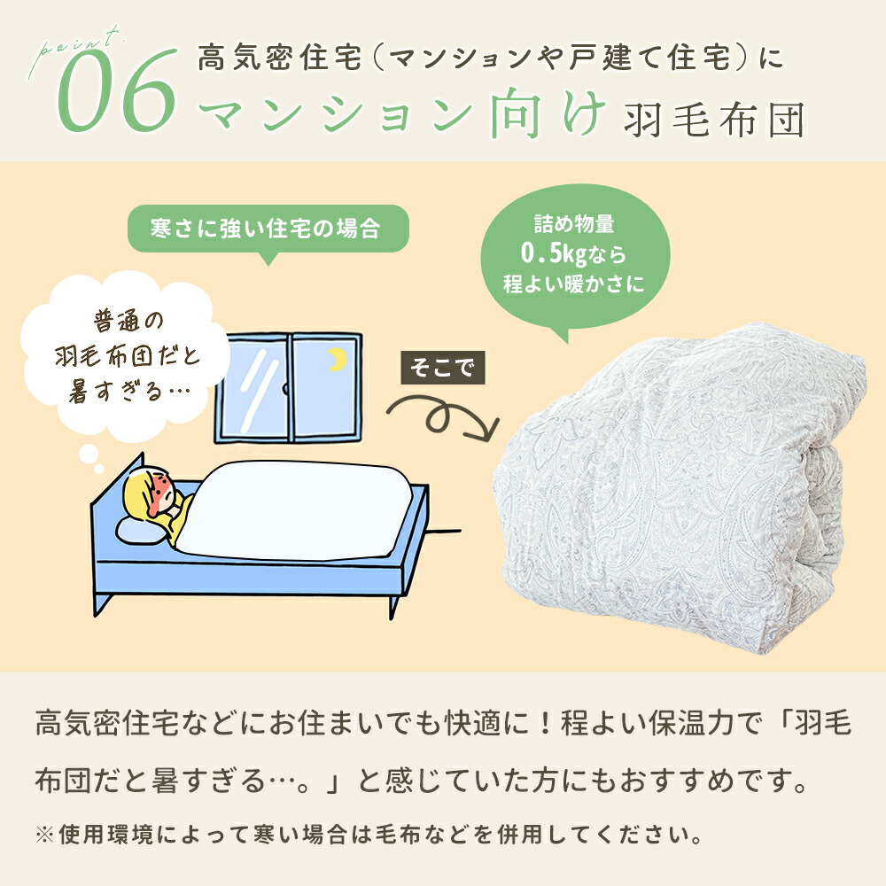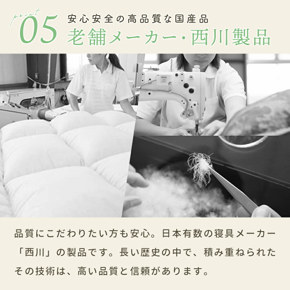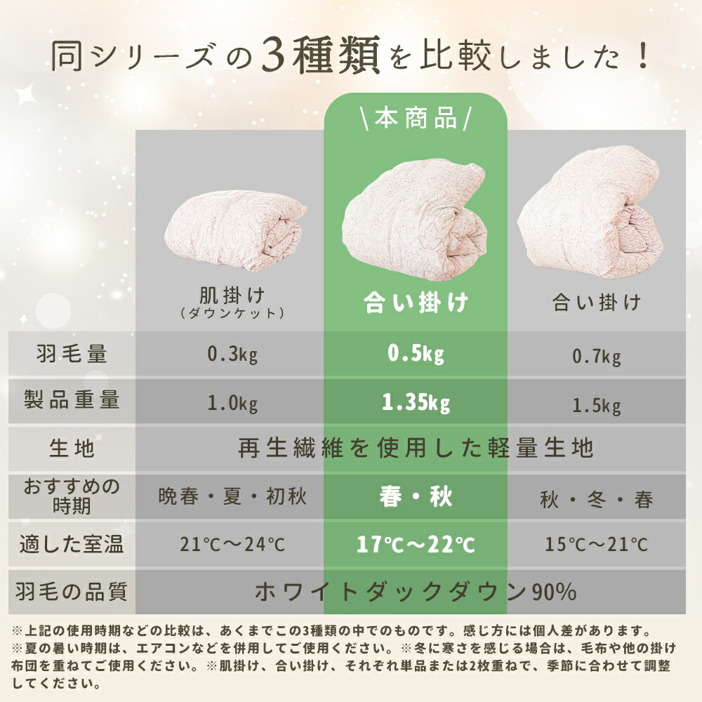 | ・こんな軽やかさが欲しかった…。ふんわり軽めな羽毛布団 春や秋、季節の変わり目に使いやすい、ちょうどいい一枚。肌掛けでは物足りないけど、冬掛けでは暑すぎる…。そんな時期にぴったりの軽やかな暖かさです! ・ダウン90%で詰め物量0.5kg。程よい厚みと優れた保温力ダウン90%配合で軽やかでしっかり暖かい。暖かくなりすぎず、現代の住環境にちょうどいい保温性で、暑がりの方や高気密住宅・温暖な地域にお住まいの方にもおすすめです。 ・暖かさを逃がさない作り。立体キルトでボリュームアップ羽毛の持つふくらむ力を存分に発揮するため、羽毛の小部屋を立体的につくったキルトです。平面キルトの縫い目部分の無駄をなくし、暖かさを逃がしません。 ・環境に配慮した再生繊維生地。軽やか&柔らかさをプラス軽くて柔らかな再生繊維(リヨセル)に、丈夫なポリエステルを配合し、さらなる耐久性をプラスしました。優れた吸湿性と通気性を兼ね備えました。 ・安心安全の高品質な国内品、老舗メーカー・西川製品品汁にこだわりたい方も安心。日本有数の寝具メーカー「西川」の製品です。長い歴史の中で、積み重ねられたその技術は、高い品質と信頼があります。 ・高気密住宅(マンションや戸建て住宅)にマンション向け羽毛布団高気密住宅などにお住まいでも快適に!程よい保温力で「羽毛布団だと暑すぎる…。」と感じていた方にもおすすめです。 合い掛け布団と肌掛け布団を重ねることで、贅沢ボリュームに!寒い冬でも使える2枚合わせの掛け布団に変身し、1年中快適さが続き、長くお使いいただけます。 | |
