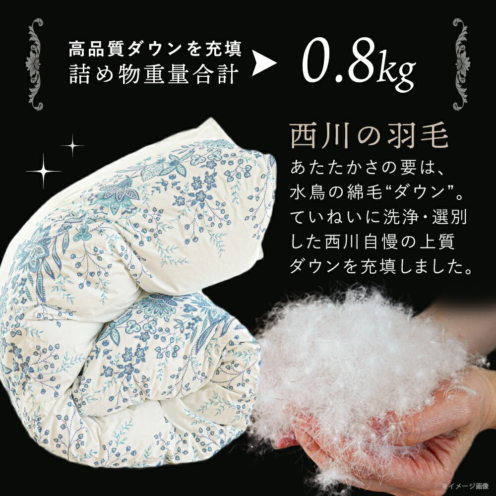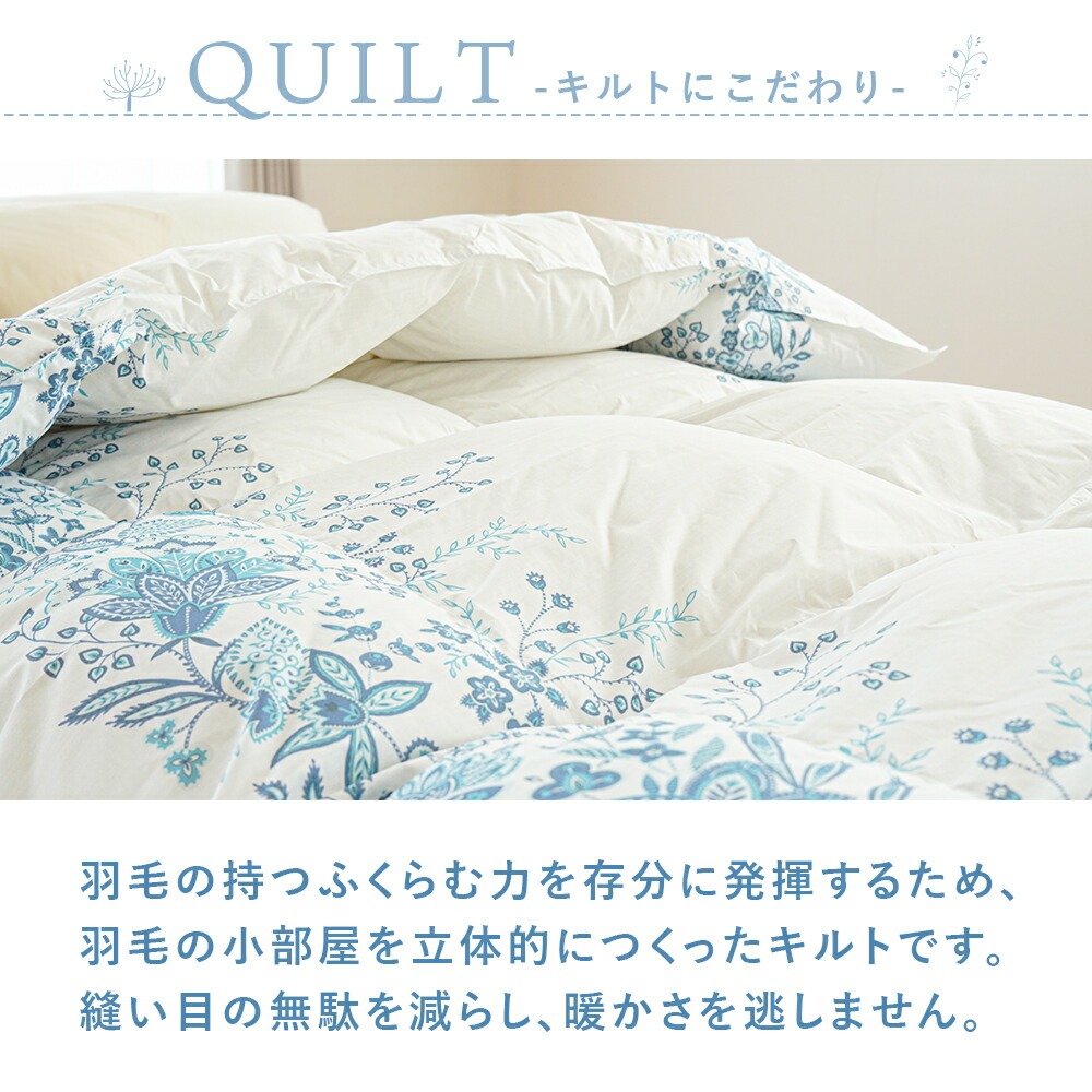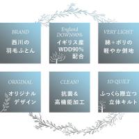 | DOWN -ダウンにこだわり- イギリス産ホワイトダックダウン使用。自然の恵みが育てた上質な羽毛は、暖かさ・嵩高性・耐久性に優れています。 西川だけの バイオアップ? 加工西川は羽毛を徹底洗浄。選別後に「加湿乾燥」「冷却除塵」を施し、軽く暖かくクリーンに。バイオアップ加工でほこり約26%削減。 西川の 清潔・安心ダウン高機能分散加工を施した羽毛。ウイルス・菌・ニオイ成分を拡散し、清潔で快適にお使いいただけます。 QUILT -キルトにこだわり-羽毛の持つふくらむ力を存分に発揮するため、羽毛の小部屋を立体的に作ったキルトです。縫い目の無駄を減らし、暖かさを逃がしません。 立体キルト羽毛の良さを引き立てるマチのあるキルティング。肌沿いが良く、暖かい空気を逃がしにくいので快適。マチで小部屋をつくり羽毛の片寄りを抑制。表裏を密着させない特殊縫製で、ふっくら感が続きます。 CLOTH -生地にこだわり-軽さと張り感に自信。それでも羽毛は通しません。 ダウンプルーフ加工 羽毛を包む特別な生地羽毛の飛び出しを防ぐダウンプルーフ加工生地。羽毛は繊細で吹き出しやすい。生地に熱と圧力をかけて織り目を密にするダウンプルーフ加工で、通気性を保ちながら羽毛の吹き出しを抑えます。 ・西川製品西川は、日本有数の寝具メーカー。1566年創業。450年という長い歴史があり、その中で培ってきた伝統や技術に準ずる品質の高さは類を見ません。安心できる寝具を選びたいのならメーカーで選んでみるのも◎ | |