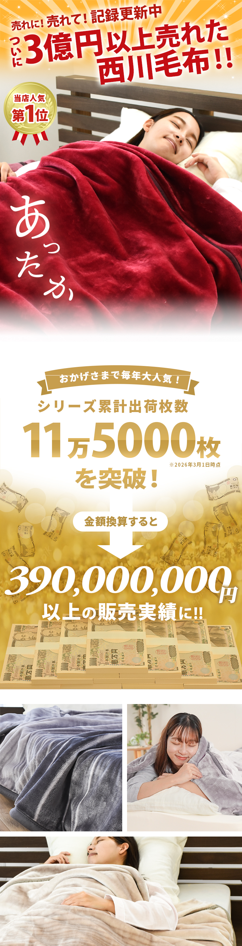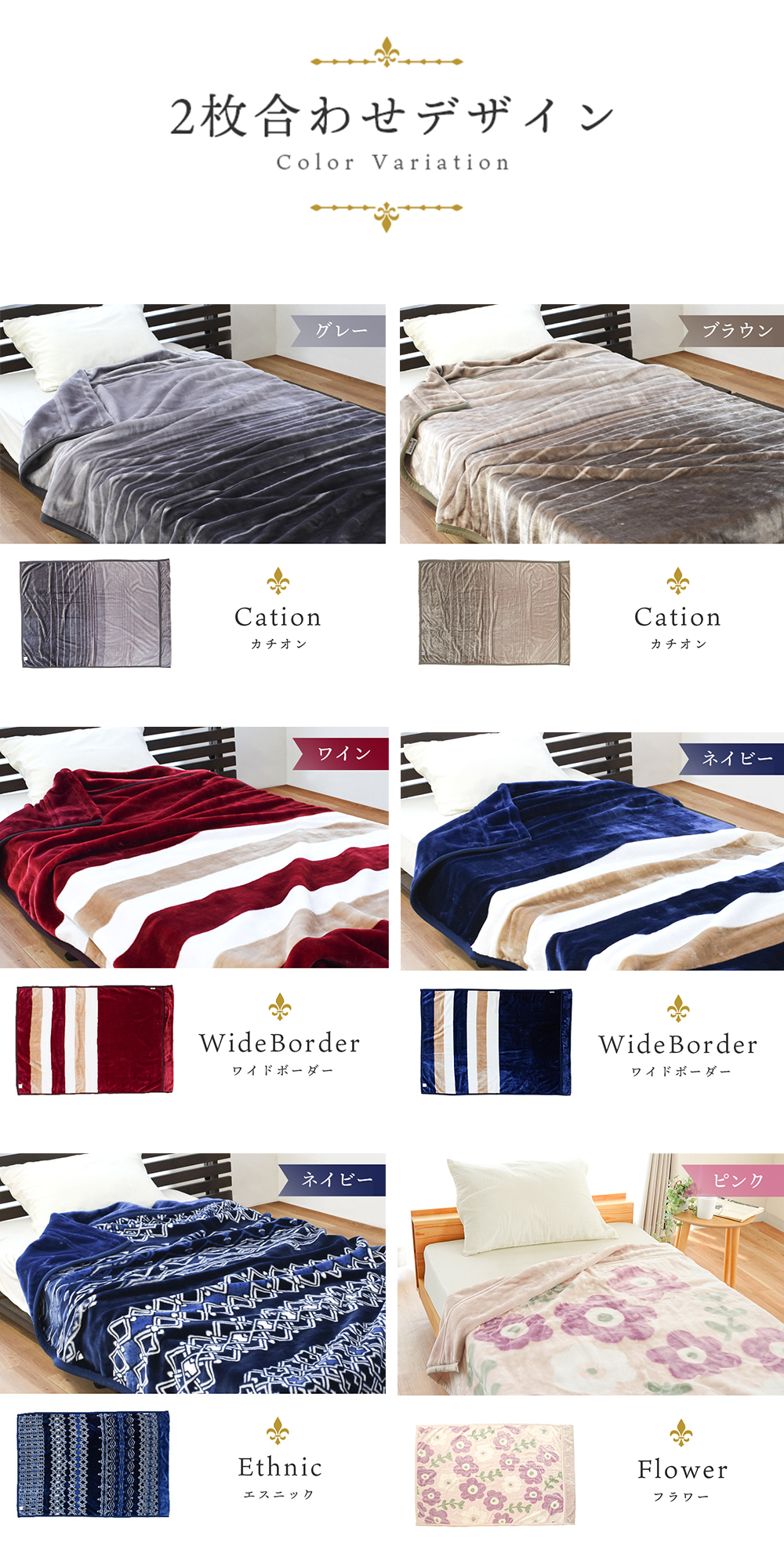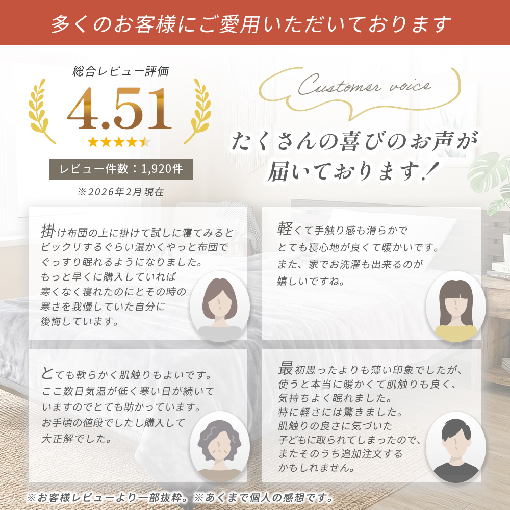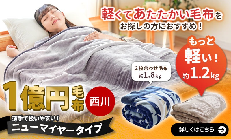 | ・使いやすいボリューム感 重い布団が苦手な方でも使いやすい、重すぎず軽すぎない程よいボリュームの軽量タイプ。中掛けや羽毛布団の上掛けとしてもおすすめです。 ・2枚合わせマイヤー毛布2枚の毛布をヘム加工でしっかり縫い合わせた毛布です。2枚の生地の間に体温であたたまった空気を多く含むので1枚物の毛布よりほっこりあったか。 ・ふっくら衿付き隙間ができやすい衿元(肩口)のあたりをしっかりカバーしてくれる衿付きタイプ。フェイスラインへの触れ心地も柔らかくて気持ちいい。 ・西川製品西川は、日本有数の寝具メーカー。1566年創業。450年という長い歴史があり、その中で培ってきた伝統や技術に準ずる品質の高さは類を見ません。安心できる寝具を選びたいのならメーカーで選んでみるのも◎。 | |