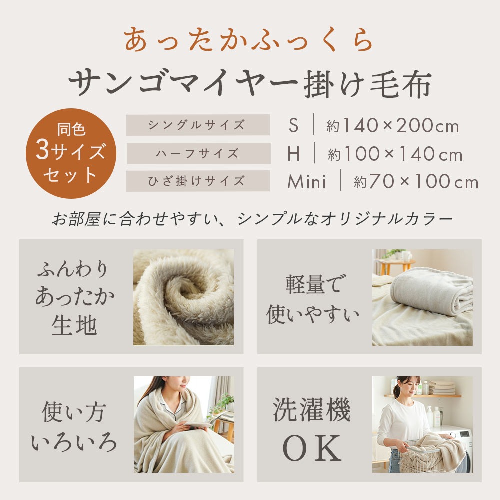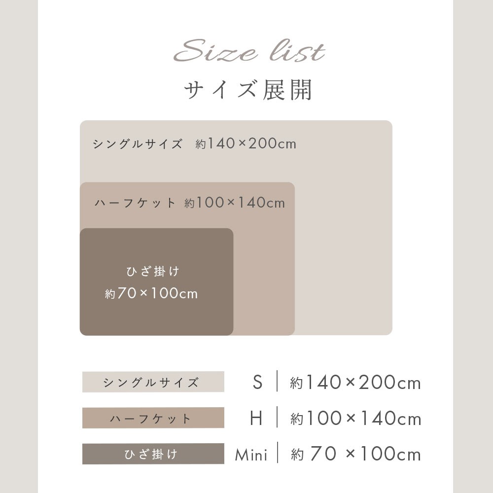 | この商品はシングルサイズ・ハーフサイズ・ひざ掛けサイズの3サイズセットです。 |