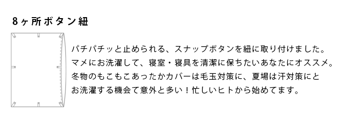 | お取扱い | ![]() ![]() ![]() ![]() ![]() ![]() ![]() ■洗濯ネット使用 ■あて布使用 ■中性洗剤をおすすめします。漂白剤(塩素系・酸素系)の使用はお避け下さい ■家庭用洗濯機で洗えます。空気を含みやすいので、空気を出してからファスナーを閉じ「洗濯ネット」に入れてください。 ■日陰干しをおすすめします。 ■布団を干す時は、カバーを外して干すことをおすすめします。 |
