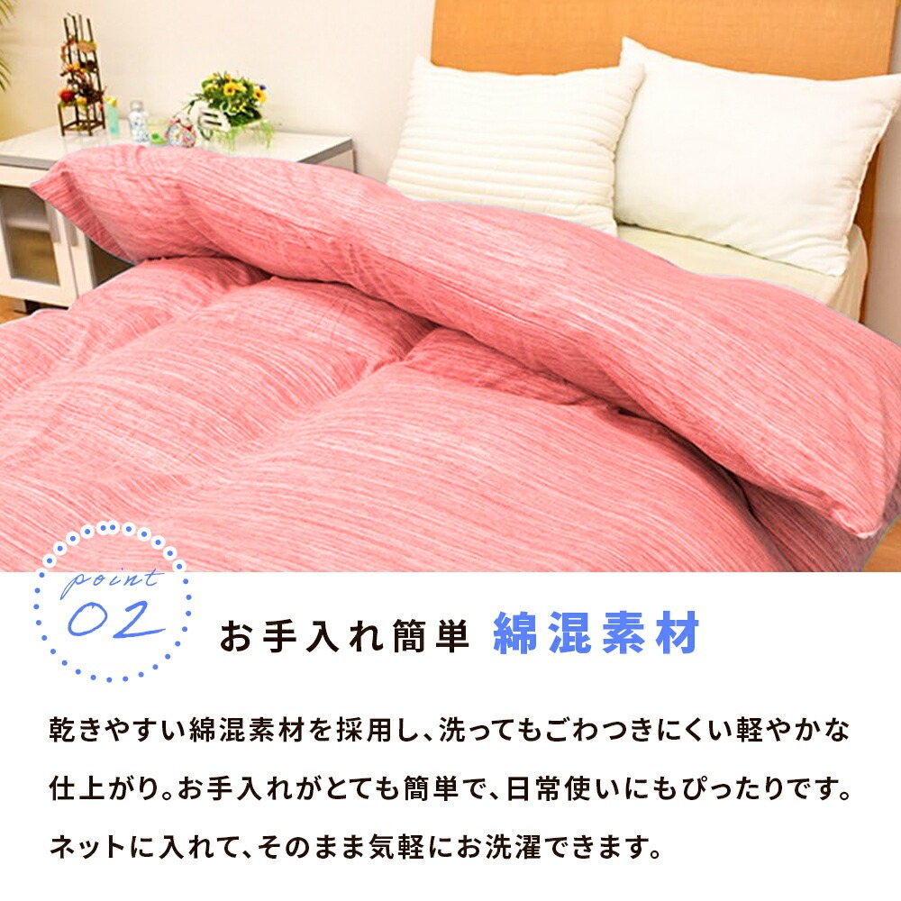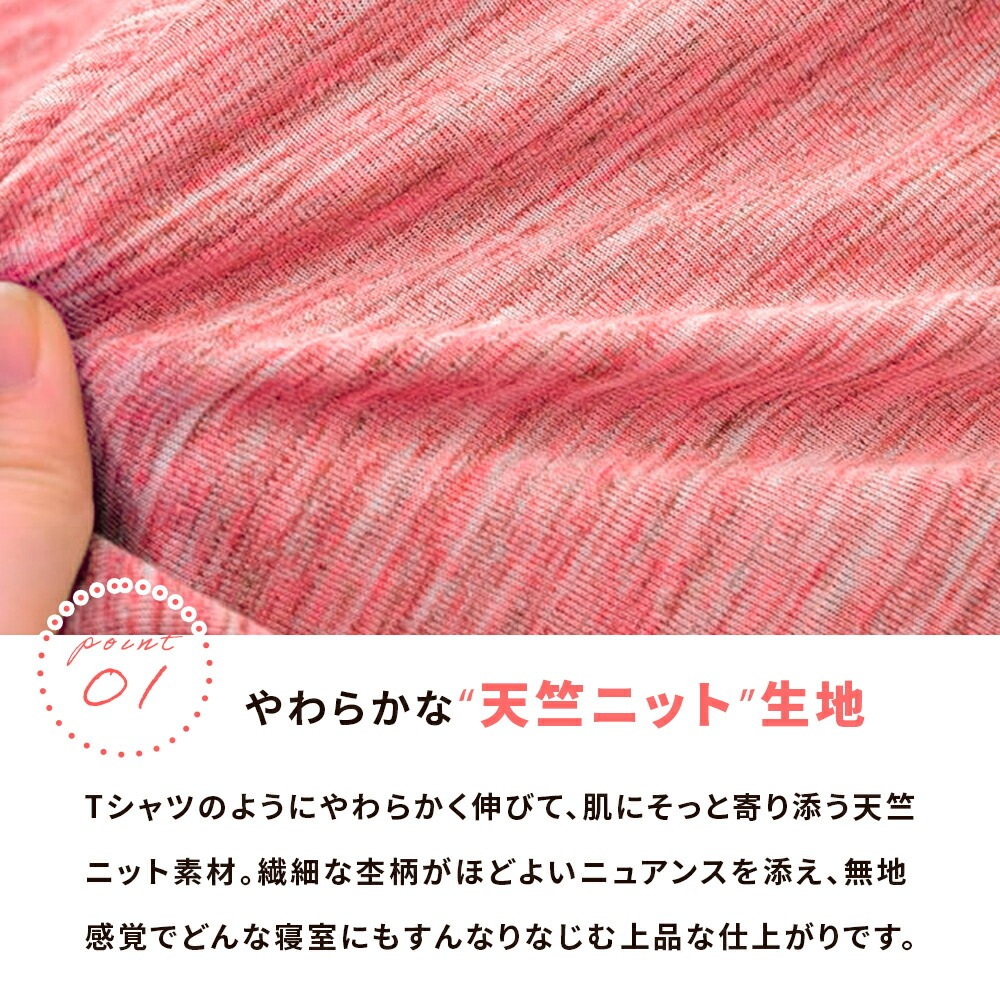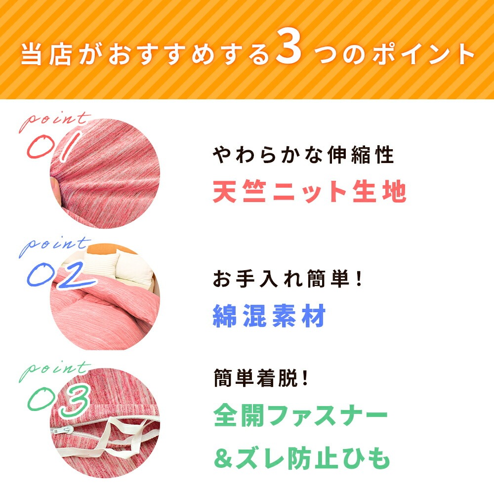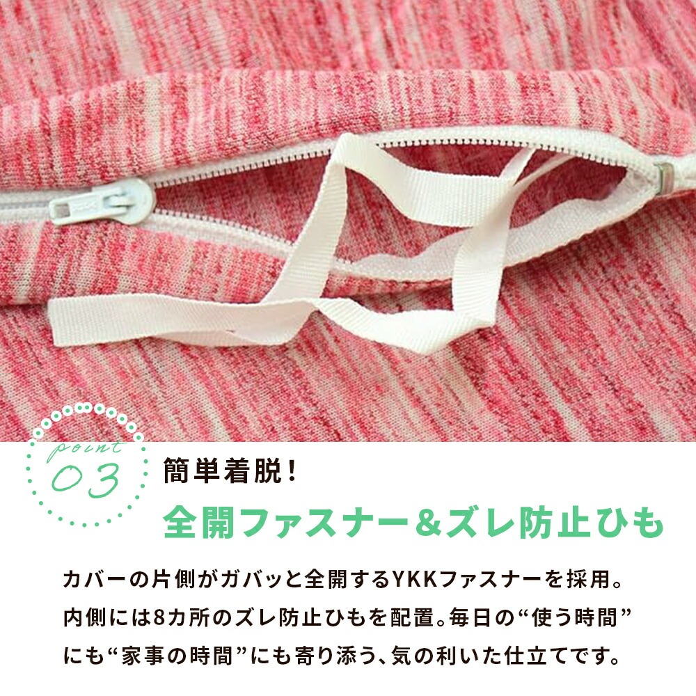 | ・やわらかな“天竺ニット”生地 Tシャツのようにやわらかく伸びて、肌にそっと寄り添う天竺ニット素材。繊細な杢柄がほどよいニュアンスを添え、無地感覚でどんな寝室にもすんなりなじむ上品な仕上がりです。 ・お手入れ簡単 綿混素材乾きやすい綿混素材を採用し、洗ってもごわつきにくい軽やかな仕上がり。お手入れがとても簡単で、日常使いにもぴったりです。ネットに入れて、そのまま気軽にお洗濯できます。 ・簡単着脱!全開ファスナー&ズレ防止ひもカバーの片側がガバッと全開するYKKファスナーを採用。内側には8カ所のズレ防止ひもを配置。毎日の“使う時間”にも“家事の時間”にも寄り添う、気の利いた仕立てです。 | |