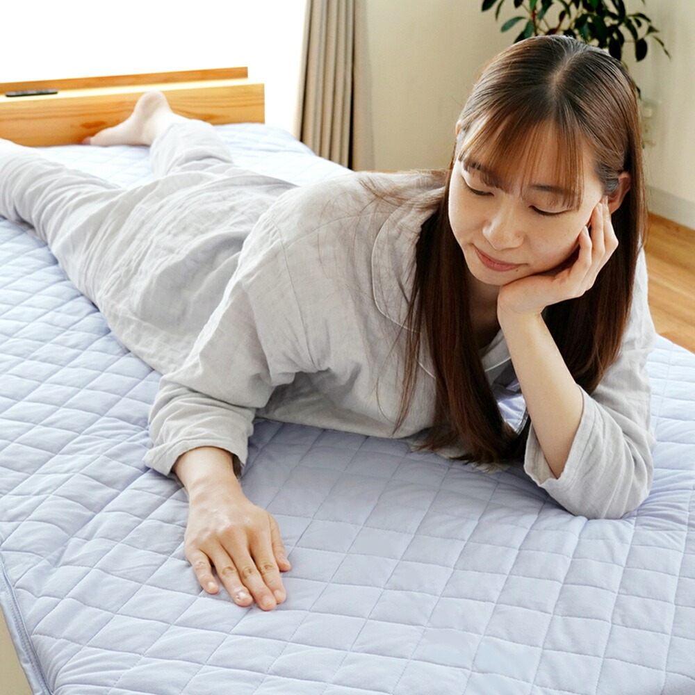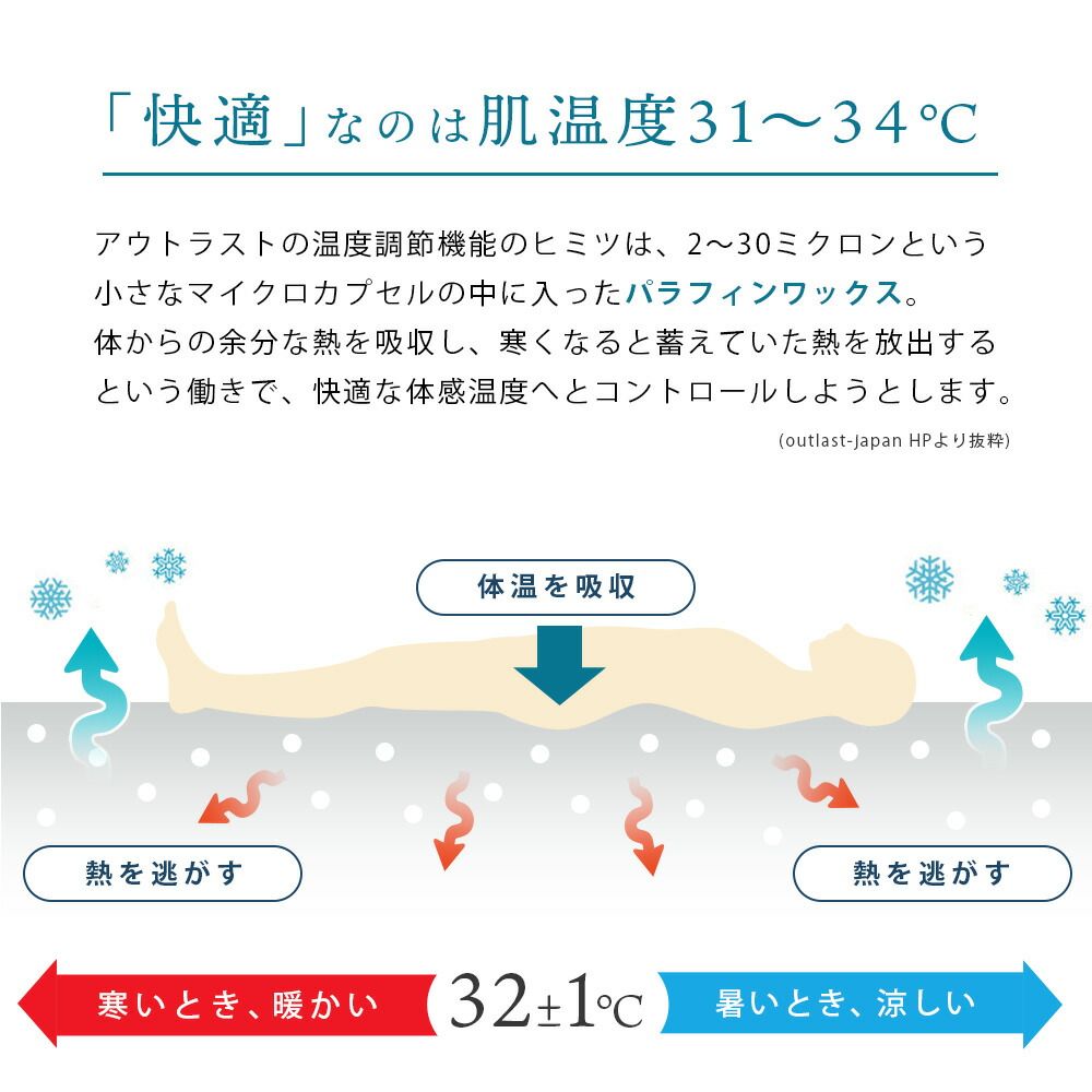 | ・温度コントロール機能で年中快適 NASA開発アウトラストR採用。暑さは吸熱・寒さは放熱し、理想的な温度に近づけます。 アウトラストの温度調節機能のヒミツは、2?30ミクロンという小さなマイクロカプセルの中に入ったパラフィンワックス。 寝汗を素早く吸収し、水分を外に放出する吸放湿性の高い中わたを使用。 直接お肌に触れるものだから「洗える」を条件に選びたい。 ベッドマットレスにも、敷き布団にも使えます。 品質にもこだわりたいという方も安心。 | |