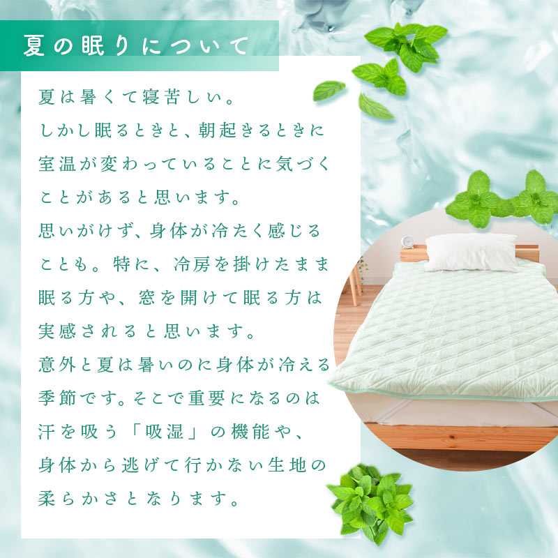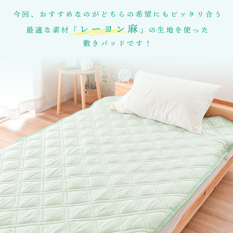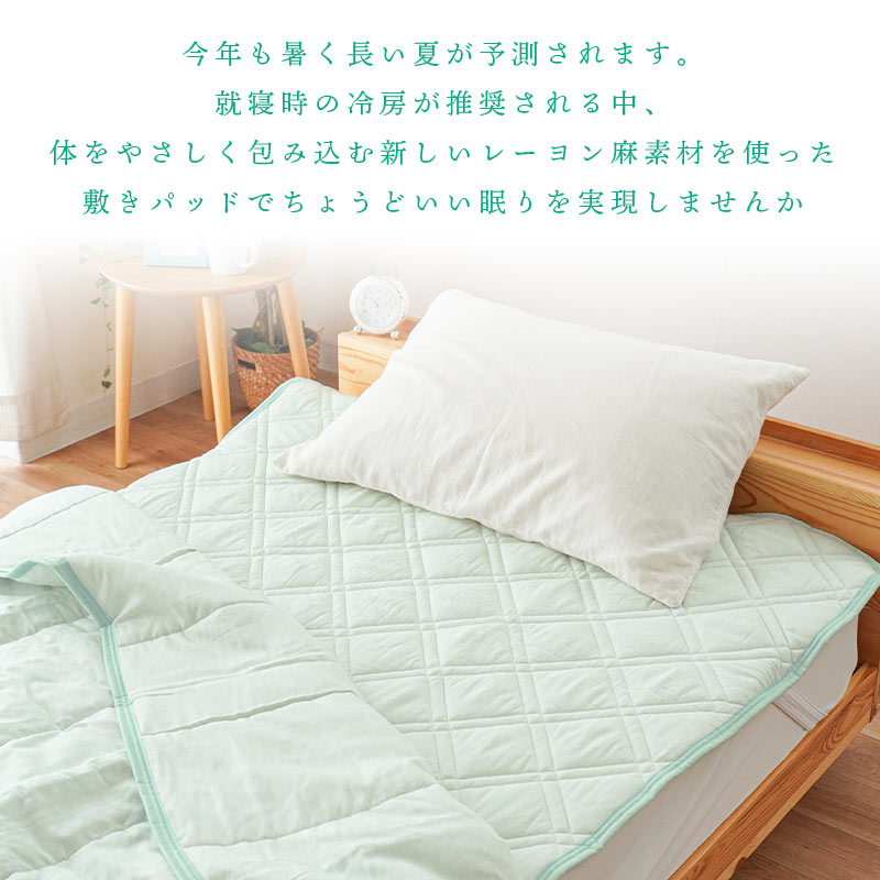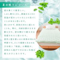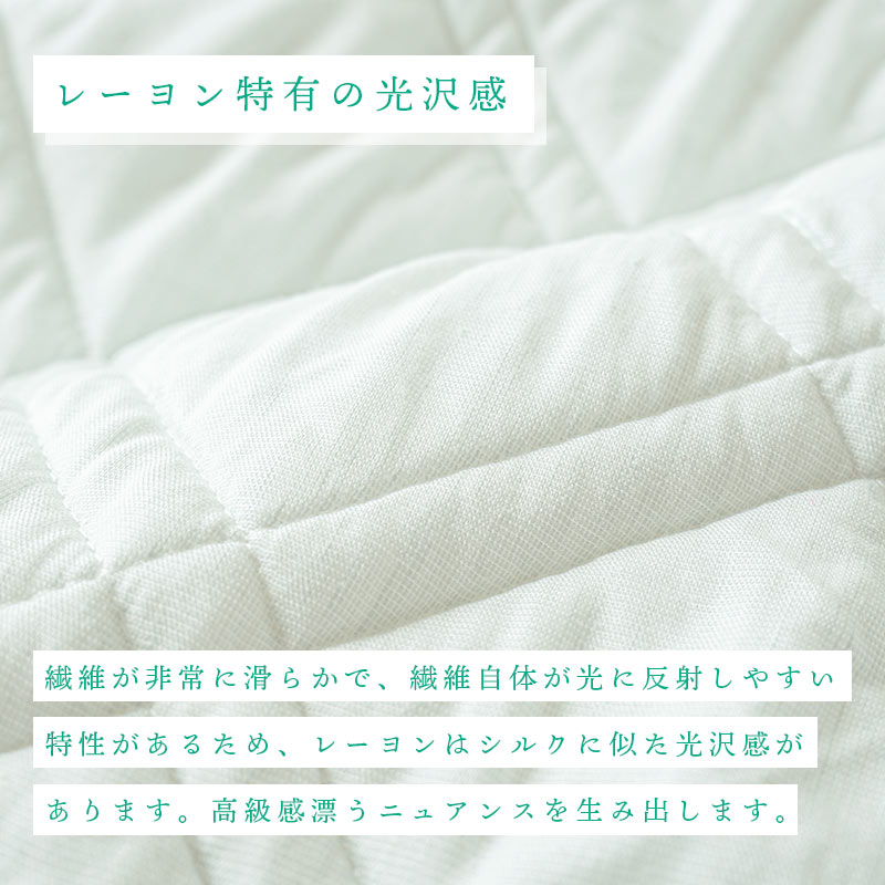 | ・レーヨン素材について レーヨンは植物由来の植物です。柔らかなやさしい肌触りや優れた通気性や吸湿性、なめらかなしなやかさなどの特徴があります。繊維として熱の伝導率が大きい素材なので綿素材よりひんやりする感覚があります。 ・レーヨン特有の光沢感繊維が非常に滑らかで、繊維自体が光に反射しやすい特性があるため、レーヨンはシルクに似た光沢感があります。高級感漂うニュアンスを生み出します。 ・麻素材について昔からの夏の代表的な素材「麻」を組み合わせました。麻もまた熱の伝導率が大きい素材です。高い吸湿・発散性があることや、シャリ感のある清涼感が特徴です。 ・しなやかでやわらかく、シャリっとした生地感柔らかなレーヨン素材と、シャリ感のある麻を組み合わせることで、しなやかでやわらかな肌触りでも、ややシャリ感のある仕上がりになりました。「麻」特有のシャリ感が強すぎることがないので、シャリ感を嫌う方にもおすすめです。 ・ロングシーズン使える触れた時に少し「ひんやり」と涼感のあるレーヨン麻は、晩春から夏、初秋までロングシーズン使えます。暖かい時期の使用におすすめです。 ・西川株式会社×こだわり安眠館オリジナル商品品質にこだわりたいという方も安心。当店と日本有数の寝具メーカー「西川」が共同開発したオリジナルの商品です。 ・洗濯機で丸洗いOK!じゃぶじゃぶ洗えていつも清潔直接お肌に触れるものだから「洗える」を条件に選びたい。洗濯機で丸洗いOKなので、汚れても気軽にご自宅でお洗濯できいつでも清潔にお使いいただけます。 | |