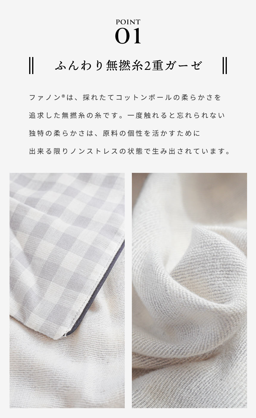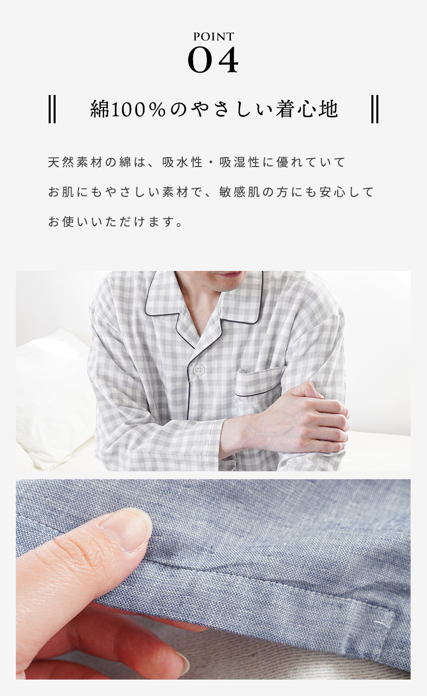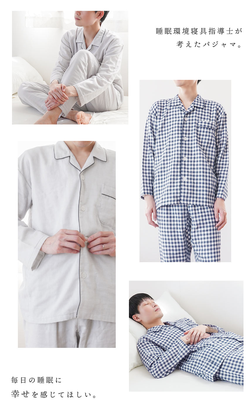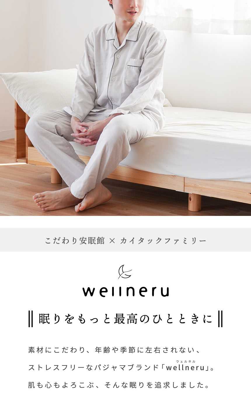 | ・眠りをもっと最高のひとときに 素材にこだわり、年齢や季節に左右されない、ストレスフリーなパジャマブランド「wellneru(ウェルネル)」。睡眠環境寝具指導士が考えたパジャマで毎日の睡眠に幸せを感じてほしい。肌も心もよろこぶ、そんな眠りを追求しました。 ・睡眠に適したパジャマの三要素肌あたり…ソフトで肌触りが良く軽い着心地の無撚糸2重ガーゼ。 パジャマを着ることが眠りのスイッチに。音楽を聞く、アロマを焚く、半身浴をするなど、 さまざまなスリープセレモニーがあります。その中でも、パジャマを着ることは入眠効果が高い方法といわれています。スムーズに眠れない方は、パジャマを着て 寝ることから初めてみませんか? ・ふんわり無撚糸2重ガーゼファノン(R)は、採れたてコットンボールの柔らかさを追求したクラボウ独自の特殊紡績素材です。一度触れると忘れられない独特の柔らかさは、原料の個性を活かすために出来る限りノンストレスの状態で生み出されています。 ・快眠設計で不快感を軽減縫い線をずらして、袖周りのストレスを軽減 パジャマの生産量国内第1位のカイタックファミリー。 パジャマを熟知した職人さんたちの技術やノウハウが詰め込まれた こだわりの一品です。 ・綿100%のやさしい着心地天然素材の綿は、吸水性・吸湿性に優れていてお肌にもやさしい素材で、 敏感肌の方にも安心してお使いいただけます。 | |