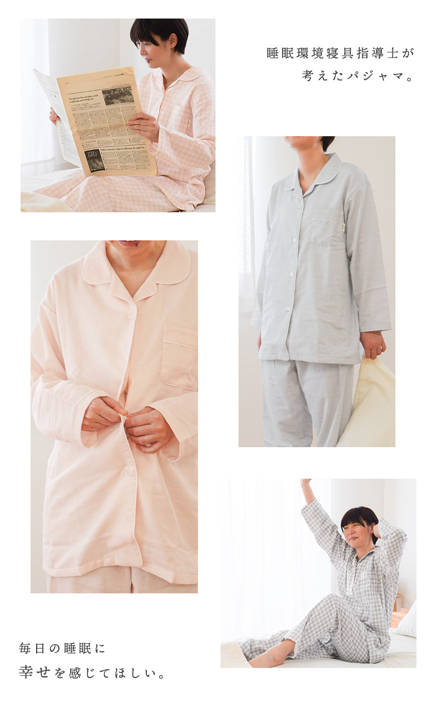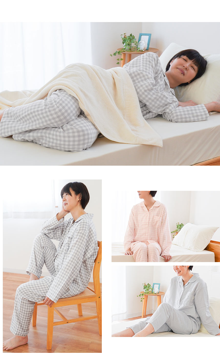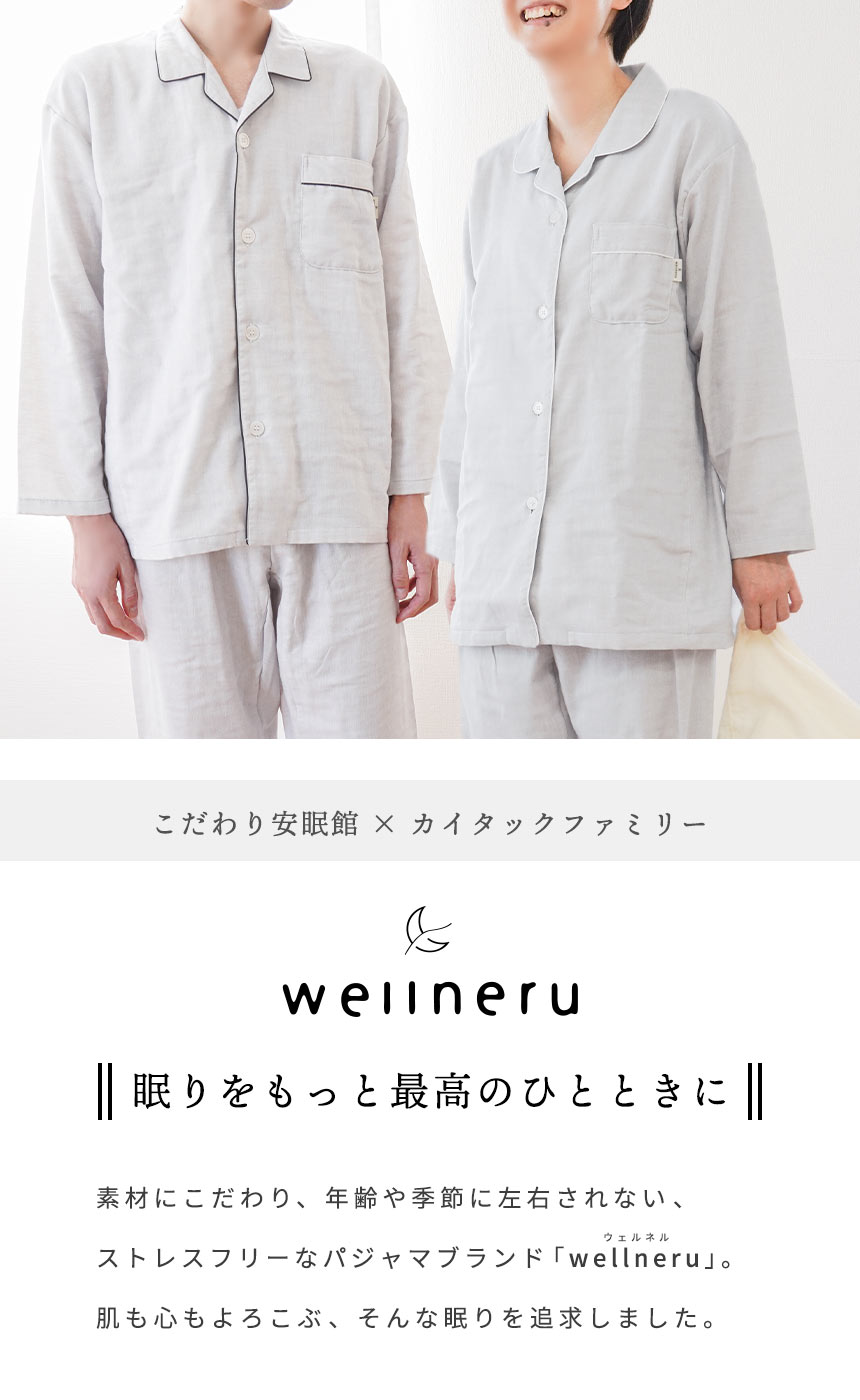 | ・眠りをもっと最高のひとときに 素材にこだわり、年齢や季節に左右されない、ストレスフリーなパジャマブランド「wellneru(ウェルネル)」。 睡眠環境寝具指導士が考えたパジャマで毎日の睡眠に幸せを感じてほしい。肌も心もよろこぶ、そんな眠りを追求しました。 ・睡眠に適したパジャマの三要素肌あたり…ソフトで肌触りが良く軽い着心地の無撚糸2重ガーゼ。 パジャマを着ることが眠りのスイッチに。音楽を聞く、アロマを焚く、半身浴をするなど、 さまざまなスリープセレモニーがあります。その中でも、パジャマを着ることは 入眠効果が高い方法といわれています。スムーズに眠れない方は、パジャマを着て 寝ることから初めてみませんか? ・ふんわり無撚糸2重ガーゼファノン(R)は、採れたてコットンボールの柔らかさを追求したクラボウ独自の特殊紡績素材です。一度触れると忘れられない独特の柔らかさは、原料の個性を活かすために出来る限りノンストレスの状態で生み出されています。 ・快眠設計で不快感を軽減縫い線をずらして、袖周りのストレスを軽減 パジャマの生産量国内第1位のカイタックファミリー。 パジャマを熟知した職人さんたちの技術やノウハウが詰め込まれた こだわりの一品です。 ・綿100%のやさしい着心地天然素材の綿は、吸水性・吸湿性に優れていてお肌にもやさしい素材で、 敏感肌の方にも安心してお使いいただけます。 | |