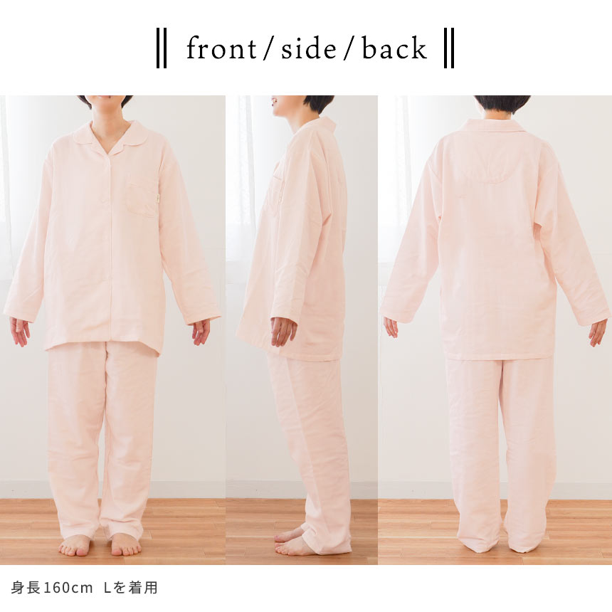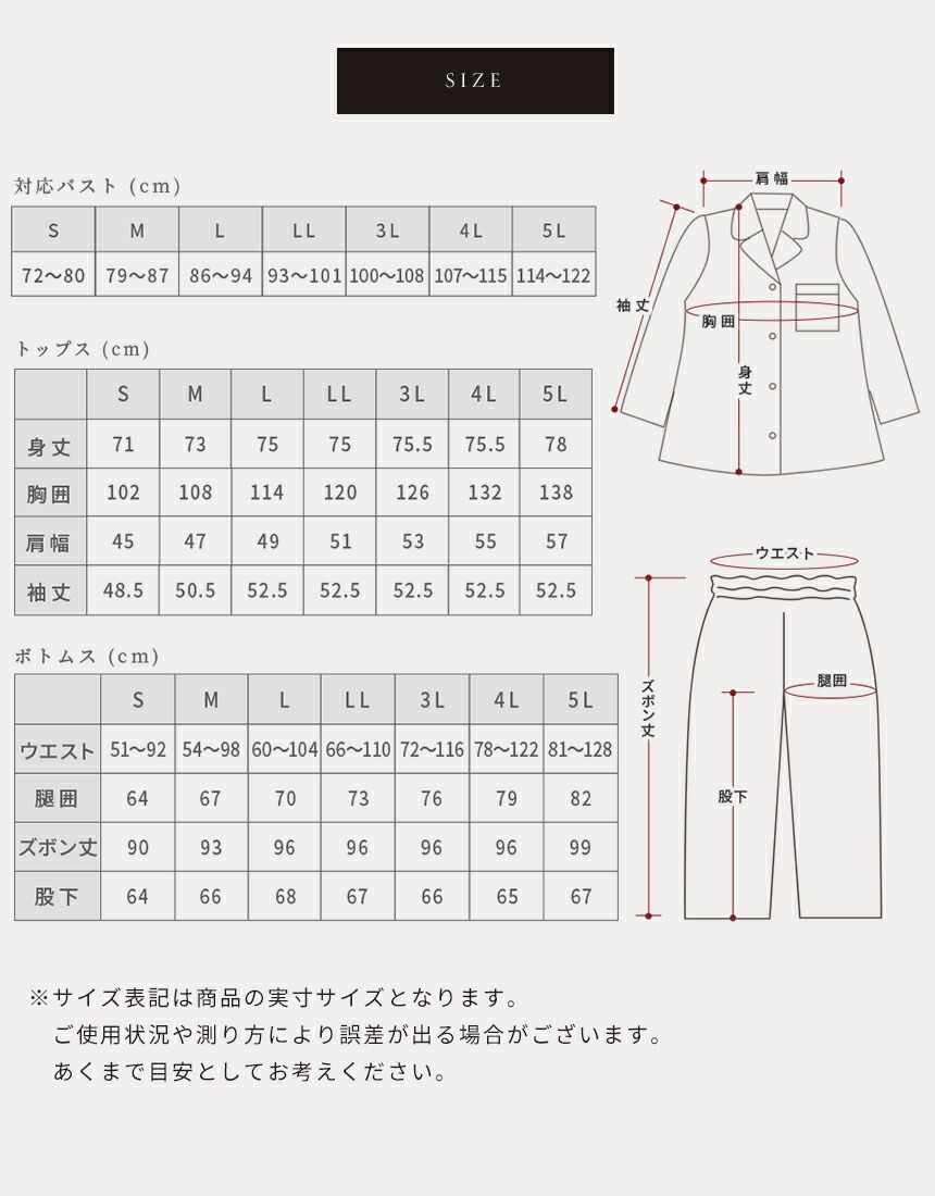 | 商品サイズ | 【上着】 [S] 身丈71cm、胸囲102cm、肩幅45cm、袖丈48.5cm [M] 身丈73cm、胸囲108cm、肩幅47cm、袖丈50.5cm [L] 身丈75cm、胸囲114cm、肩幅49cm、袖丈52.5cm [LL] 身丈75cm、胸囲120cm、肩幅51cm、袖丈52.5cm [3L] 身丈75.5cm、胸囲126cm、肩幅53cm、袖丈52.5cm [4L] 身丈75.5cm、胸囲132cm、肩幅55cm、袖丈52.5cm [5L] 身丈78cm、胸囲138cm、肩幅57cm、袖丈52.5cm 【パンツ】 [S] ウエスト51〜92cm、ヒップ囲64cm、ズボン丈90cm、股下64cm [M] ウエスト54〜98cm、ヒップ囲67cm、ズボン丈93cm、股下66cm [L] ウエスト60〜104cm、ヒップ囲70cm、ズボン丈96cm、股下68cm [LL] ウエスト66〜110cm、ヒップ囲73cm、ズボン丈96cm、股下67cm [3L] ウエスト72〜116cm、ヒップ囲76cm、ズボン丈96cm、股下66cm [4L] ウエスト78〜122cm、ヒップ囲79cm、ズボン丈96cm、股下65cm [5L] ウエスト81〜128cm、ヒップ囲82cm、ズボン丈99cm、股下67cm ※誤差の出る場合がありますのであくまで目安としてお考えください。 実寸サイズ表はこちら |