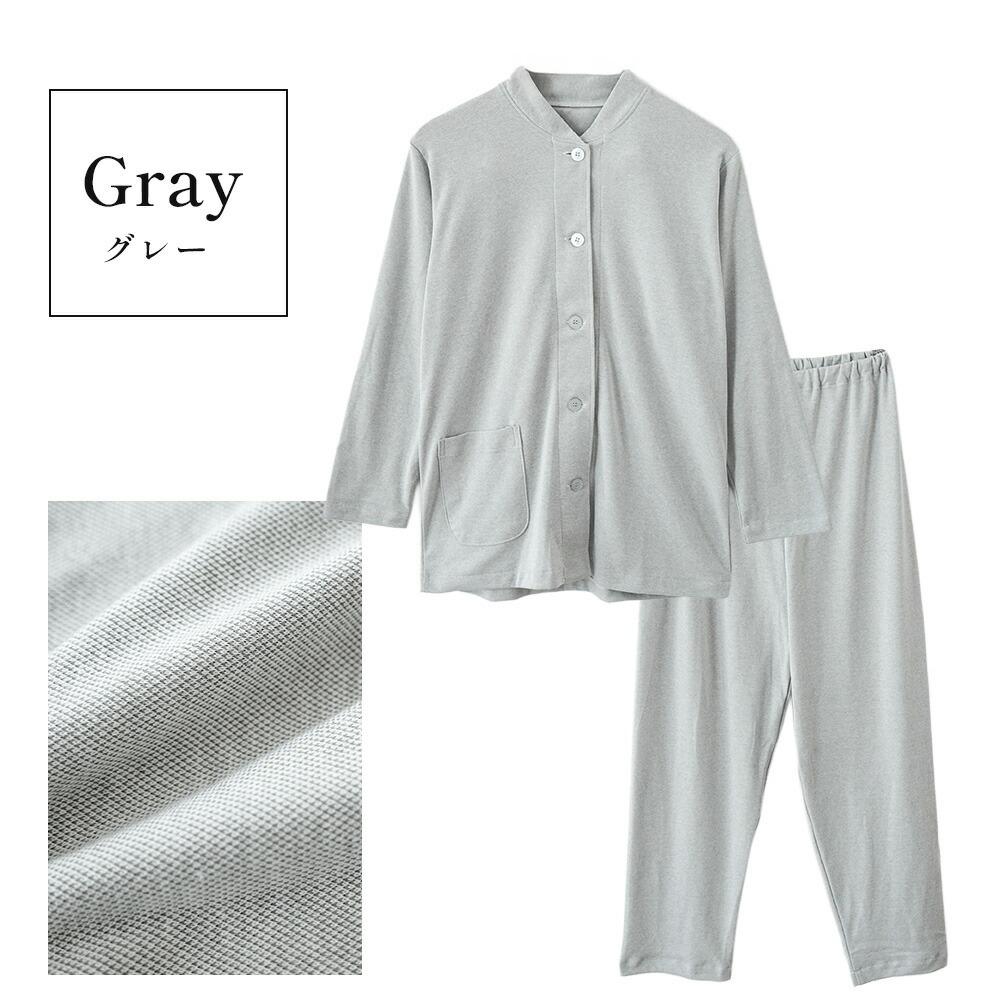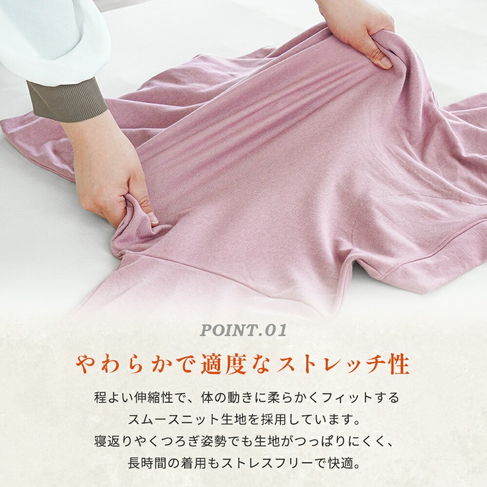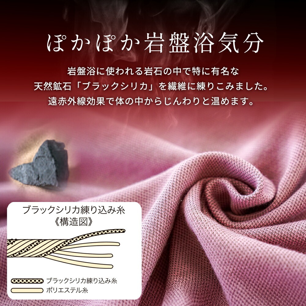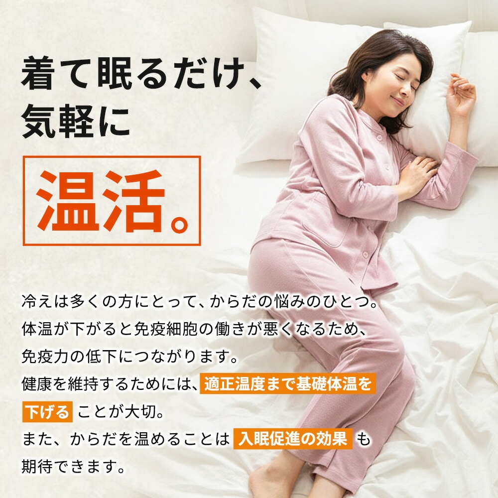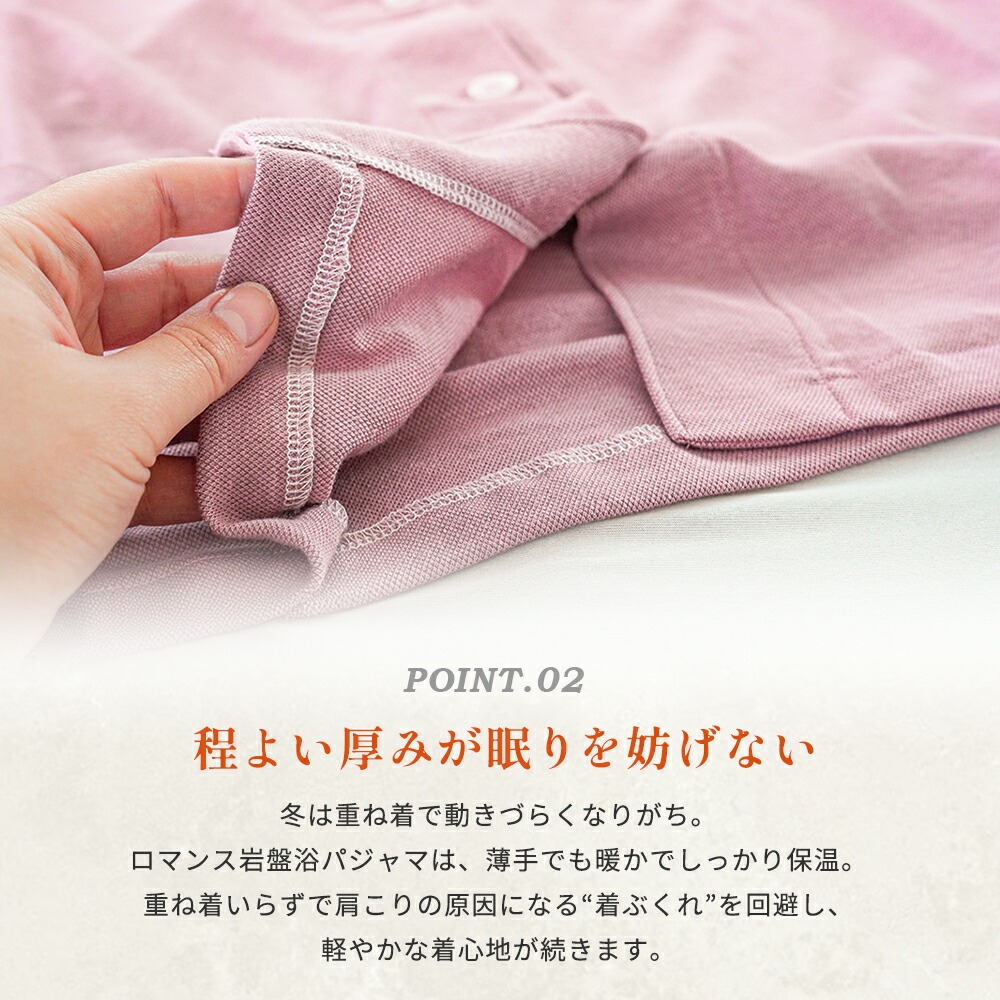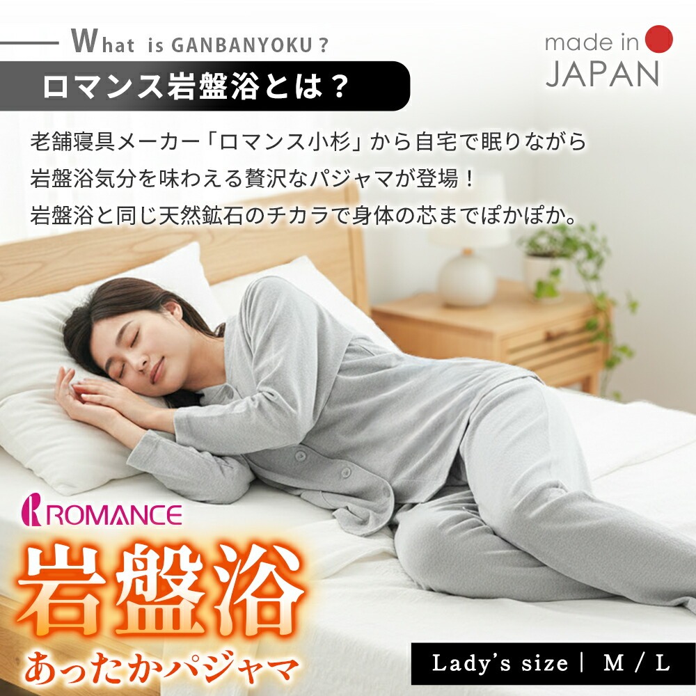 | ・着て眠るだけ、気軽に温活。 冷えは多くの方にとって、からだの悩みのひとつ。体温が下がると免疫細胞の働きが悪くなるため、免疫力の低下につながります。健康を維持するためには、適正温度まで基礎体温を下げることが大切。また、からだを温めることは入眠促進の効果も期待できます。 ・ロマンス岩盤浴とは?老舗寝具メーカー「ロマンス小杉」から自宅で眠りながら岩盤浴気分を味わえる贅沢なパジャマが登場!岩盤浴と同じ天然鉱石のチカラで身体の芯までぽかぽか。 ・ぽかぽか岩盤浴気分岩盤浴に使われる岩石の中で特に有名な天然鉱石「ブラックシリカ」を繊維に練りこみました。遠赤外線効果で体の中からじんわりと温めます。 ・やわらかで適度なストレッチ性程よい伸縮性で、体の動きに柔らかくフィットするスムースニット生地を採用しています。寝返りやくつろぎ姿勢でも生地がつっぱりにくく、長時間の着用もストレスフリーで快適。 ・程よい厚みが眠りを妨げない冬は重ね着で動きづらくなりがち。ロマンス岩盤浴パジャマは、薄手でも暖かでしっかり保温。重ね着いらずで肩こりの原因になる“着ぶくれ”を回避し、軽やかな着心地が続きます。 | |