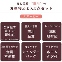 | ご使用上の注意事項 | ■対象年齢:24ヶ月以上 ■この商品は、あくまでもお昼寝用としてのおふとんですので、長時間の睡眠には適しておりません。 ■うつぶせ寝でのご使用はお避けください。 ■製品に表示されている方法でお洗いください。 |
