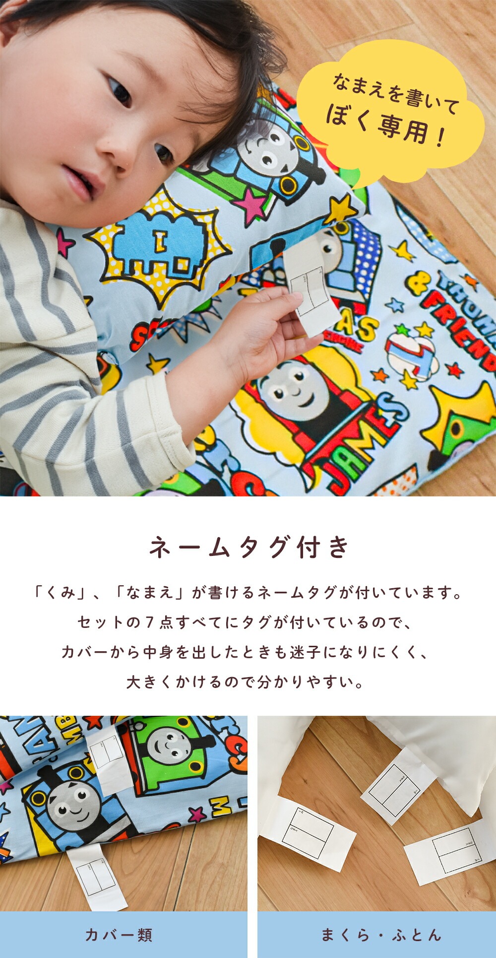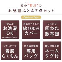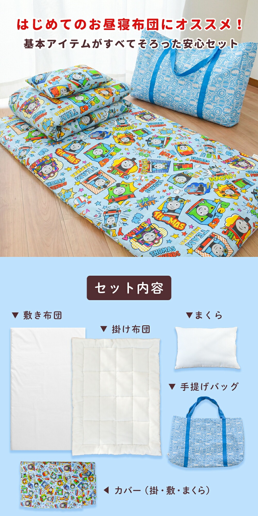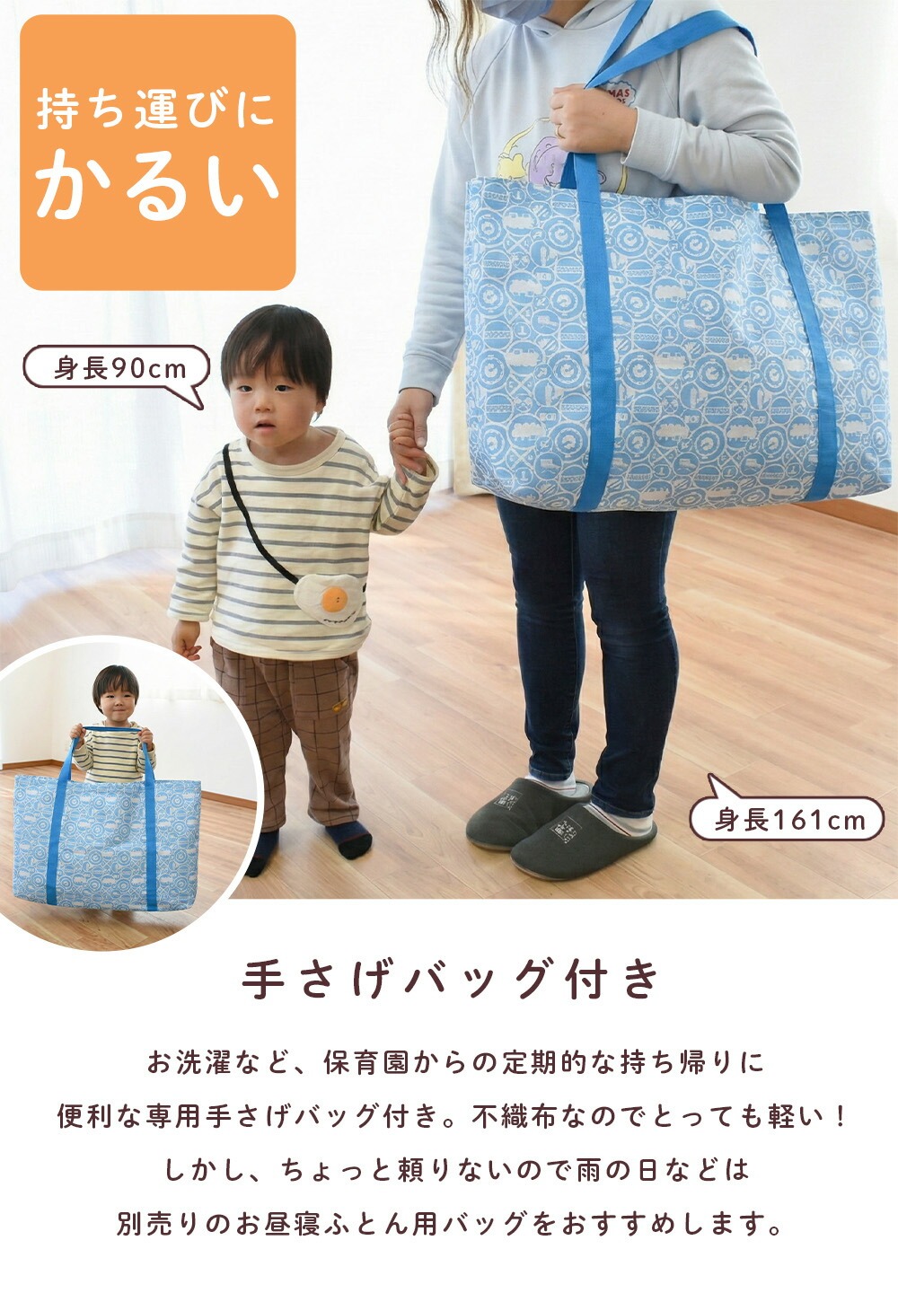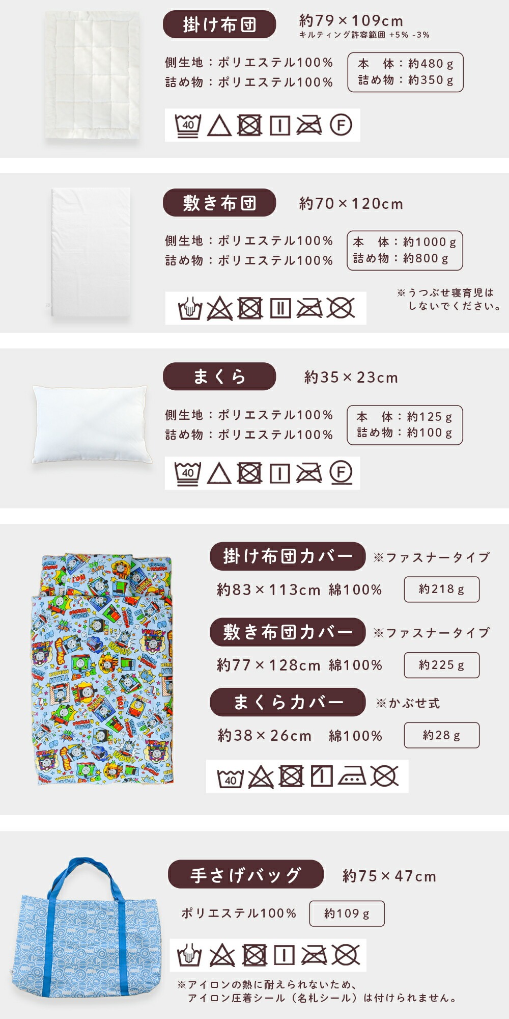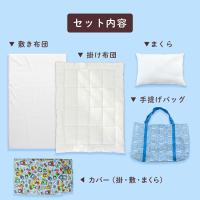 | ・ぜんぶ洗える カバー類はもちろん、まくら、掛け布団、敷き布団までも手洗いですがご家庭で洗えます。 中わたがおよそ800gも入ったボリュームタイプ。 ボリュームの差は一目瞭然! 掛け布団カバーと敷き布団カバーは、取り付け・取り外しがしやすいファスナー式。 お洗濯など、保育園からの定期的な持ち帰りに便利な専用手さげバッグ付き。 「くみ」、「なまえ」が書けるネームタグが付いています。 | |