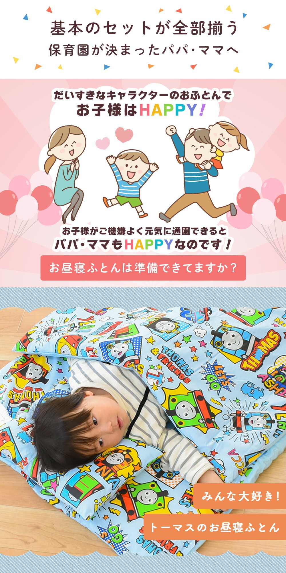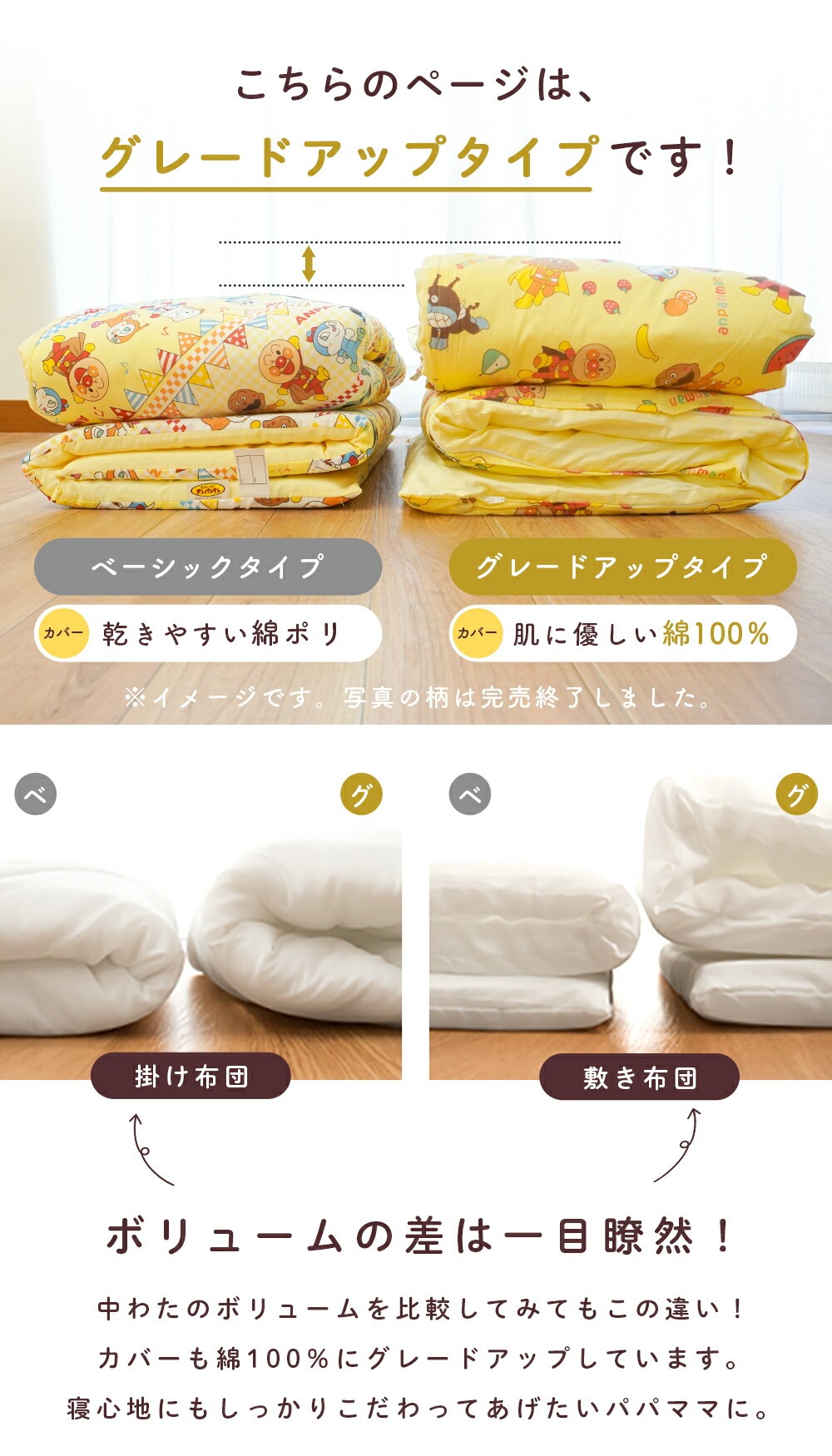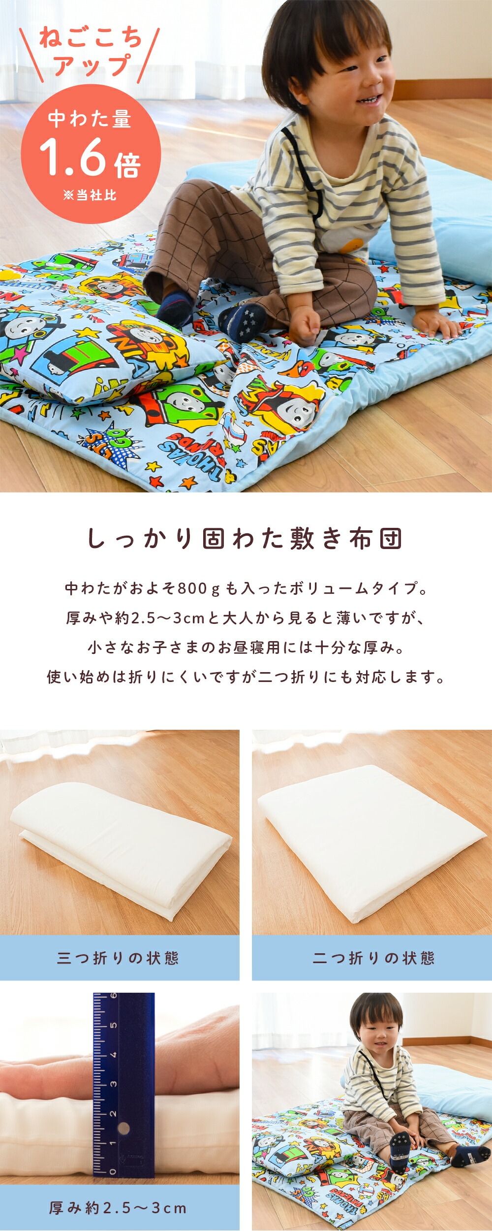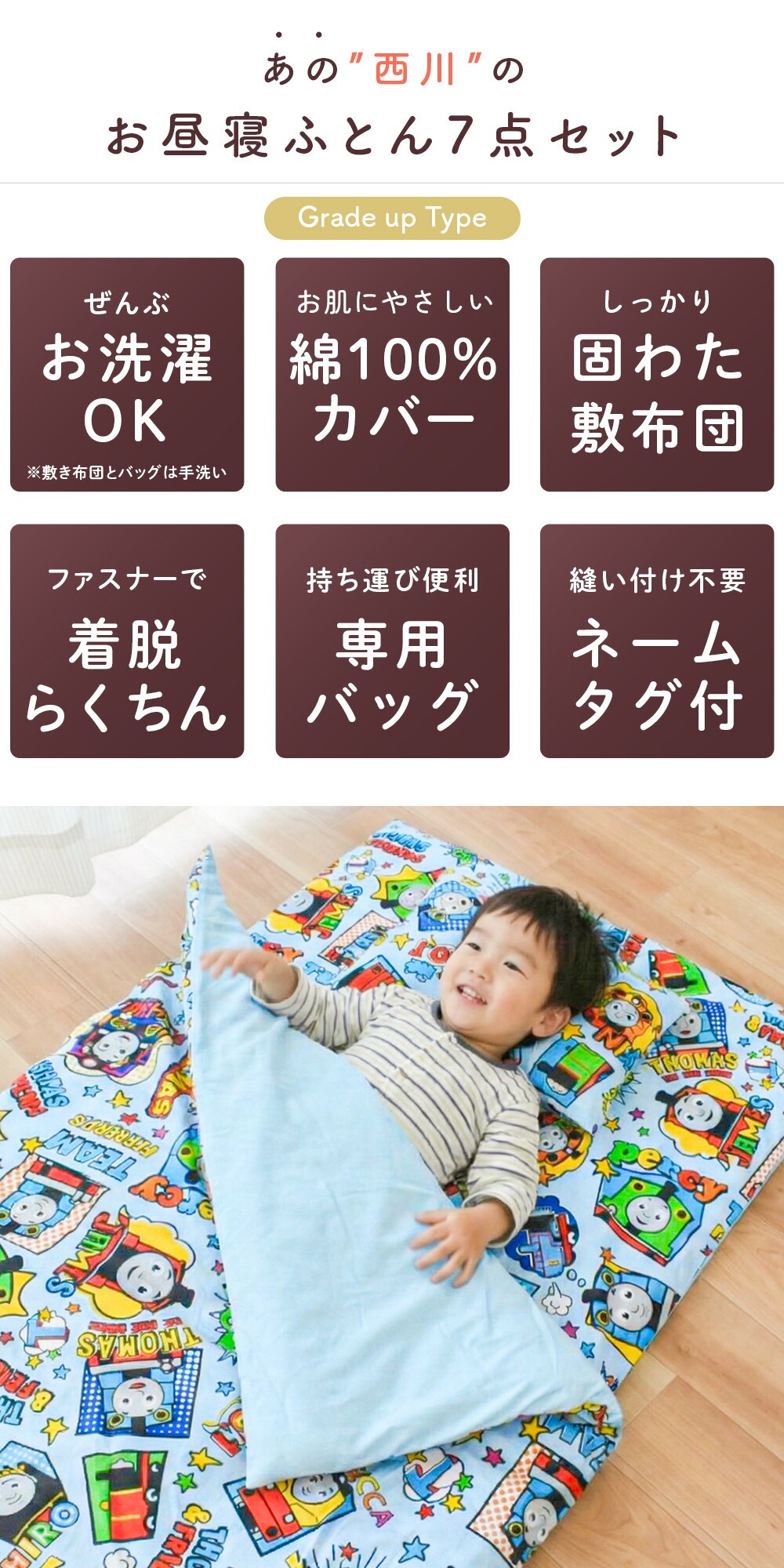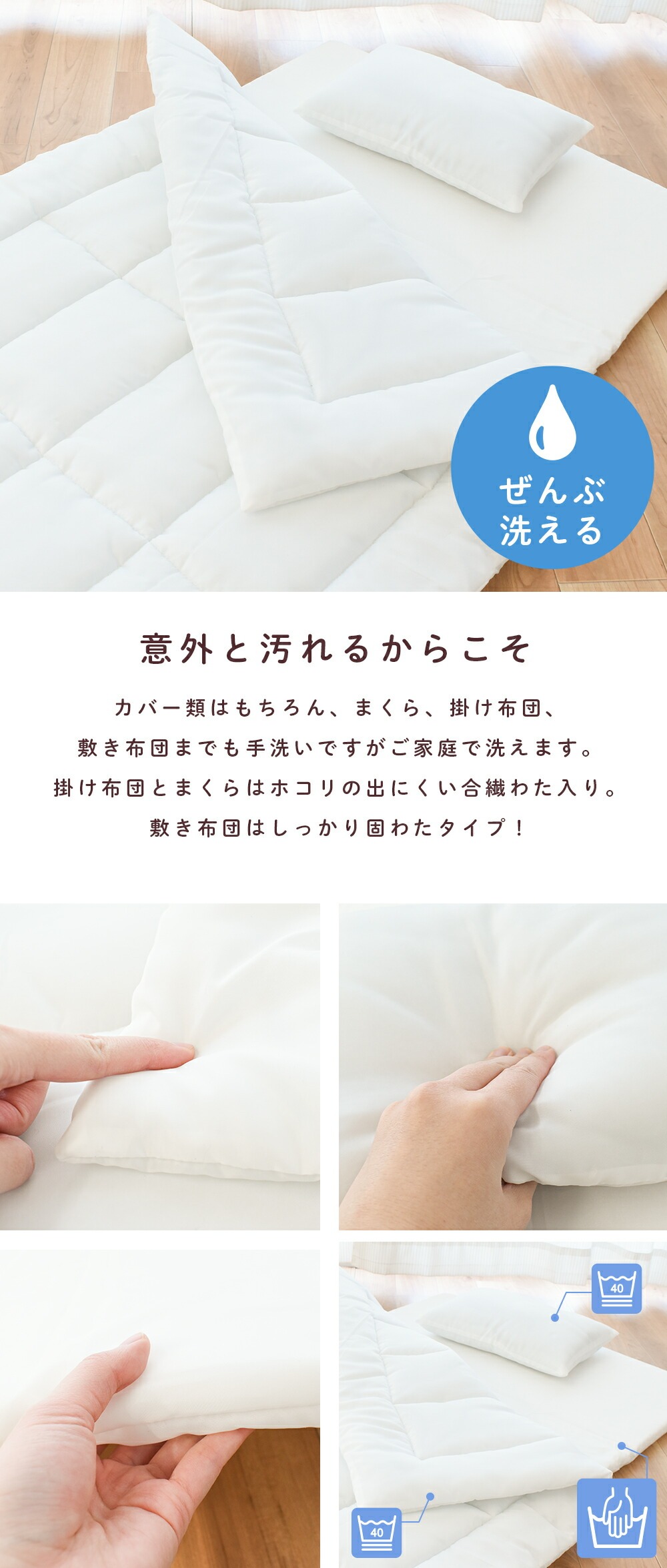 | ・ぜんぶ洗える カバー類はもちろん、まくら、掛け布団、敷き布団までも手洗いですがご家庭で洗えます。 中わたがおよそ800gも入ったボリュームタイプ。 ボリュームの差は一目瞭然! 掛け布団カバーと敷き布団カバーは、取り付け・取り外しがしやすいファスナー式。 お洗濯など、保育園からの定期的な持ち帰りに便利な専用手さげバッグ付き。 「くみ」、「なまえ」が書けるネームタグが付いています。 | |