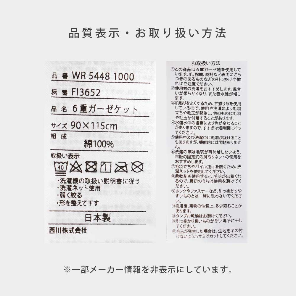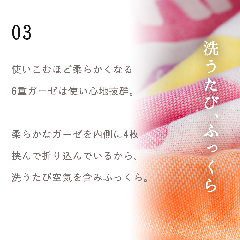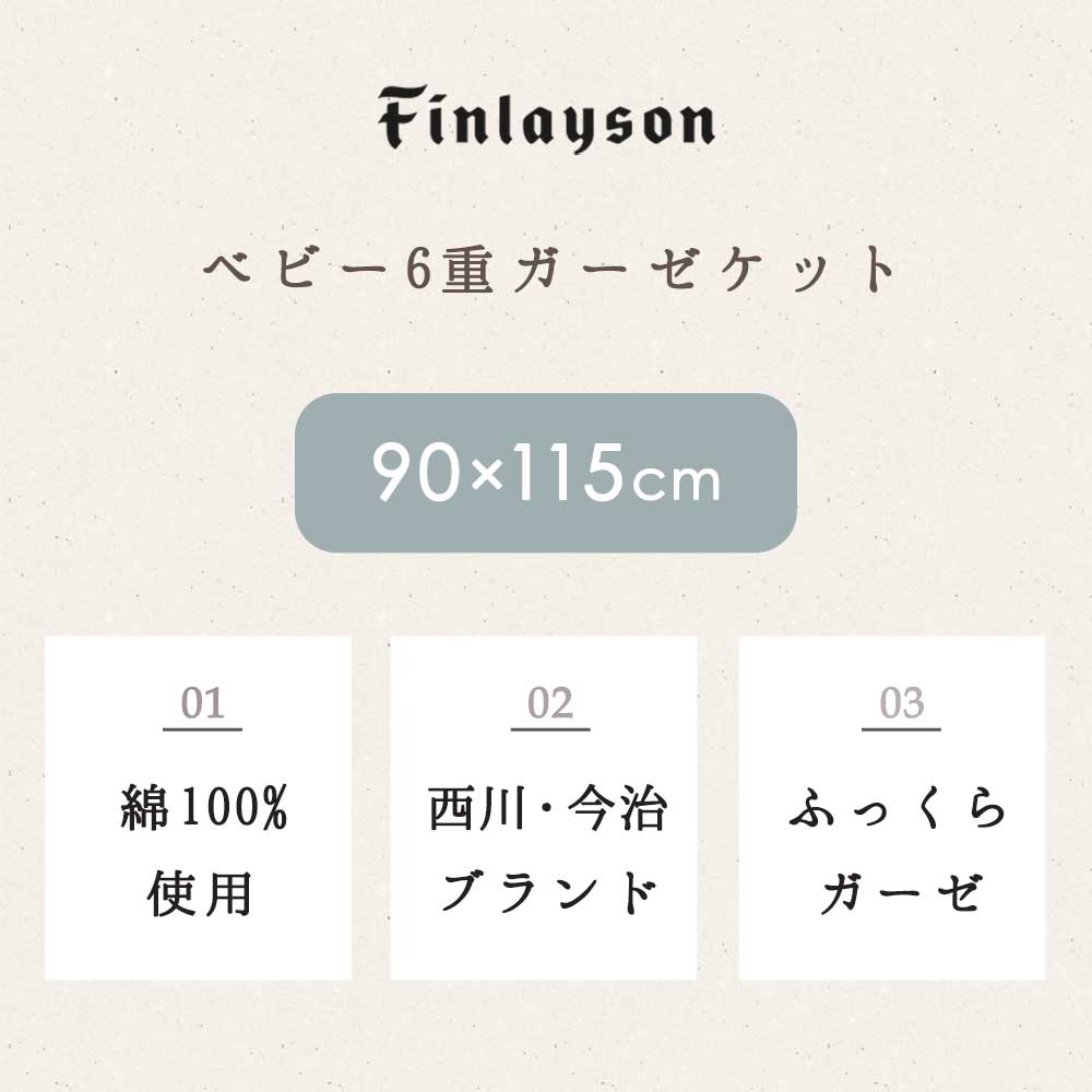 | ・綿100%使用 お肌に優しい綿を100%使用しました。蒸れにくく吸湿性に優れているので、体温調整の苦手な赤ちゃんでも安心の素材。化学繊維にはない綿の優しさを実感してください。 ・ふっくら6重ガーゼ使いこむほど柔らかくなる6重ガーゼは使い心地抜群。柔らかなガーゼを内側に4枚挟んで折り込んでいるから、洗うたび空気を含みふっくら。 ・西川製・日本製創業400年を超える老舗寝具店の西川製。信頼の実績と確かなクオリティで、普段使いはもちろんギフトにもピッタリの商品です。 ・今治タオルブランド認証優れた吸水性と安全が今治タオルの証。 今治タオルのブランドマーク&ロゴは、日本最大のタオル産地「今治」で、独自の品質基準に合格したタオルのみに付与されます。 ・フィンレイソン北欧フィンランド生まれの「フィンレイソン」は、1820年から続くテキスタイルブランドです。シンプルかつ洗練されたデザインと、信頼の品質、北欧の豊かな自然や季節の移ろいをモチーフにしたホームテキスタイルが魅力です。 | |