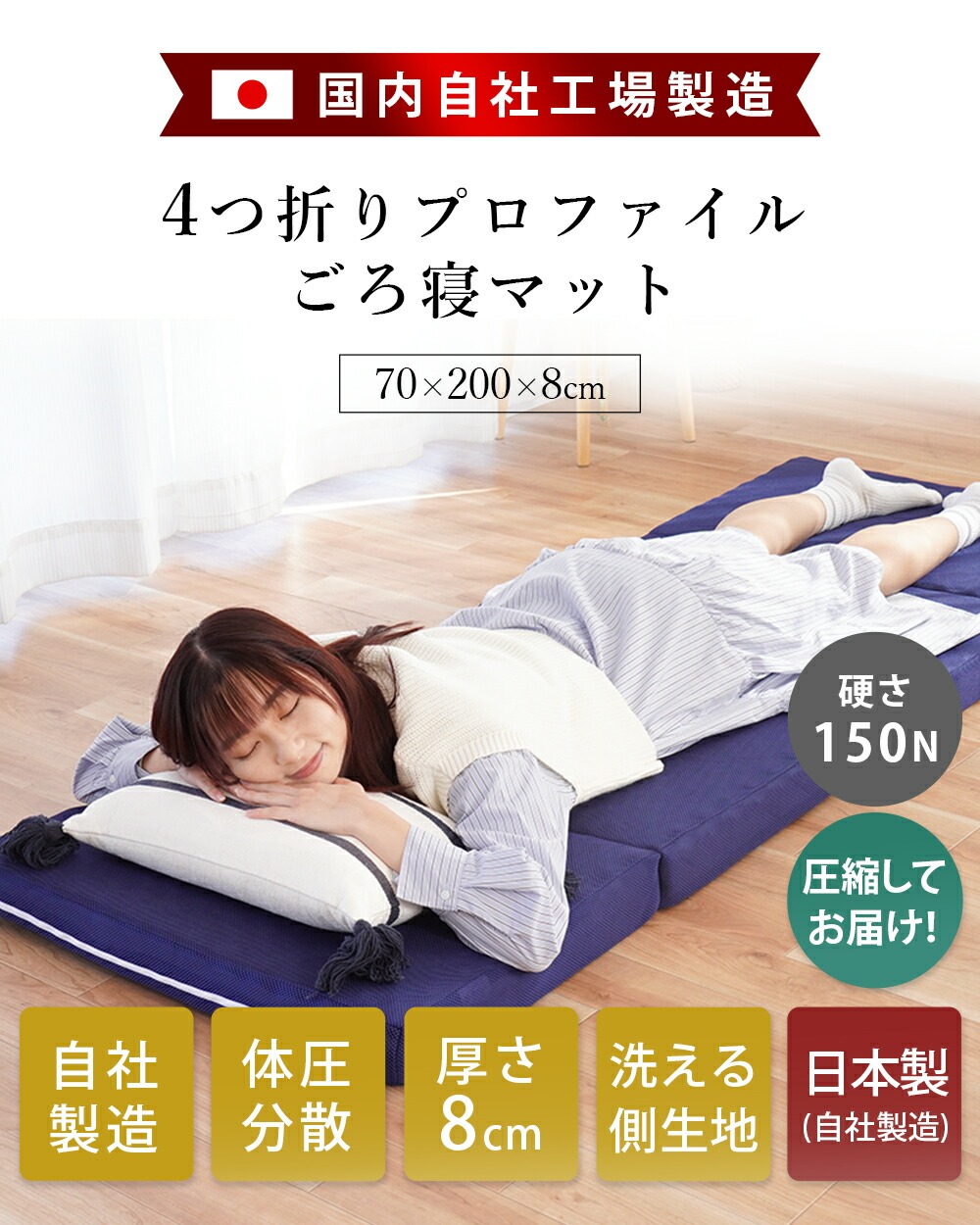 | ・国内自社工場から"安心の眠り"をお届け。 【日本国産ウレタン使用】品評に定評のある、高品質な国産ウレタンフォームを使用しています。 お部屋のスペースが限られている方、コンパクトに楽に収納したい方、小柄な方やお子様用に、もしもの来客用におすすめなごろ寝サイズ。 ・丁度いい硬さの150N高反発ウレタン高い反発力と程よいクッション性で身体が沈み込みすぎず、快適にお使いいただけます。 ・理想的な寝姿勢をキープする形状一つ一つの「点」が優しく全身を支えてくれます。この形状で身体に合わせて体圧分散し、立ち姿に近い理想の寝姿勢をキープします。 ・底付き感のないしっかりとした寝心地床に直接敷いても底付き感がなく、しっかりとしたクッション性のある寝心地です。 側生地はサラッとした肌触りで通気性が抜群のメッシュ素材を使用しています。側面にはファスナーが付いているため、外して丸洗いが可能です。 マットレスを圧縮することで、スムーズな搬入やコスト削減に。 | |