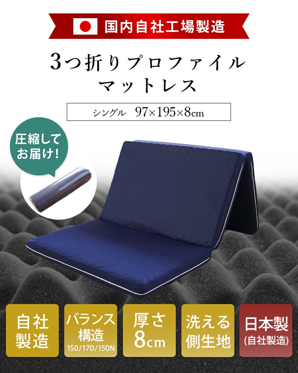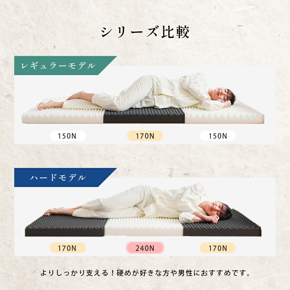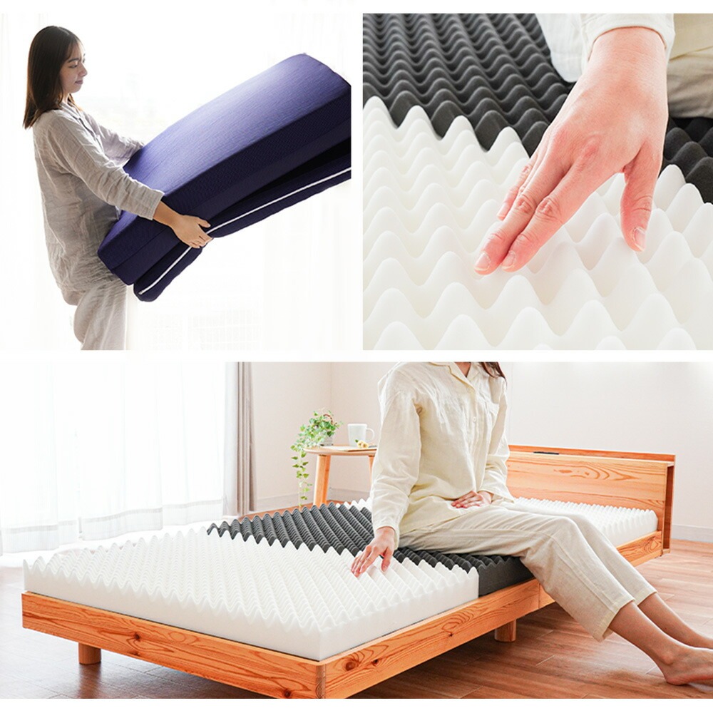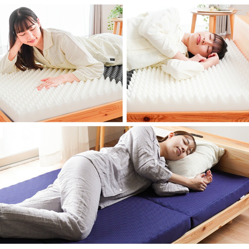 | ・自社製造で安心安全 【日本国産ウレタン使用】品質に定評のある、高品質なウレタンフォームを使用しています。 特に体重のかかる中央部分(腰部)を硬めにしたバランス構造。背中、腰部分の沈み込みが少なく、腰への負担を軽減します。腰痛でお悩みの方にもおすすめです。 ・硬めの高反発ウレタンが寝返りをサポート高い反発力・程よいクッション性で寝返りをサポート。寝返りをすることで血行を促し、身体の負担を軽減するとともに、身体と敷き布団の間にある湿気を発散してくれます。 ・理想的な寝姿勢をキープする形状一つ一つの「点」が優しく全身を支えてくれます。この形状で身体に合わせて体圧分散し、立ち姿に近い理想の寝姿勢をキープします。 ・底付き感のないしっかりとした寝心地床に直接敷いても底付き感がなく、しっかりとしたクッション性のある寝心地です。 側生地はサラッとした肌触りで通気性が抜群のメッシュ素材を使用しています。側面にはファスナーが付いているため、外して丸洗いが可能です。 折りたたみ簡単な三つ折りタイプ。使わないときは立てかけて湿気対策ができます。コンパクトに収納できるので来客用にもおすすめです。 ・搬入しやすいロール梱包でお届けマットレスを圧縮することで、スムーズな搬入やコスト削減に。 | |