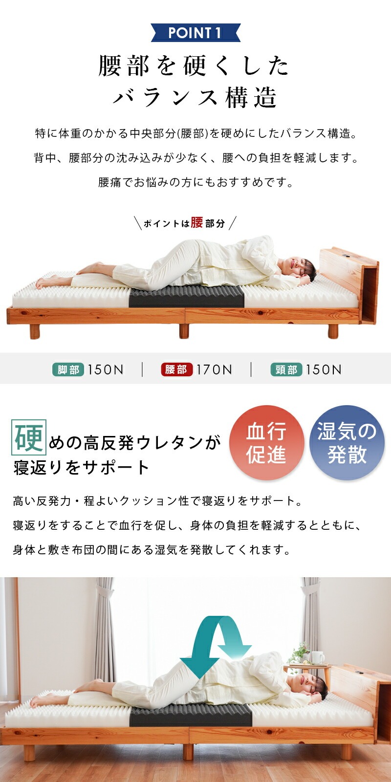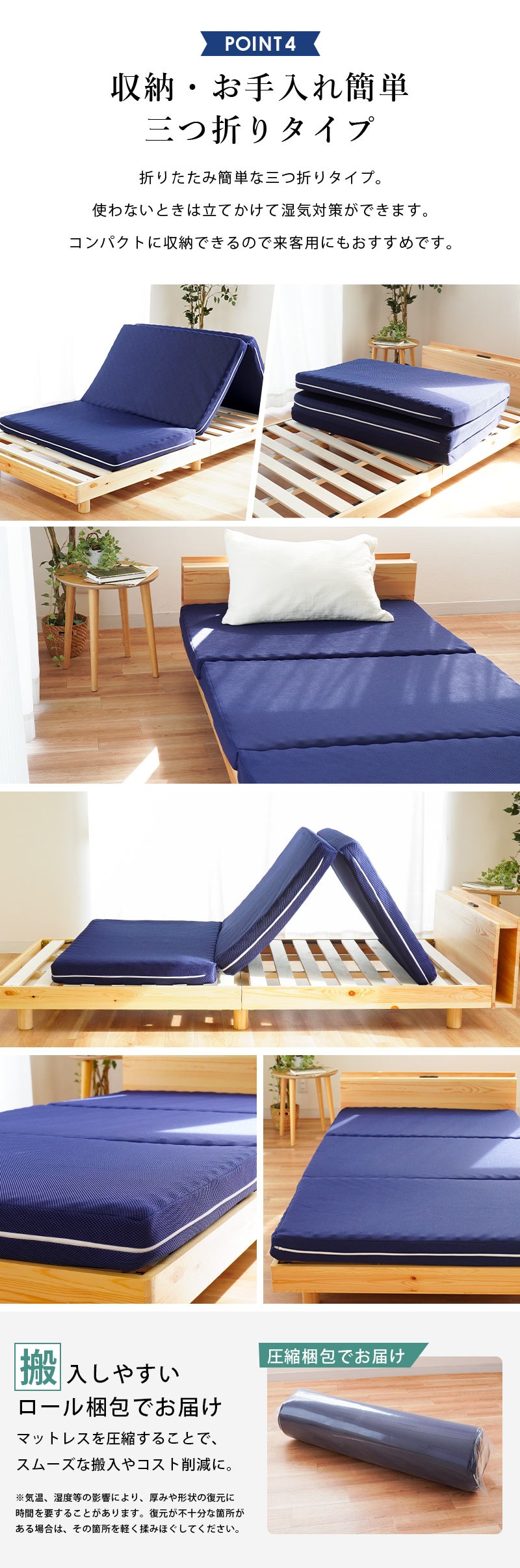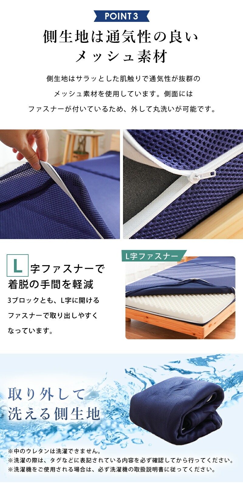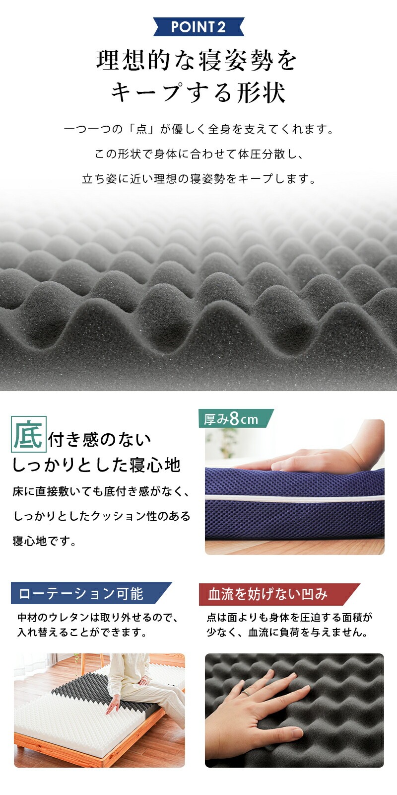 | ・自社製造で安心安全 【日本国産ウレタン使用】品質に定評のある、高品質なウレタンフォームを使用しています。 特に体重のかかる中央部分(腰部)を硬めにしたバランス構造。背中、腰部分の沈み込みが少なく、腰への負担を軽減します。腰痛でお悩みの方にもおすすめです。 ・硬めの高反発ウレタンが寝返りをサポート高い反発力・程よいクッション性で寝返りをサポート。寝返りをすることで血行を促し、身体の負担を軽減するとともに、身体と敷き布団の間にある湿気を発散してくれます。 ・理想的な寝姿勢をキープする形状一つ一つの「点」が優しく全身を支えてくれます。この形状で身体に合わせて体圧分散し、立ち姿に近い理想の寝姿勢をキープします。 ・底付き感のないしっかりとした寝心地床に直接敷いても底付き感がなく、しっかりとしたクッション性のある寝心地です。 側生地はサラッとした肌触りで通気性が抜群のメッシュ素材を使用しています。側面にはファスナーが付いているため、外して丸洗いが可能です。 折りたたみ簡単な三つ折りタイプ。使わないときは立てかけて湿気対策ができます。コンパクトに収納できるので来客用にもおすすめです。 ・搬入しやすいロール梱包でお届けマットレスを圧縮することで、スムーズな搬入やコスト削減に。 | |