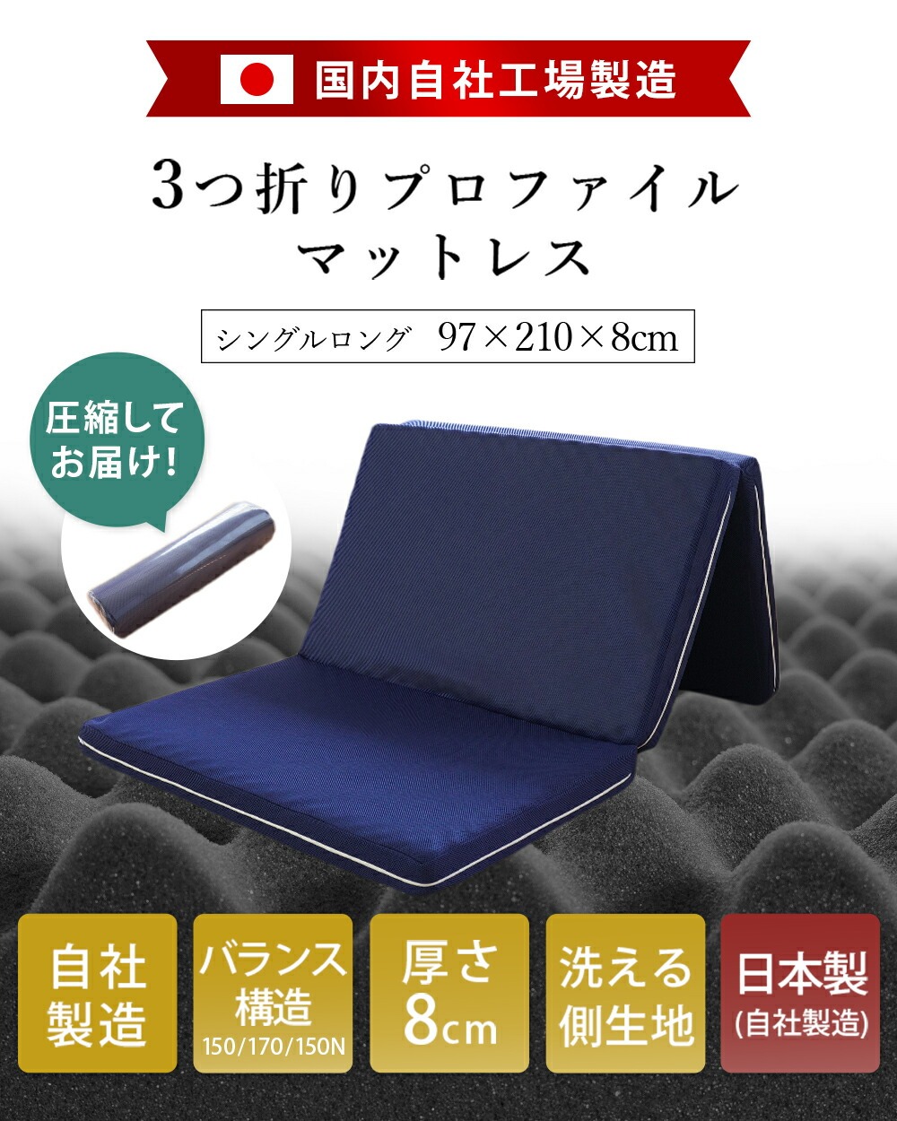 | ・自社製造で安心安全 【日本国産ウレタン使用】品質に定評のある、高品質なウレタンフォームを使用しています。 特に体重のかかる中央部分(腰部)を硬めにしたバランス構造。背中、腰部分の沈み込みが少なく、腰への負担を軽減します。腰痛でお悩みの方にもおすすめです。 ・硬めの高反発ウレタンが寝返りをサポート高い反発力・程よいクッション性で寝返りをサポート。寝返りをすることで血行を促し、身体の負担を軽減するとともに、身体と敷き布団の間にある湿気を発散してくれます。 ・理想的な寝姿勢をキープする形状一つ一つの「点」が優しく全身を支えてくれます。この形状で身体に合わせて体圧分散し、立ち姿に近い理想の寝姿勢をキープします。 ・底付き感のないしっかりとした寝心地床に直接敷いても底付き感がなく、しっかりとしたクッション性のある寝心地です。 側生地はサラッとした肌触りで通気性が抜群のメッシュ素材を使用しています。側面にはファスナーが付いているため、外して丸洗いが可能です。 折りたたみ簡単な三つ折りタイプ。使わないときは立てかけて湿気対策ができます。コンパクトに収納できるので来客用にもおすすめです。 ・搬入しやすいロール梱包でお届けマットレスを圧縮することで、スムーズな搬入やコスト削減に。 | |