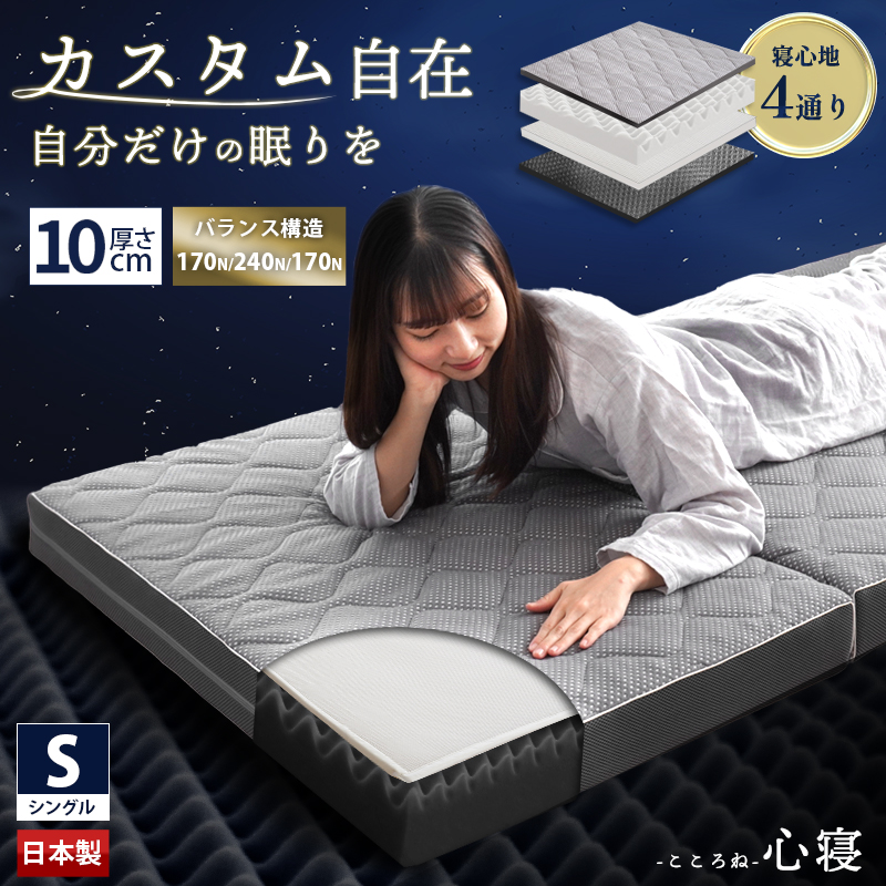 | ・健康は、眠りから。 当社のオリジナルブランド Sleep Medicalは、健康で素敵な毎日を眠りで サポートすることを目指します。 あなたの明日が、元気で、健やかで ありますように。 ・国内自社工場で製造ウレタンカットから商品化まで全て自社工場で行っています。品質に定評のある高品質な国産ウレタンフォームを使用しています。 ・二層構造が理想の眠りをサポートしっかりとした高反発プロファイルウレタンと弾力性のあるハニカムシートの二層構造。重ねる順番を変えるだけで違った寝心地が楽しめます。 ・硬めの高反発ウレタンが寝返りをサポート高い反発力・程よいクッション性で寝返りをサポート。寝返りをすることで血行を促し、身体の負担を軽減するとともに、身体と敷き布団の間にある湿気を発散してくれます。ハニカムシート入りのため通気性にも優れています。 ・理想的な寝姿勢をキープする形状一つ一つの「点」が優しく全身を支えてくれます。この形状で身体に合わせて体圧分散し、立ち姿に近い理想の寝姿勢をキープします。 ・底付き感のないしっかりとした寝心地床に直接敷いても底付き感がなく、しっかりとしたクッション性のある寝心地です。 表面は中綿入りニット生地のため、柔らかな触り心地でプロファイルウレタンの凸凹感を軽減します。裏面、側面には通気性の良いメッシュ生地を使用しています。 折りたたみ簡単な三つ折りタイプ。使わないときは立てかけて湿気対策ができます。コンパクトに収納できるので来客用にもおすすめです。 | |