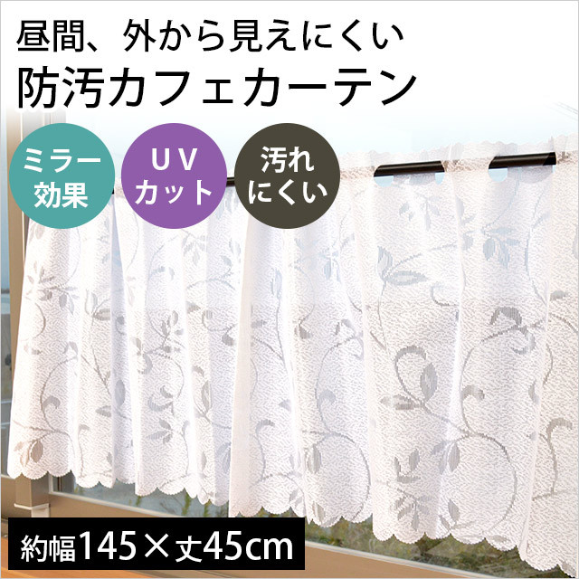 | 【防汚加工】 防汚加工を施しているので、汚れにくく、汚れが付着しても落ちやすいカフェカーテンです。汚れを気にせず使えるので、使用場所が広がります♪ |