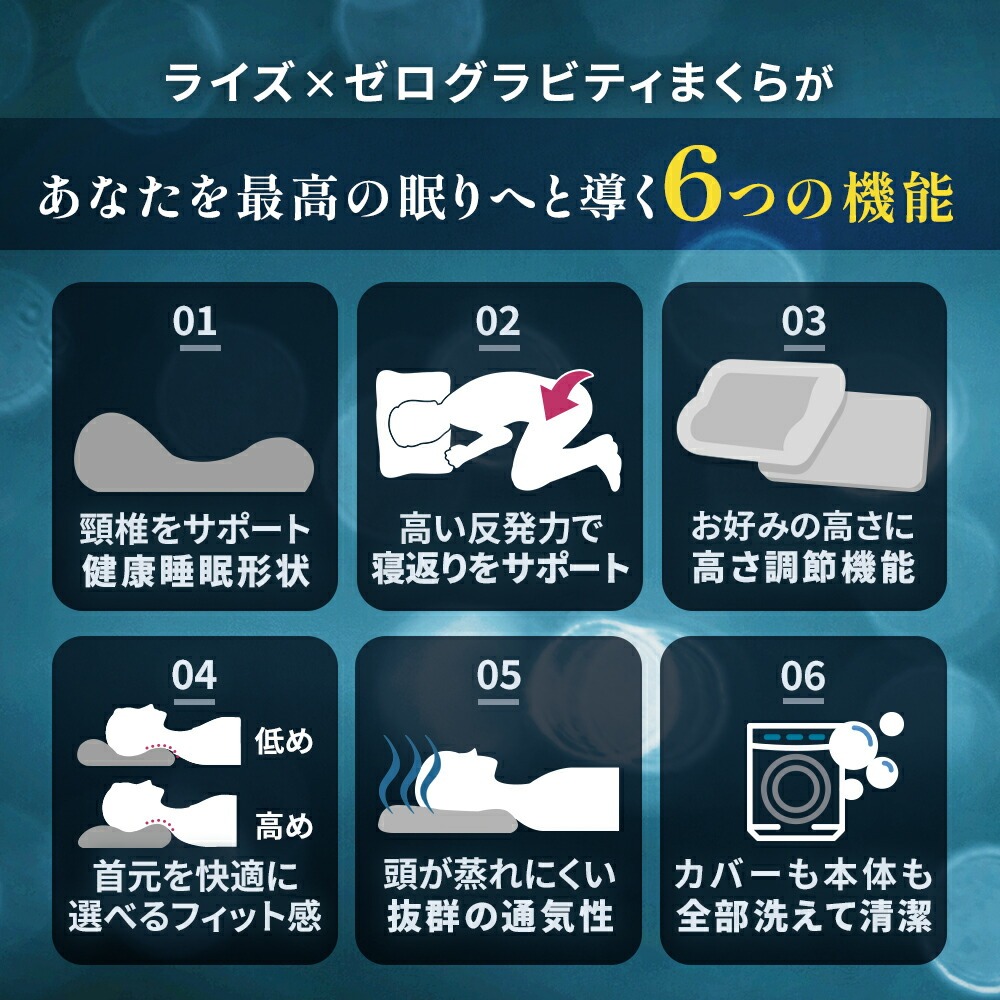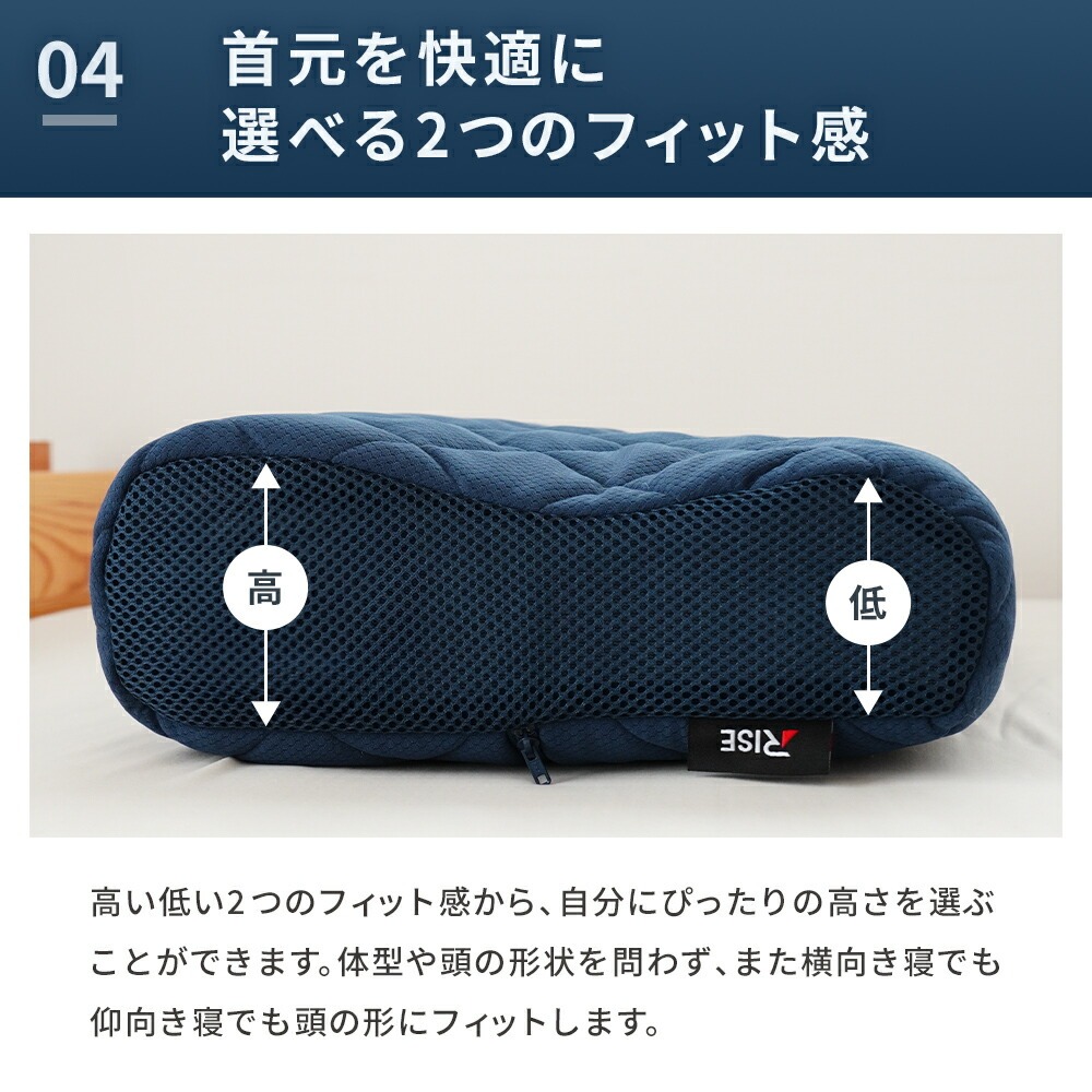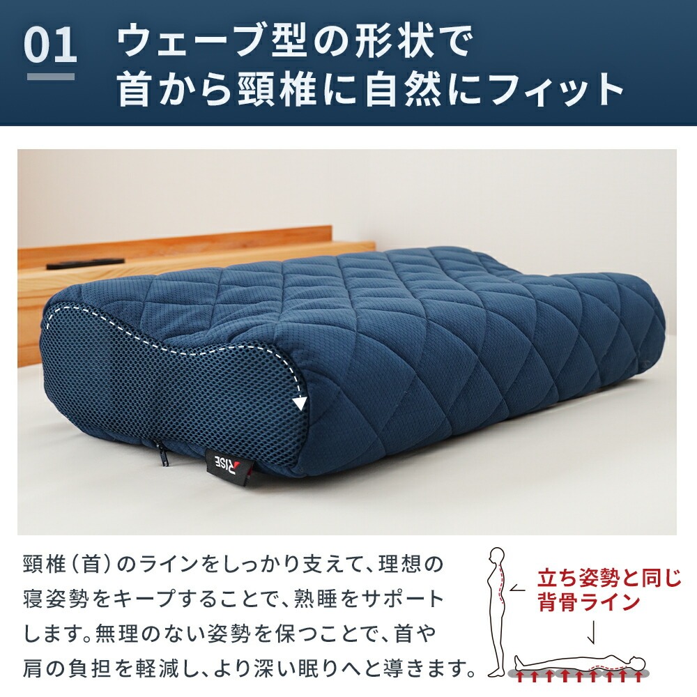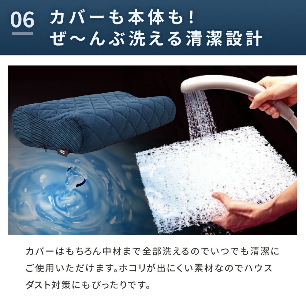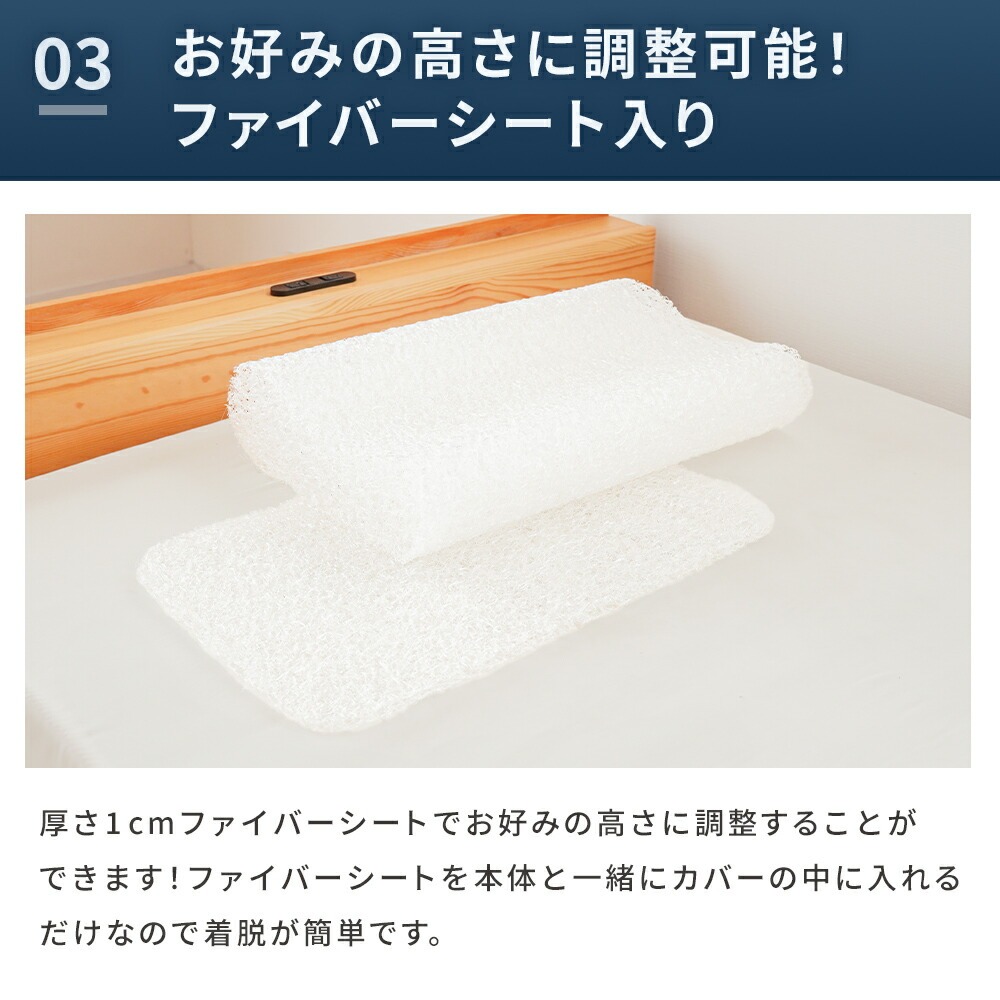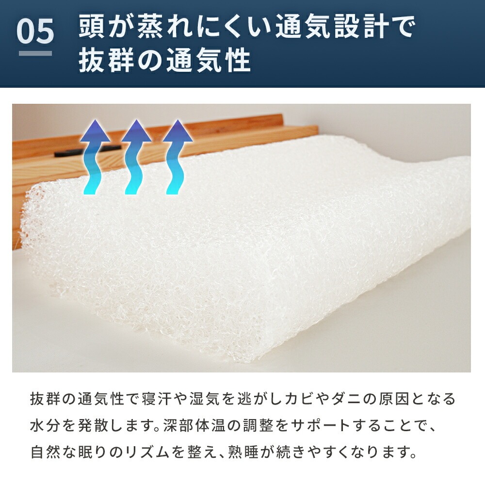 | ・ウェーブ型の形状で首から頸椎に自然にフィット 頸椎(首)のラインをしっかり支えて、理想の寝姿勢をキープすることで、熟睡をサポートします。無理のない姿勢を保つことで、首や肩の負担を軽減し、より深い眠りへと導きます。 ・高い反発力で寝返りがしやすく、中途覚醒を防ぎ、熟睡が続く高い反発力が沈み込みを防ぎ、首や肩を自然な位置にキープ。寝返りもスムーズにサポートし、快適な姿勢でぐっすり眠れます。体への負担を軽減しながら、快適で深い眠りへと導きます。 ・お好みの高さに調整可能!ファイバーシート入り厚さ1cmファイバーシートでお好みの高さに調整することができます!ファイバーシートを本体と一緒にカバーの中に入れるだけなので着脱が簡単です。 ・首元を快適に、選べる2つのフィット感高い低い2つのフィット感から、自分にぴったりの高さを選ぶことができます。体型や頭の形状を問わず、また横向き寝でも仰向き寝でも頭の形にフィットします。 ・頭が蒸れにくい通気設計で抜群の通気性抜群の通気性で寝汗や湿気を逃がしカビやダニの原因となる水分を発散します。深部体温の調整をサポートすることで、自然な眠りのリズムを整え、熟睡が続きやすくなります。 ・カバーも本体も!ぜ〜んぶ洗える清潔設計カバーはもちろん中材まで全部洗えるのでいつでも清潔にご使用いただけます。ホコリが出にくい素材なのでハウスダスト対策にもぴったりです。 ・通気性と清潔にこだわったメッシュ素材のカバー湿気がこもらずサラッと快適! | |