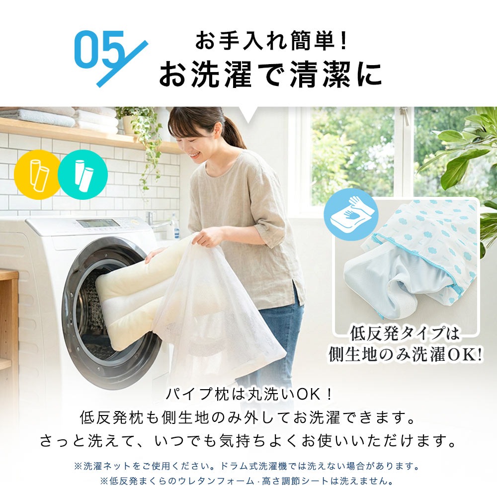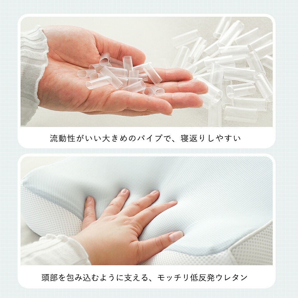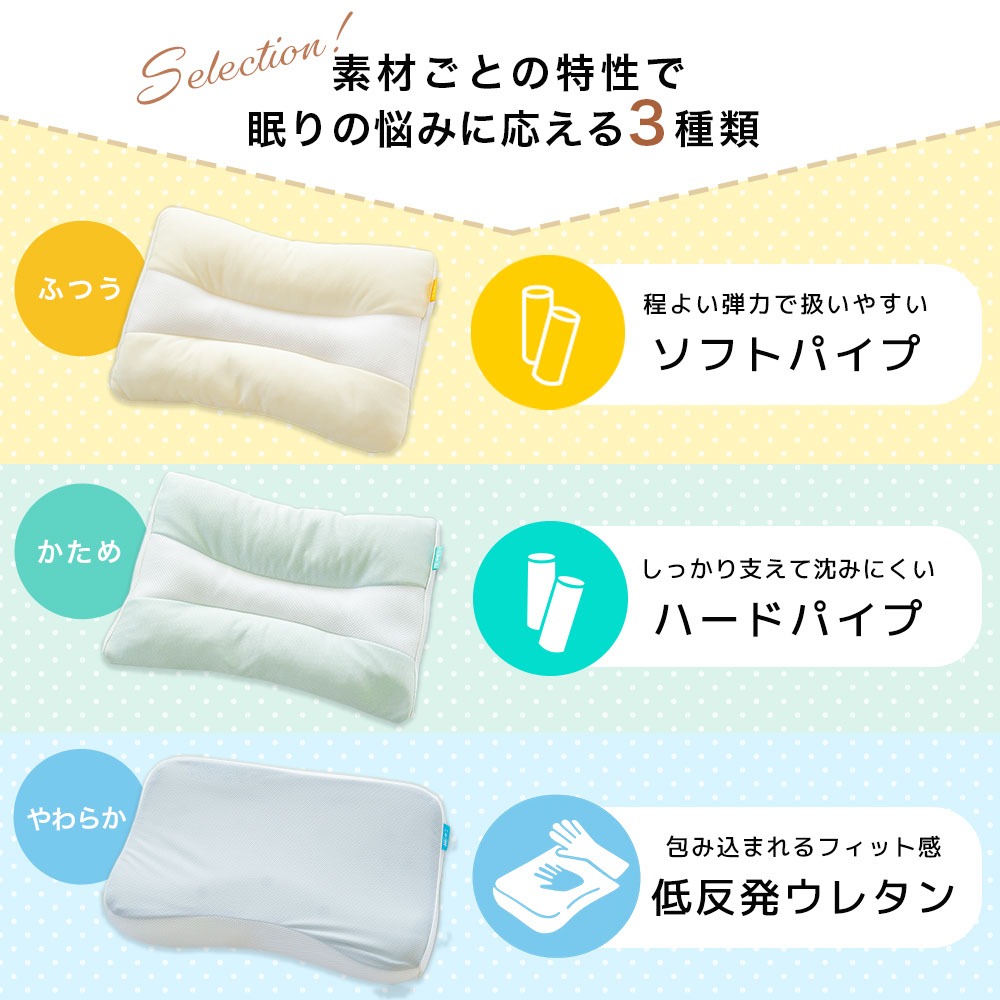 | ・さらに中材やシートの出し入れで “自分好みの高さ”にカスタム! ソフト/ハードパイプまくらは、パイプの出し入れで高さの微調整OK。 頭部を安定させながら首と肩を支え、収まりやすいくぼみ形状で頭にフィット。理想的な寝姿勢をキープします。 ・首・頭をしっかり支える 立体マチ構造全タイプが立体構造で横向き寝でも崩れにくい。首の角度が安定しやすく、楽な寝姿勢をサポートします。 ・お手入れ簡単!お洗濯で清潔にパイプ枕は丸洗いOK!低反発枕も側生地のみ外してお洗濯できます。さっと洗えて、いつでも気持ちよくお使いいただけます。 個人の睡眠に寄り添い、最適な寝具を提供する寝具の老舗メーカー・西川による徹底した品質基準で丁寧に仕上げた枕です。 | |