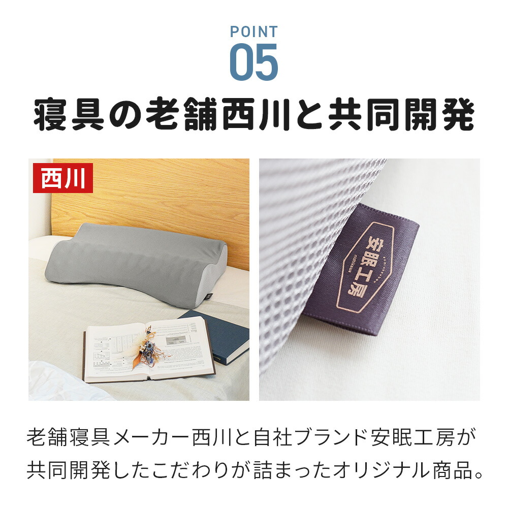 | ・点で支えて圧力を分散 点で支えることによって、頭部と首筋にかかる圧力を分散させ、負担を和らげます。 ・もっちり低反発ウレタン柔らかく、頭の形にフィットする低反発タイプ。凹凸により頭が沈みすぎない、程よい柔らかさです。 ・肩口アーチ形状で寝返りサポートアーチ形状で首や肩口のラインに自然にフィットします。フィットしているので寝返りの抵抗も少なく、スムーズな寝返りをサポートします。 ・メッシュ生地で高い通気性両サイドに通気性の良いメッシュ生地を使用しており、蒸れにくく快適です。 ・高さ調節シートで調節可能厚み約1.5cmの高さ調節シートが1枚入っているため、シートを出し入れするだけで簡単に高さ調節ができます。 ・安心の品質 西川製品品質にもこだわりたいという方も安心。日本有数の寝具メーカー「西川」の製品です。長年寝具を作ってきたからこその信頼できる品質があります。 | |