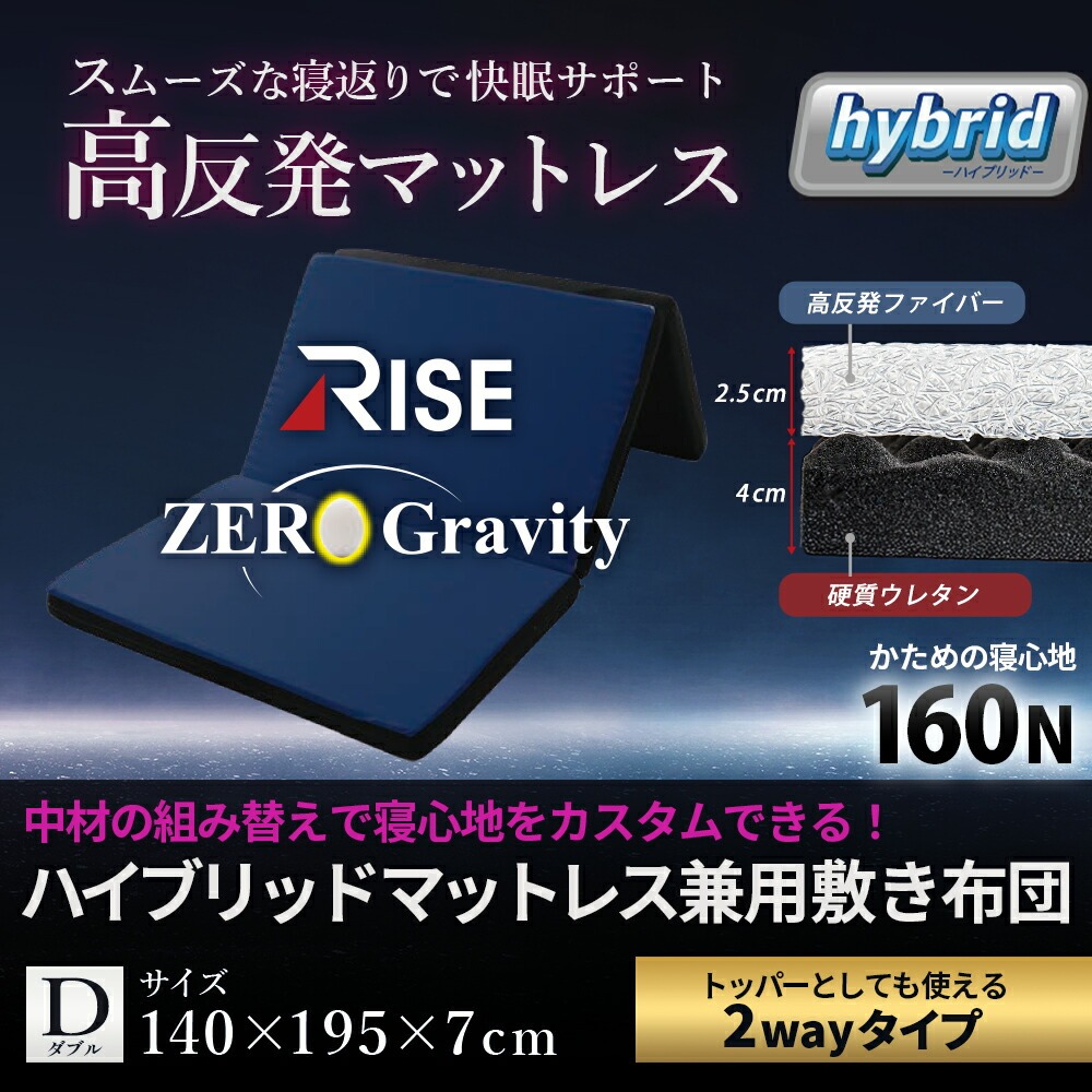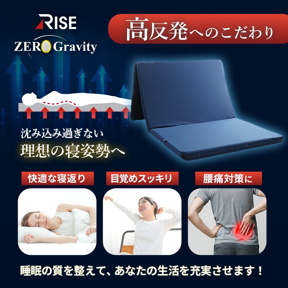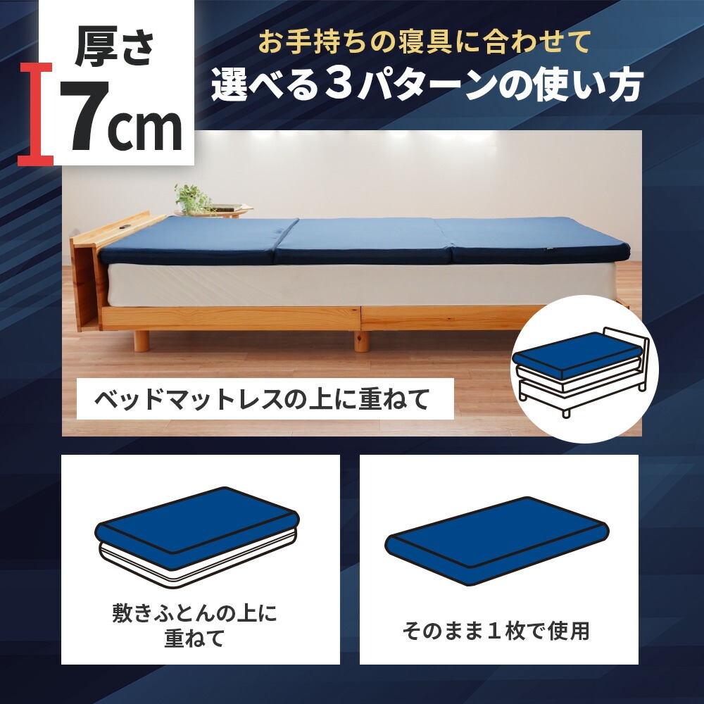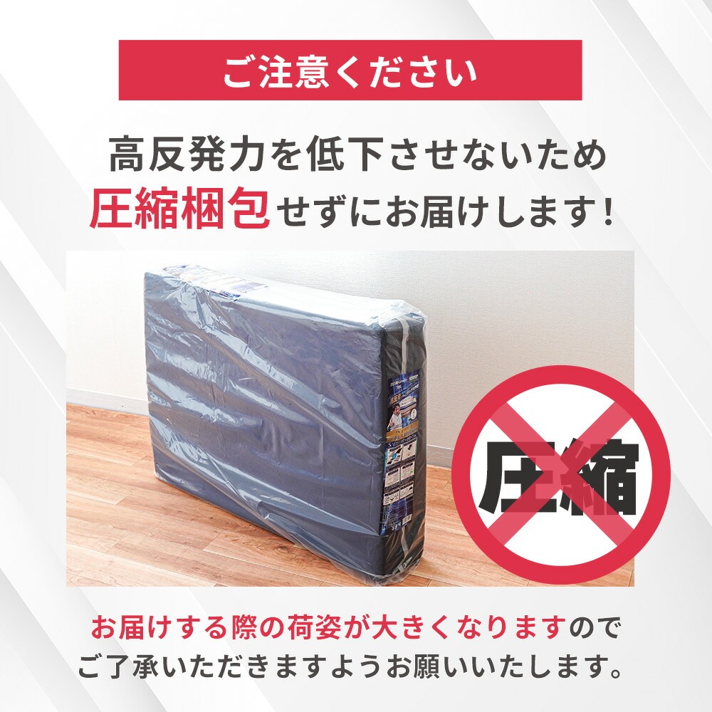 | ・高い反発性と弾力性で寝返り促進 “寝返り”には、血流促進や体温調節、日中の活動で歪んだ背骨を調整する働きがあります。 耐久性・弾力に優れたプロファイルウレタンと、通気性抜群の高反発ポリエチレンファイバーの二層構造。 高い弾力性と押し上げる力により全身の体圧が分散されるため、身体の1か所への負担集中を軽減。 カバーはご家庭の洗濯機で丸洗いOK! 側生地ファスナーの開け締めでウレタンの取り出しが可能。 硬質ウレタンと洗えるファイバーを自由に組み合わせ、自分好みの寝心地に調整できます。 ・三つ折りで取り扱い楽々使わないときは、押入れやクローゼットなどの収納やお部屋のデッドスペースに片付けられます。 | |