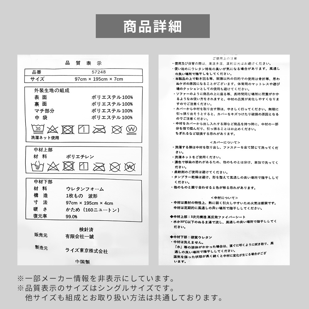 | その他注意 | ■中材のウレタンは洗えません。 |