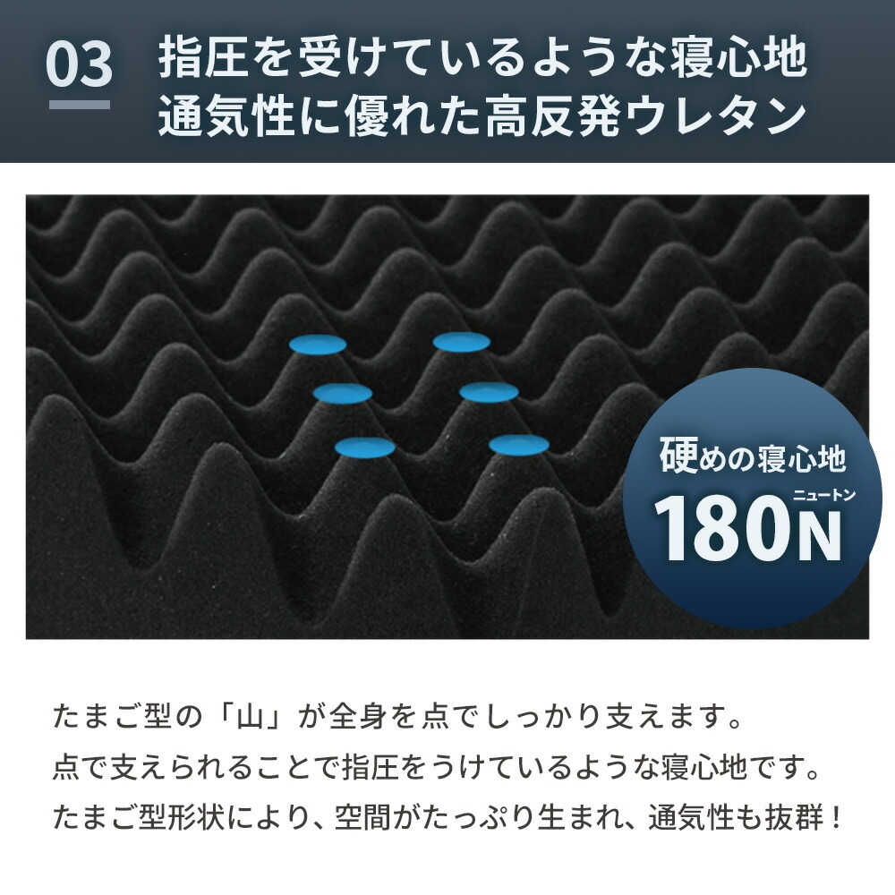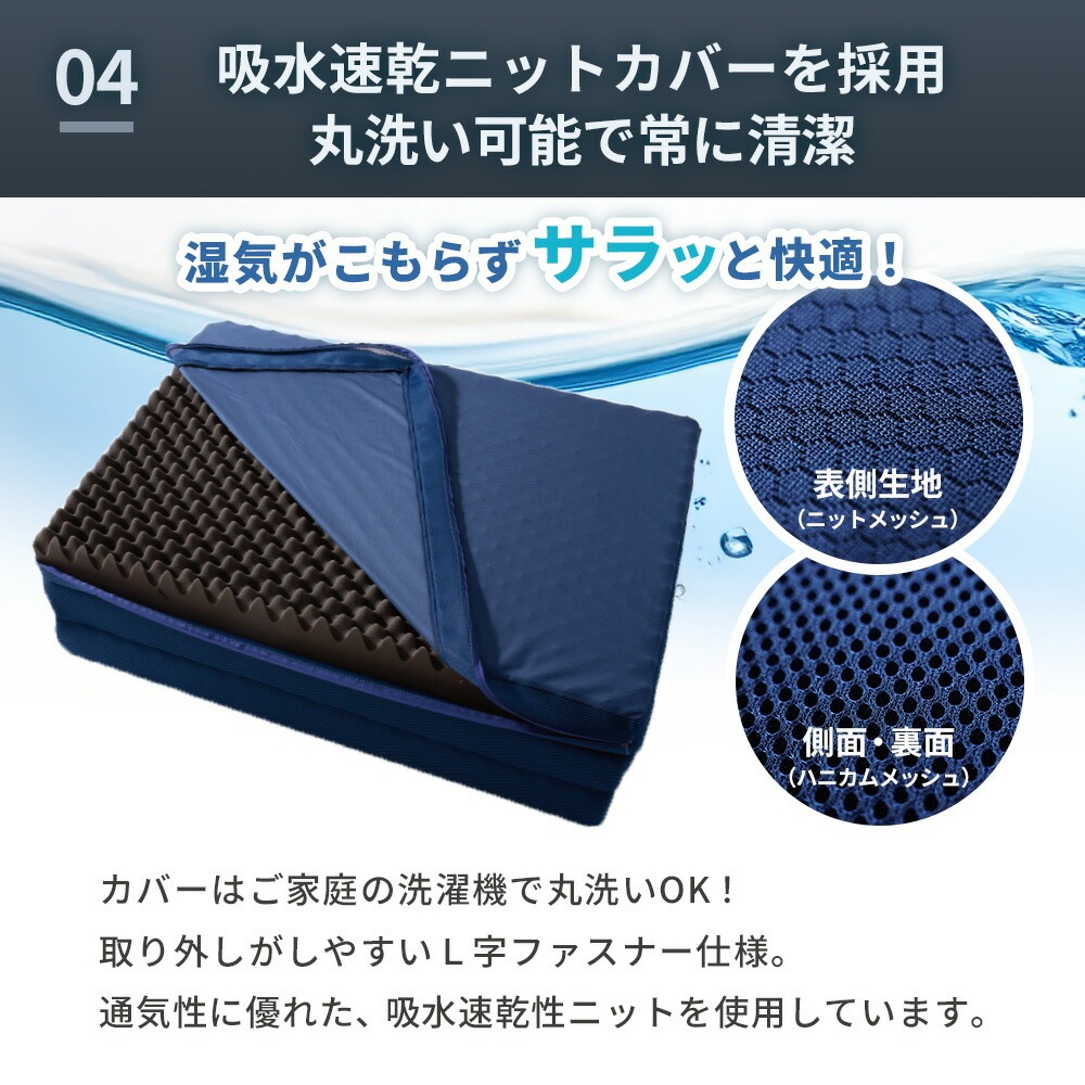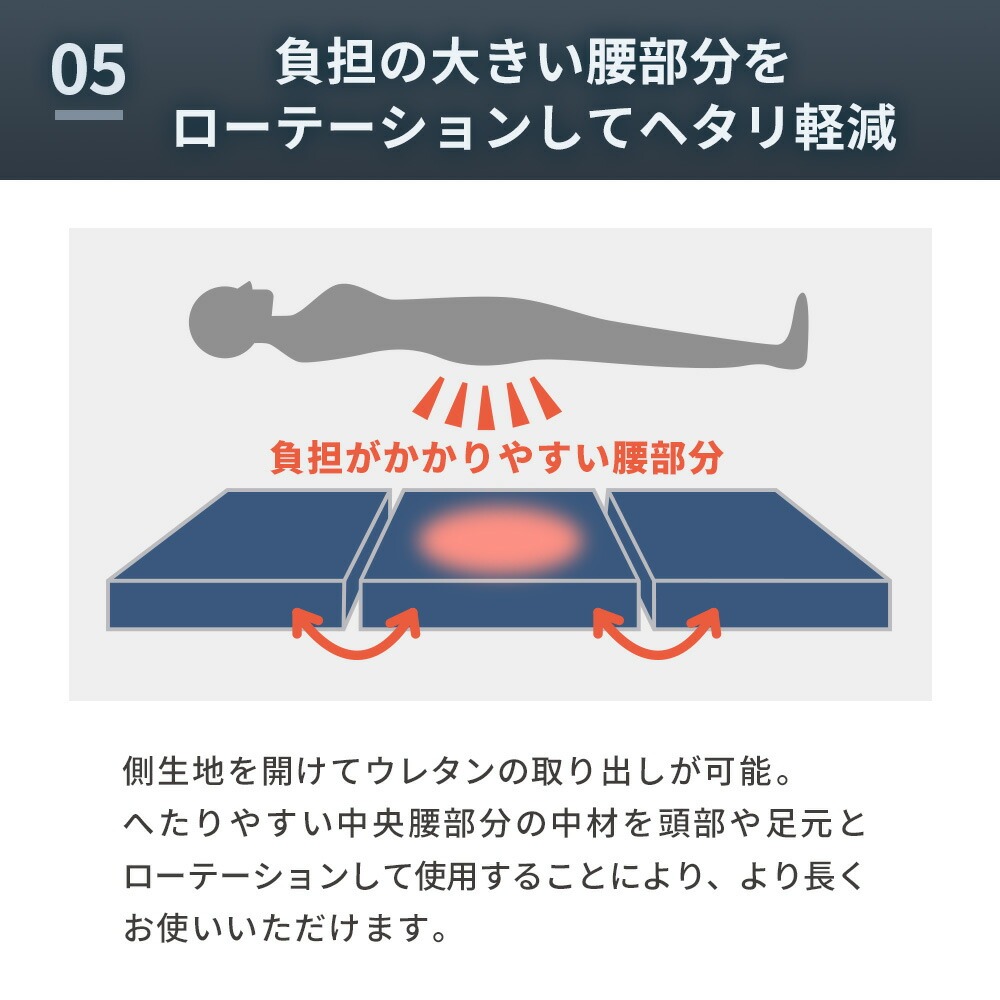 | ・高い反発性と弾力性で寝返り促進 “寝返り”には、血流促進や体温調節、日中の活動で歪んだ背骨を調整する働きがあります。 高い弾力性と押し上げる力により全身の体圧が分散されるため、身体の1か所への負担集中を軽減。 カバーはご家庭の洗濯機で丸洗いOK! 側生地ファスナーの開け締めでウレタンの取り出しが可能。 使わないときは、押入れやクローゼットなどの収納やお部屋のデッドスペースに片付けられます。 | |