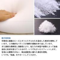中素材に超極小ビーズとポリエステルわたを混合した素材を使用しています。この絶妙なバランスが独特の感触を作り出しています。また適度な柔軟性と流動性により、私たちの体型や姿勢によって自由自在に形状を変えてくれるので、いつでもぴったりフィットします。