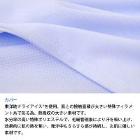 レギュラーポリエステル65%・ポリエステル(ドライアイス糸)35%。東洋紡ドライアイスを使用。肌との接触面積が大きい特殊フィラメント糸である為、熱吸収の大きい素材です。