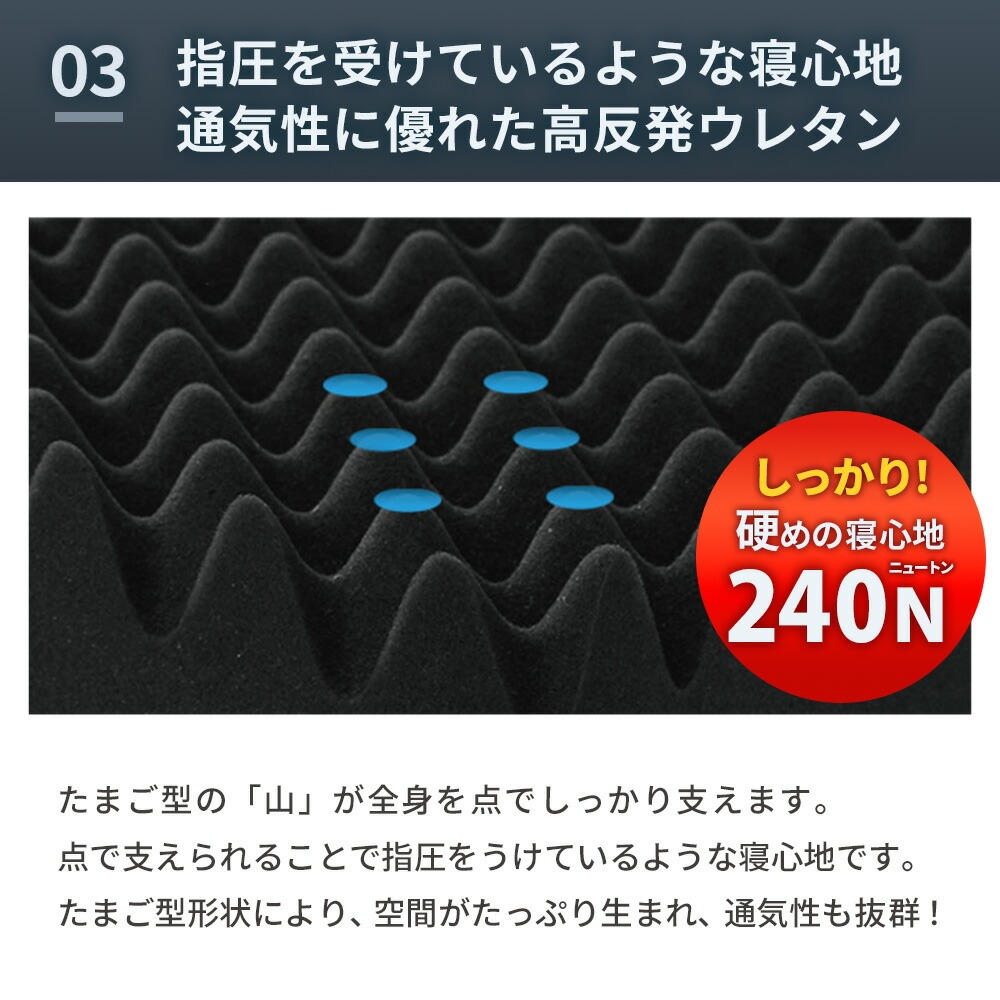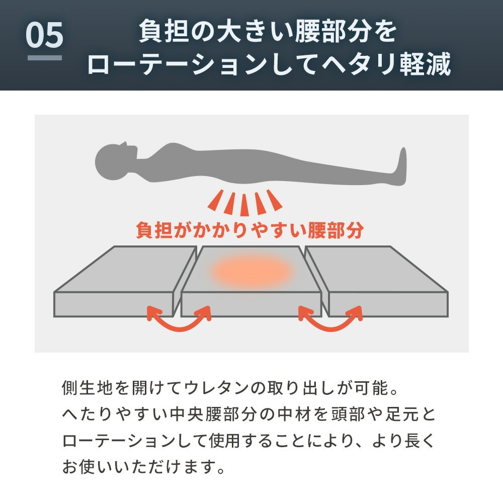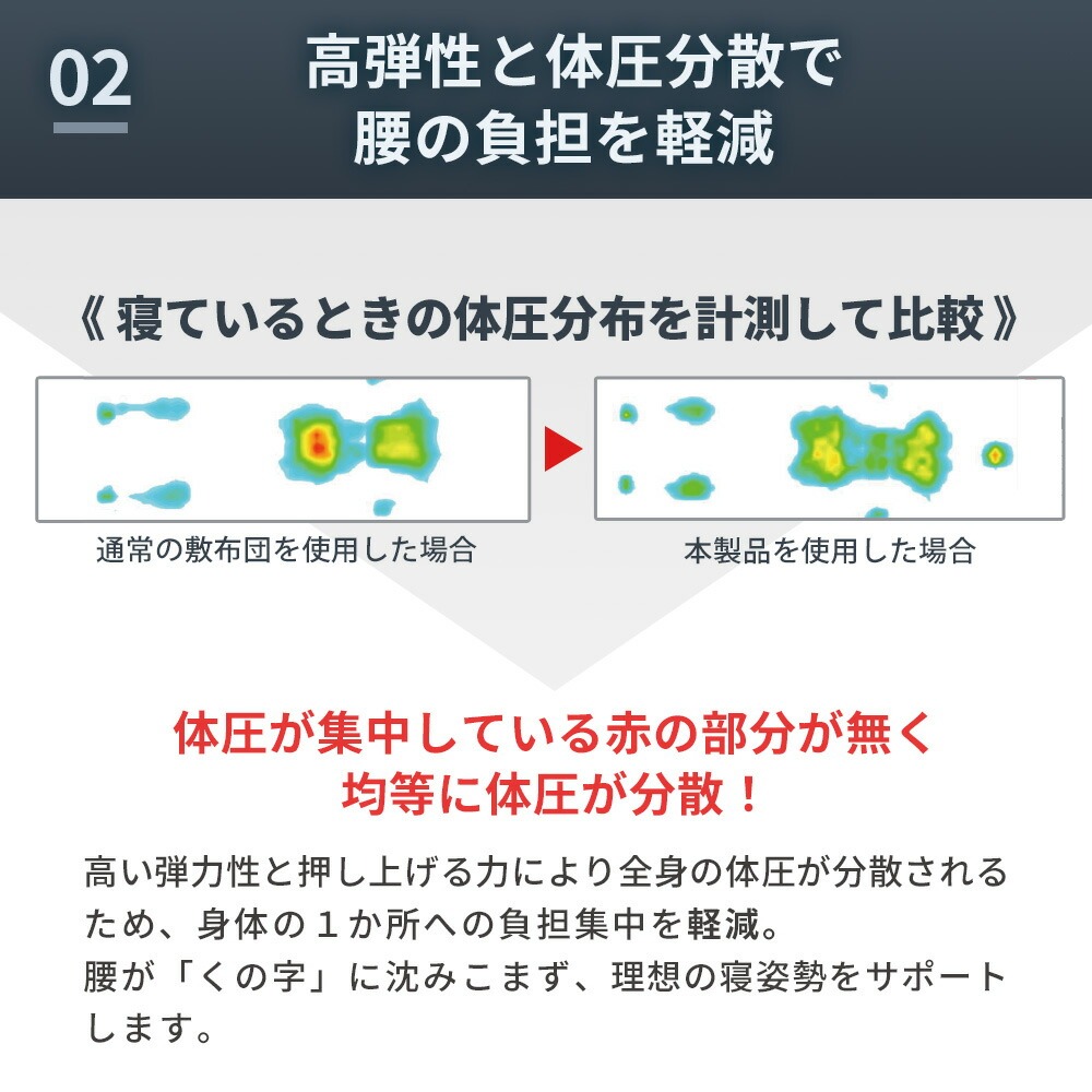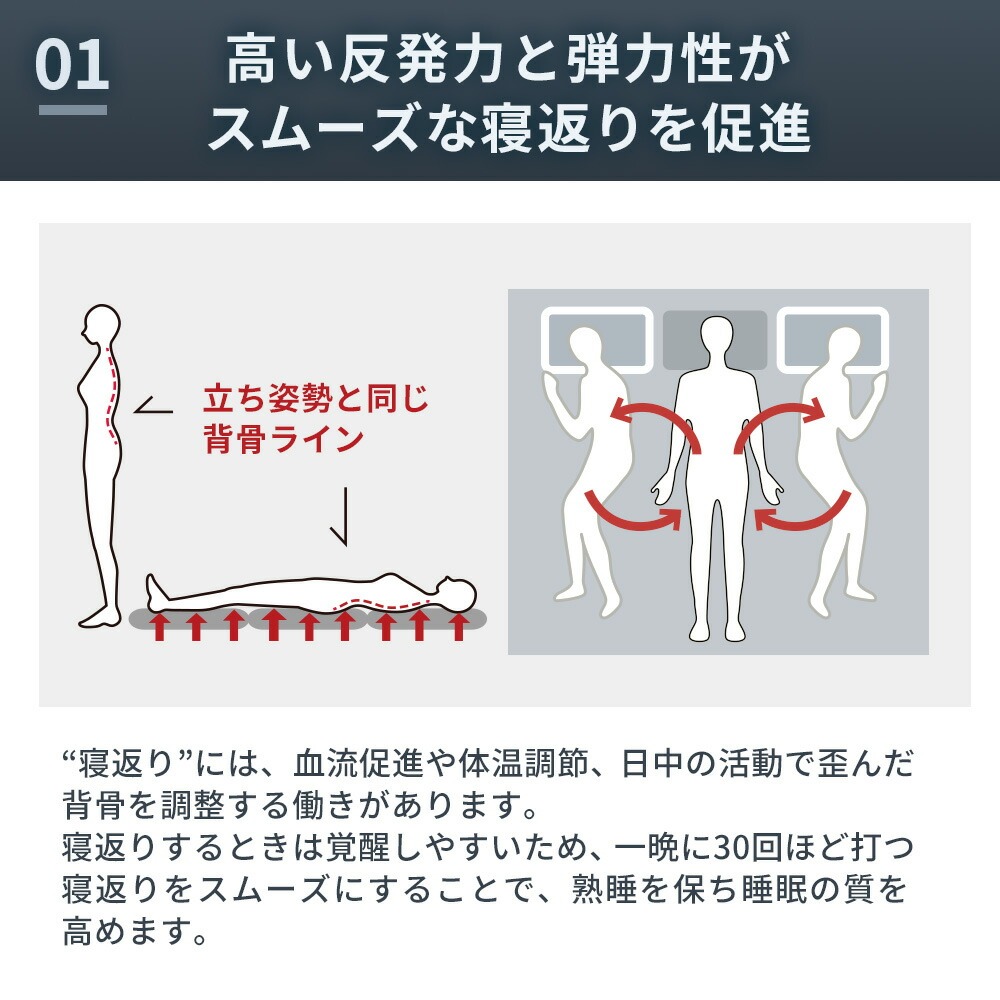 | ・高い反発性と弾力性で寝返り促進 “寝返り”には、血流促進や体温調節、日中の活動で歪んだ背骨を調整する働きがあります。 240 Nクラスは一般的な高反発(140?180 N)よりさらに硬めで、よりフラットな寝心地。 高い弾力性と押し上げる力により全身の体圧が分散されるため、身体の1か所への負担集中を軽減。 カバーはご家庭の洗濯機で丸洗いOK! 側生地ファスナーの開け締めでウレタンの取り出しが可能。 使わないときは、押入れやクローゼットなどの収納やお部屋のデッドスペースに片付けられます。 | |